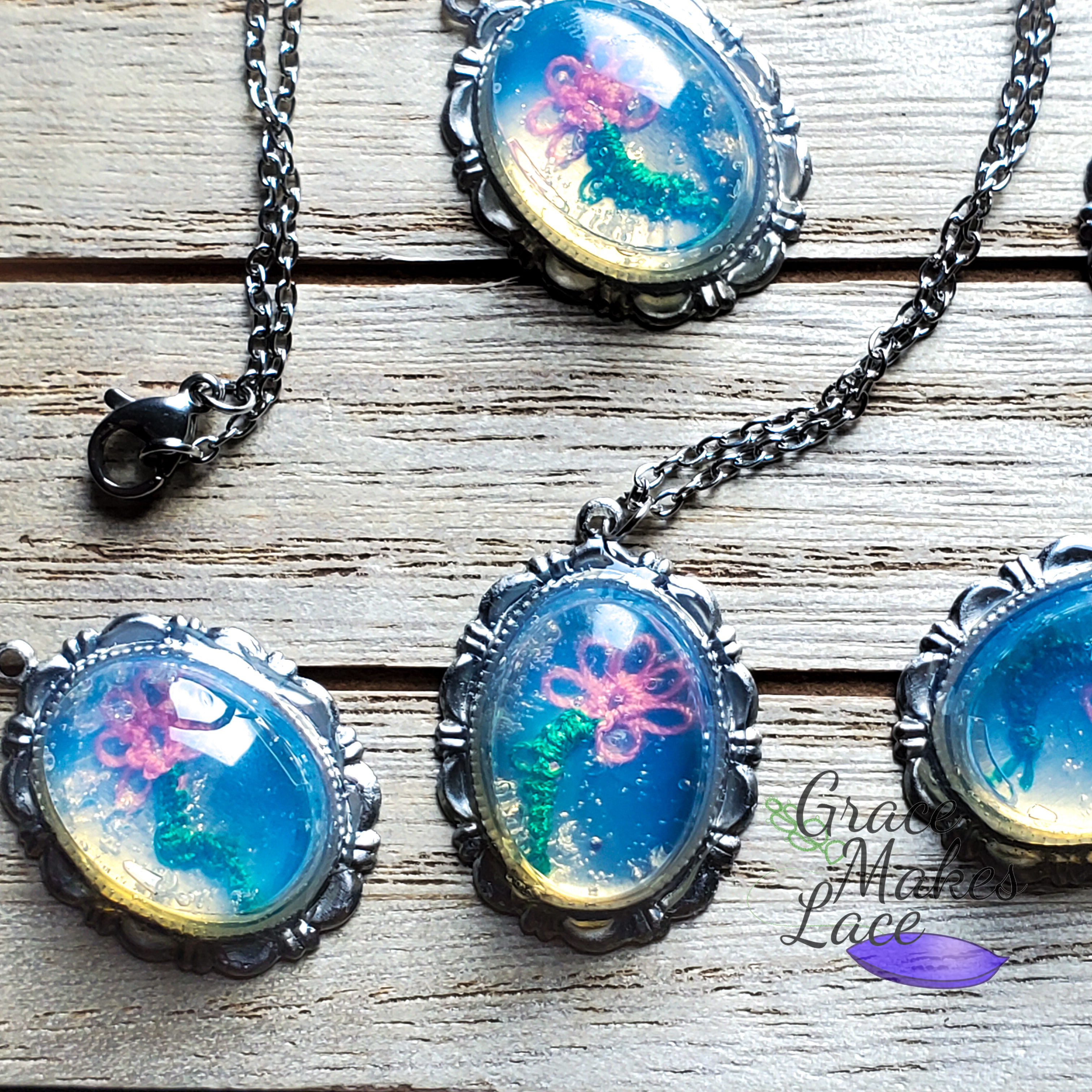 I shuttle-tat the lace flowers, finger tat the stems, and secure them to the stainless back with a dab of resin alternative. Once that's dry, I carefully add more resin alternative and extract any bubbles. I then place the glass over top(which traps air in making bubbles ?) and let it cure. I then affix the charm to a stainless chain with a stainless jump ring.