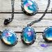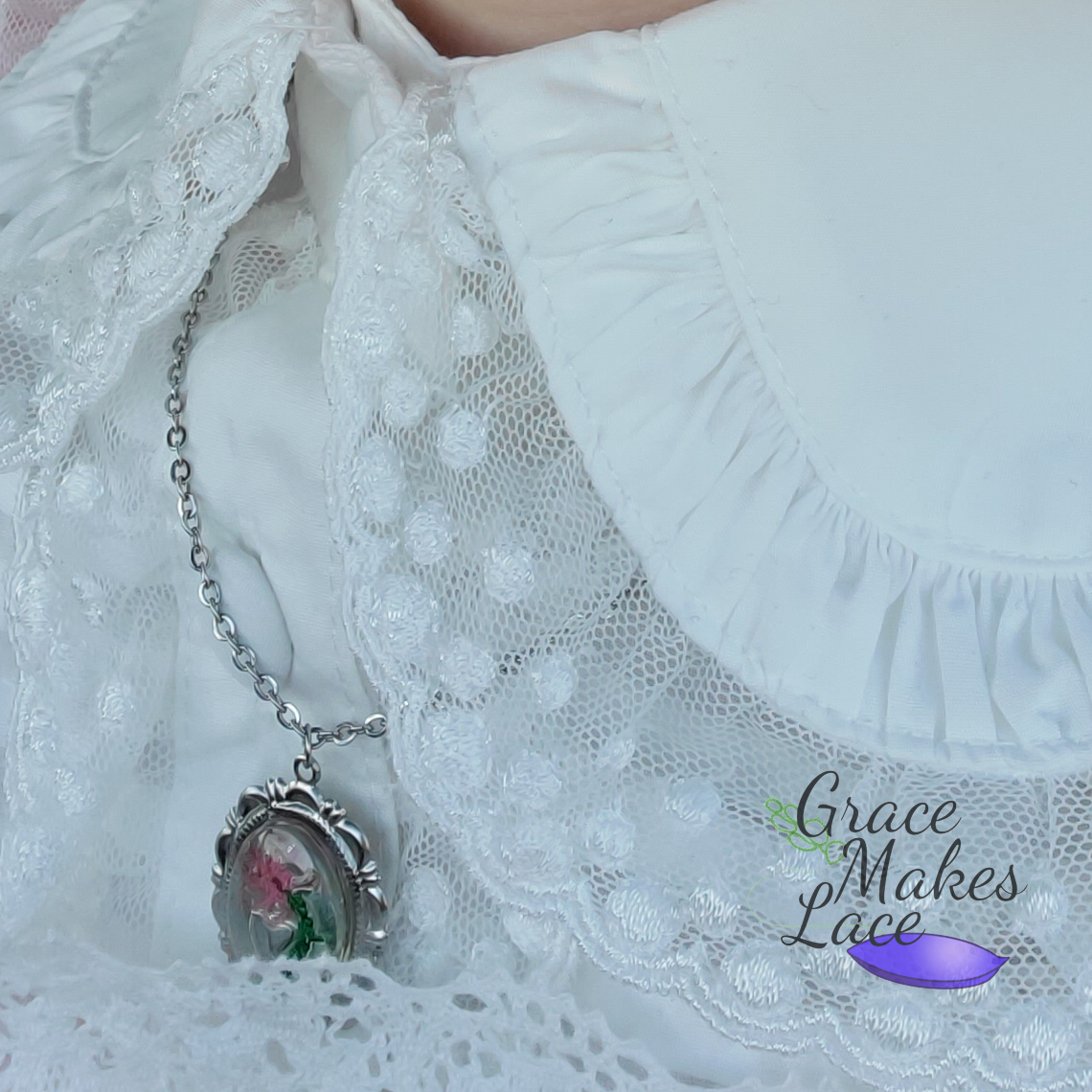 These handmade necklaces are made from stainless steel cabochon backs, stainless steel chain, glass cabochon toppers, hand tatted lace flower, and a resin alternative.