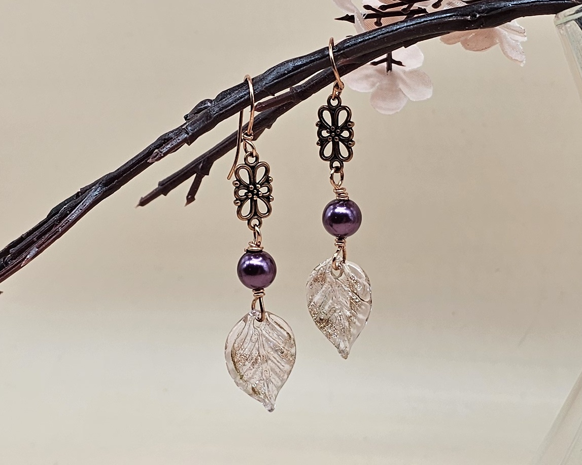 Also included are glass pearls in soft plum and detailed copper floral connectors. Together these elements create a vintage-botanical vibe. At 2.5 inches long, they shimmer as they move and attract the eye without being heavy.