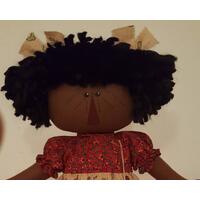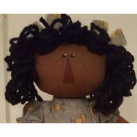 This sweet little girl is made from 100% cotton fabric, stuffed with Poly-fil Premium hypo-allergenic polyester fiber fill. Her clothing is 100% cotton fabric, her face and shoes are hand painted, and her shoes have string ties. She wears slouch socks, and her grungy tag reads, "MOMMY'S LITTLE PRINCESS". She wears a blue print dress, and her hair is hand stitched to her head and adorned with bows that match her dress. She wears a silver heart pendant that reads "Made With Love". She would make a thoughtful gift for a special person or a wonderful addition to your prim or country home. Choice of skin and hair colors.