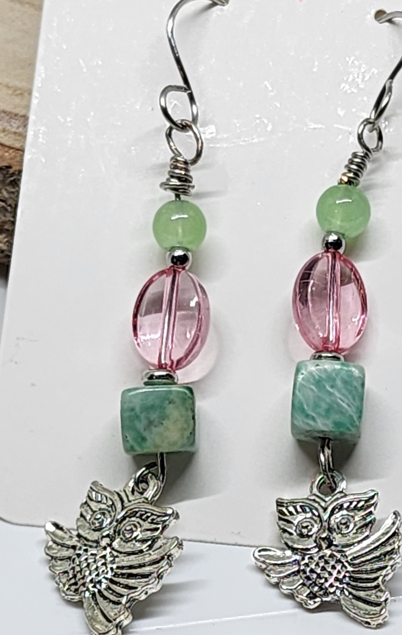 Each pair features a beautifully detailed silver-tone owl charm paired with a soothing mix of soft green and blush pink beads, creating a gentle balance of earthy and whimsical tones. Lightweight and comfortable, these earrings are perfect for everyday wear while still making a unique statement.