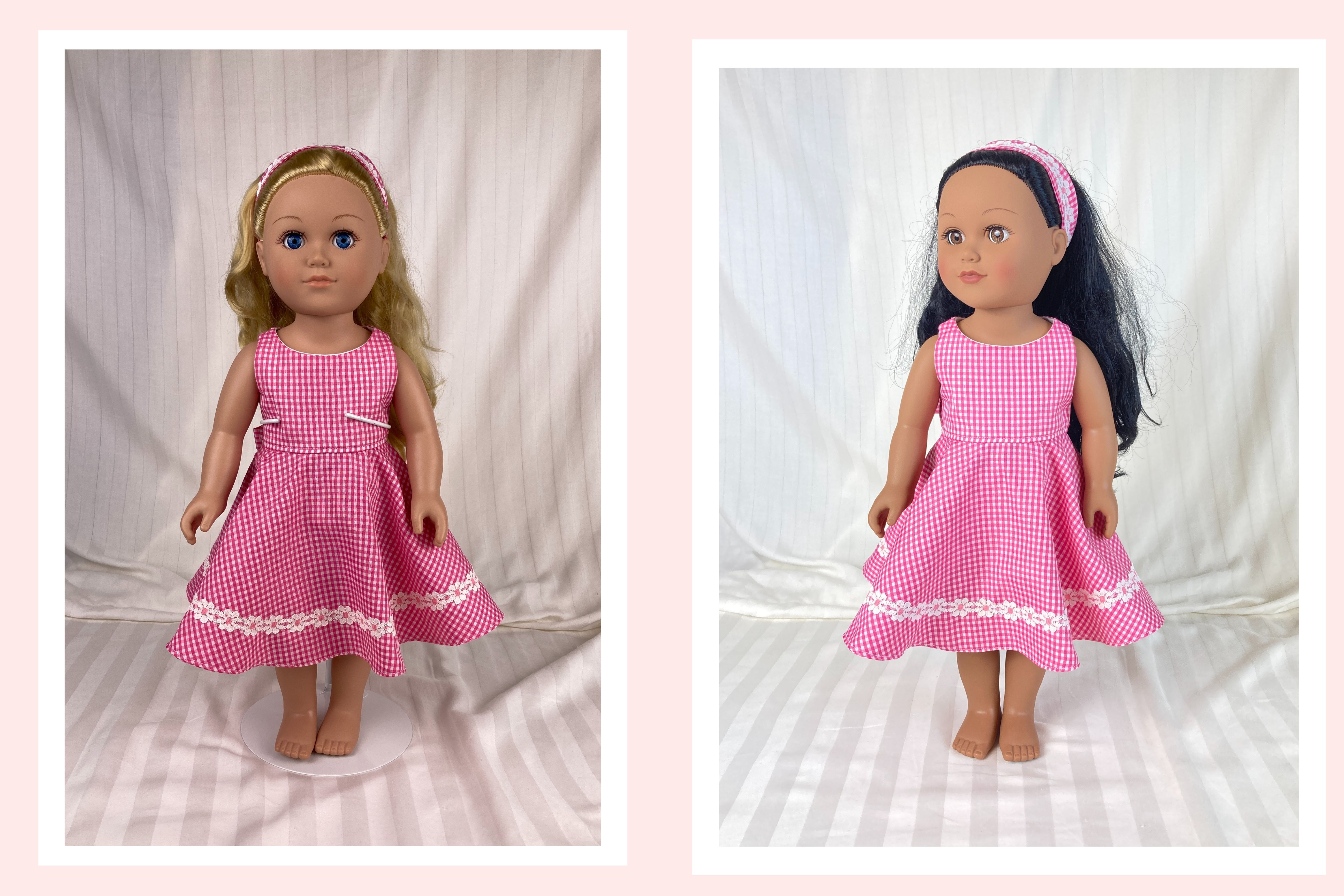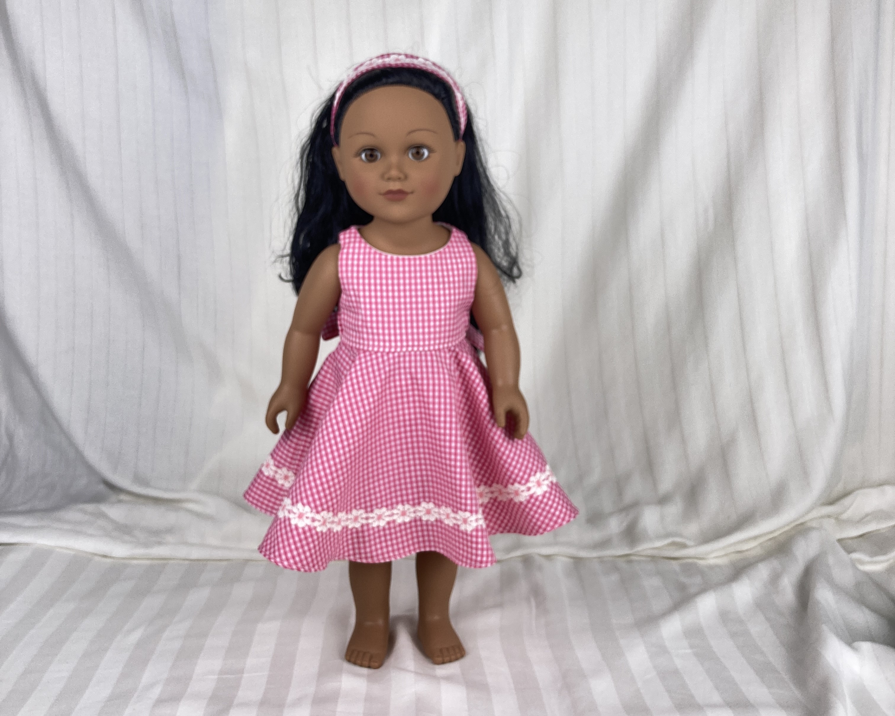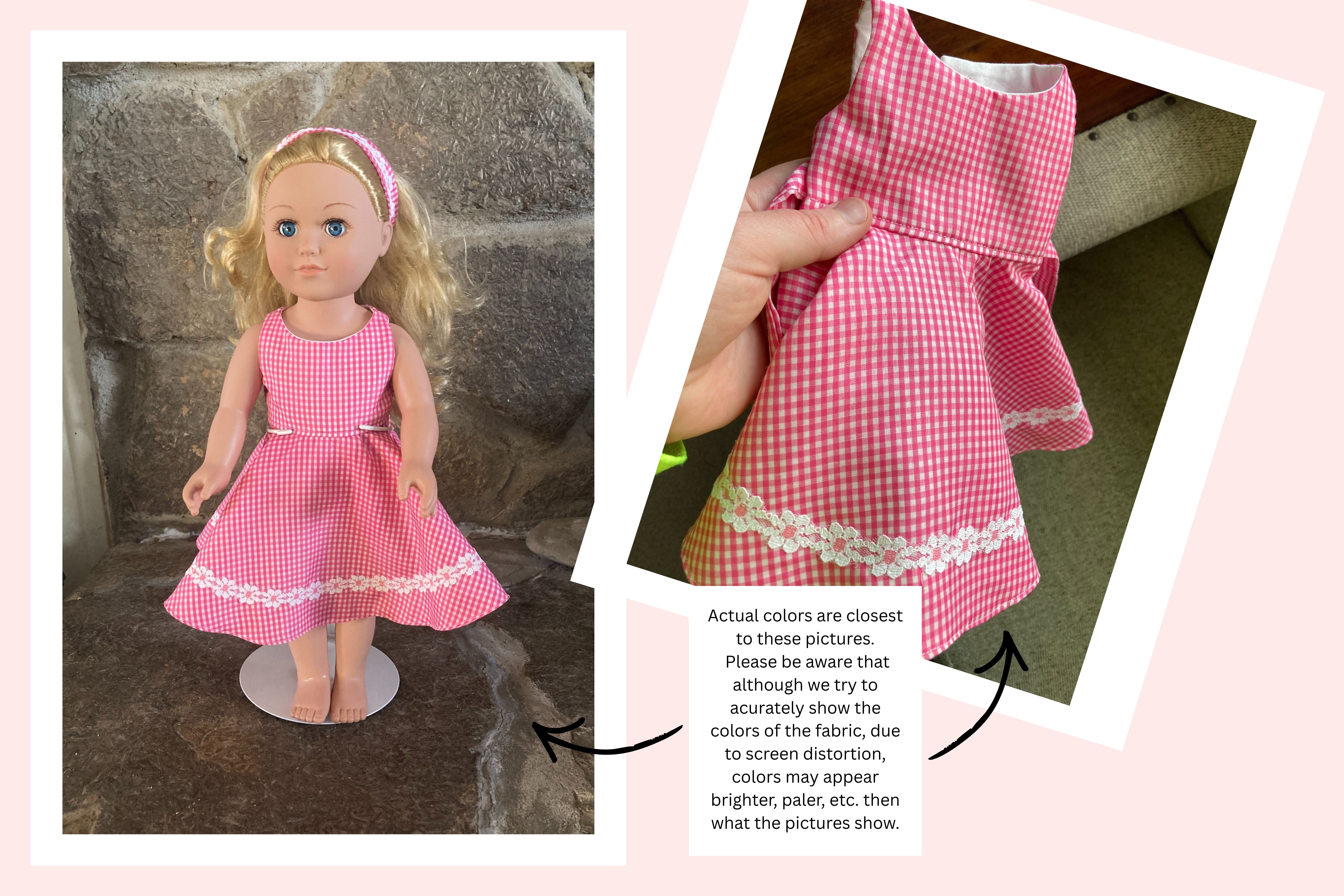 All our doll dresses are handmade by us using quality materials, and old fashioned industry, labor, skill and a passionate vision! ALL our 18 doll clothes have lined bodices unless specified and ALL our 18 doll clothes have finished seams either by multiple zigzagging or by enclosure; depending on the fabric and dress style, the skirts of our doll dresses are also often lined or have an attached petticoat (see individual listings). We strive to create 18 inch doll clothes that are realistic and cute/beautiful- clothes that last longer than fast fashion- clothes that maybe can even be handed down to future generations. A Yankee Doodle Darlings 18 inch doll dress is designed to fit well yet be easy to put on and take off. We try to sewn on all the little details such as buttons, beads, and trims for durability but at times must use a durable glue (see individual listings). Closures are hook and loop unless otherwise stated in listing.
