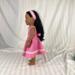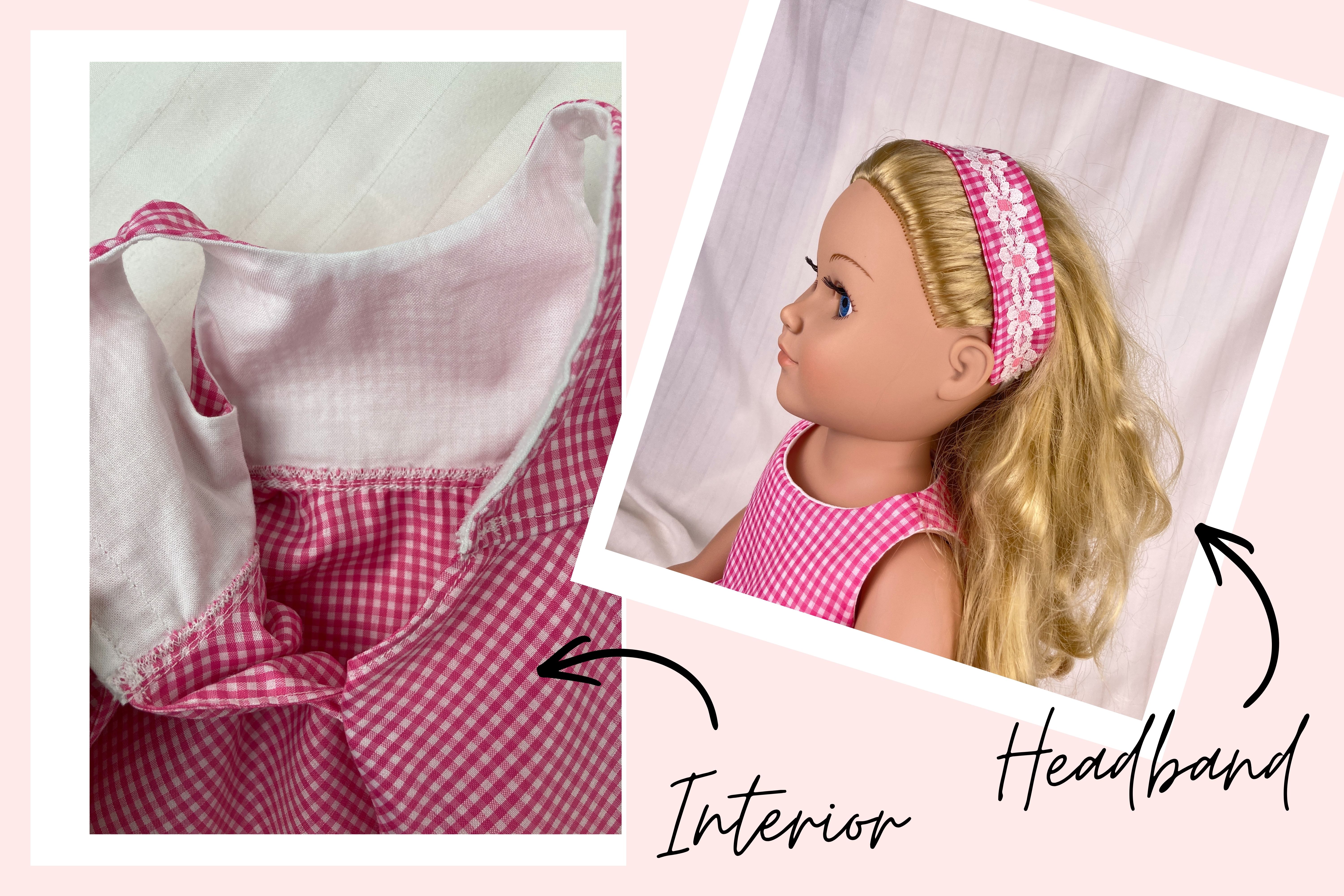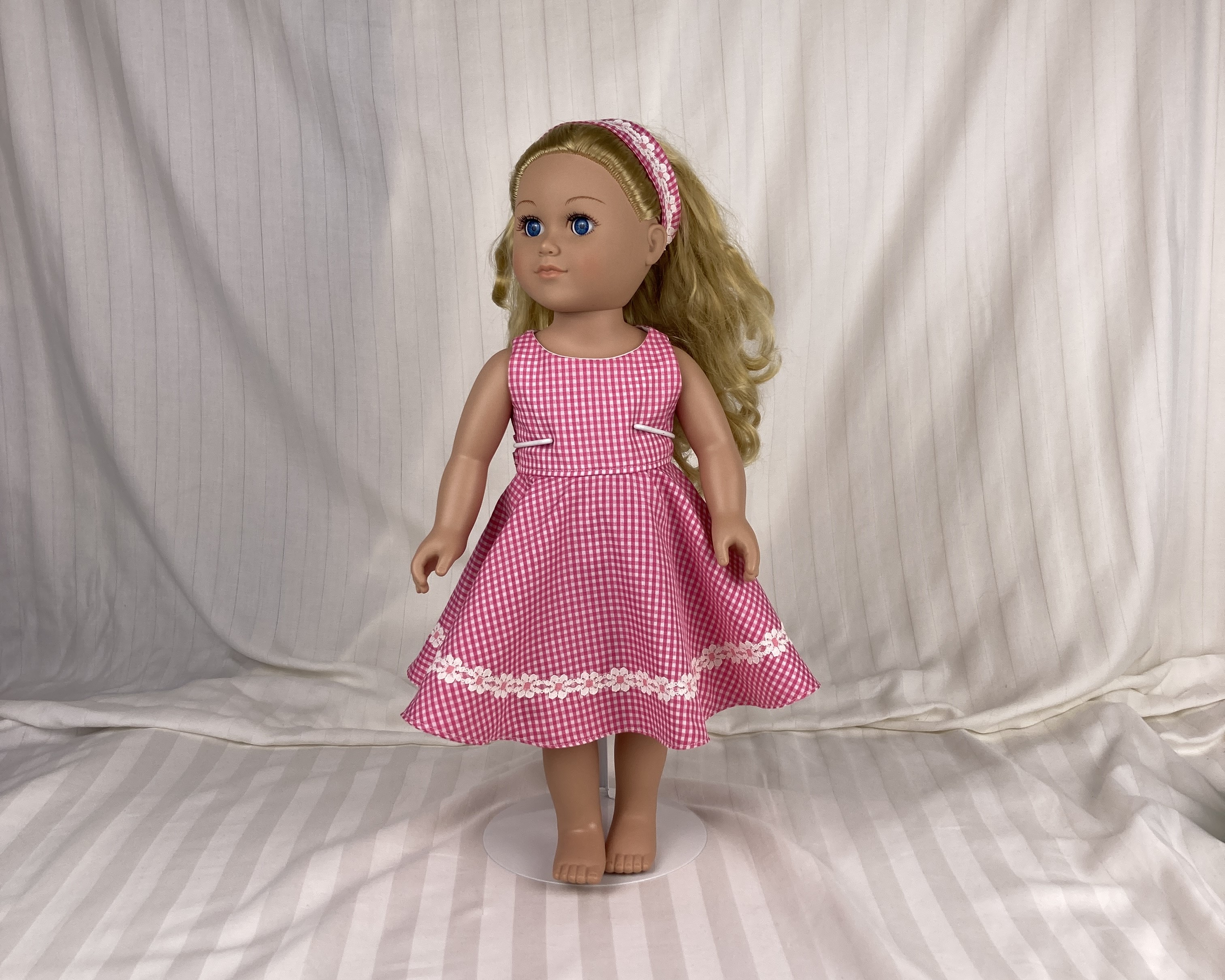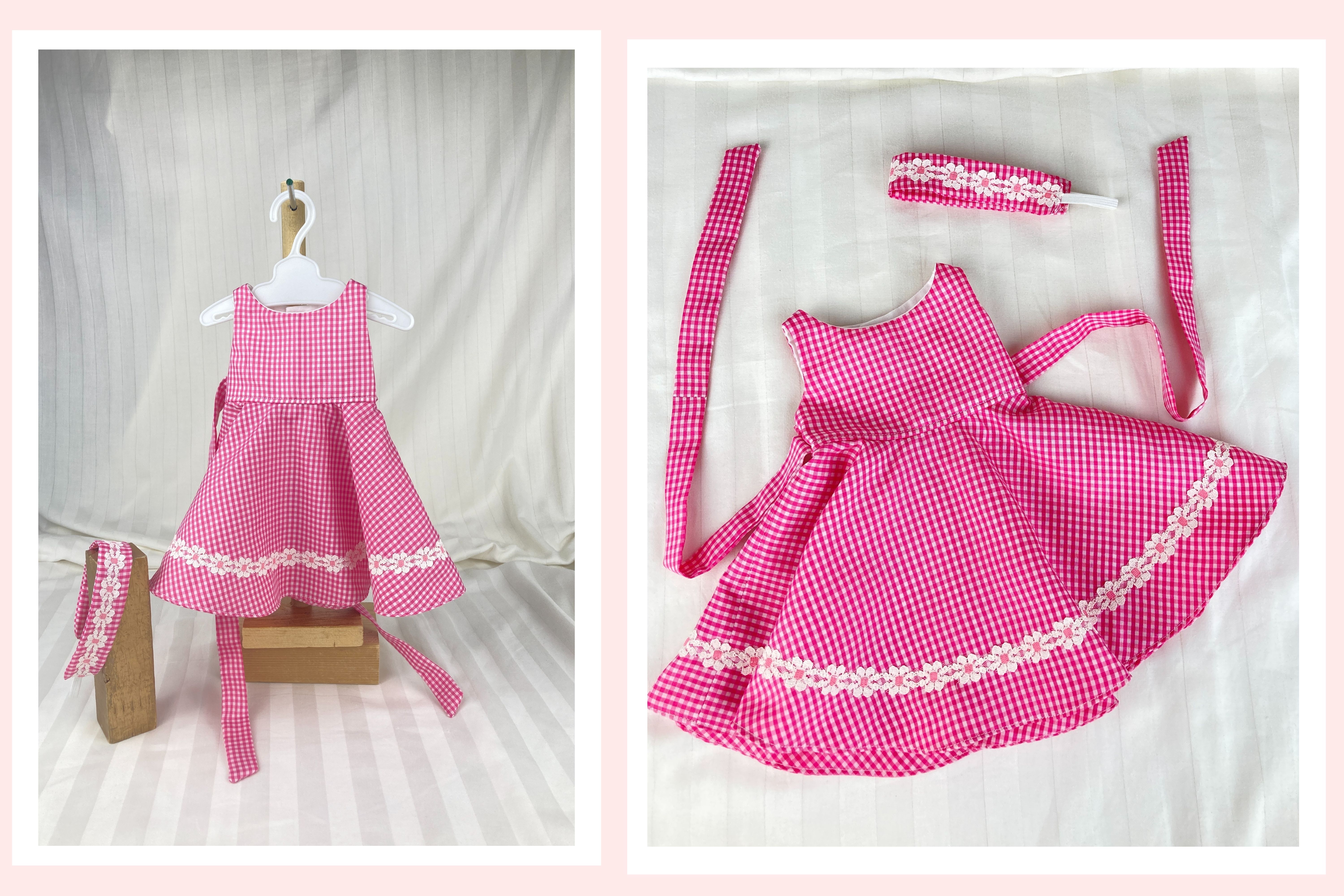 This delightful pink gingham sundress is the perfect choice for summer picnics and vacations! Made from a polyester blend fabric that is the color of a ripe watermelon, this dress has a lined sleeveless bodice with round neckline as well as a lined circle skirt that falls to the mid-calf. A simple dress, the only accents are the pink daisy trim above the hemline and the attached bodice sash for the back. Dress has a hook and loop back closure. The headband matches the dress and also has matching daisy trim.
