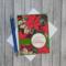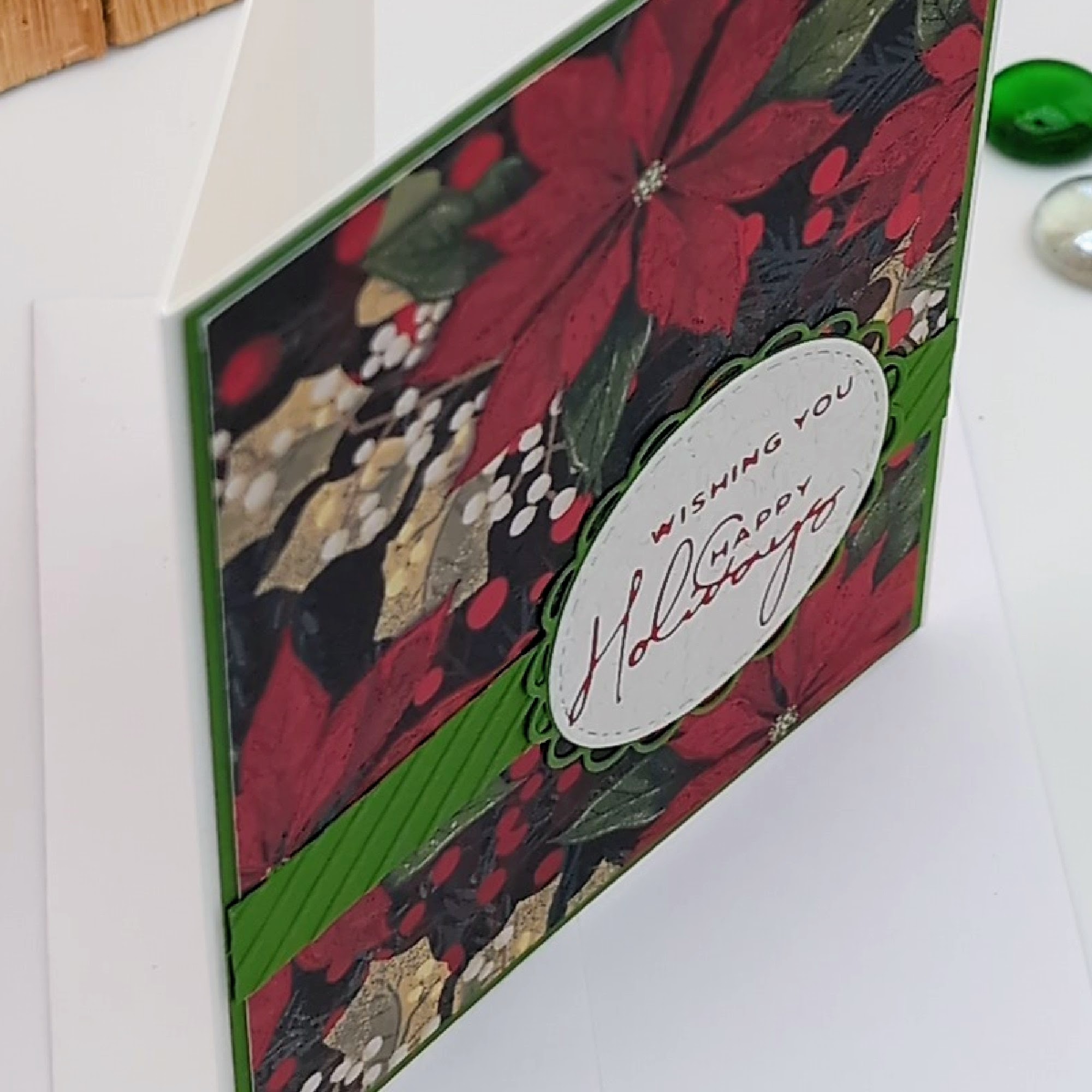 Celebrate the season with this handcrafted holiday card featuring painterly red poinsettias, lush greenery, and shimmering gold accents. A scalloped oval sentiment layered over a festive green band adds warmth and dimension. Blank inside for your personal message, this card blends traditional charm with artisan detail—ideal for Christmas, winter wishes, or seasonal greetings.