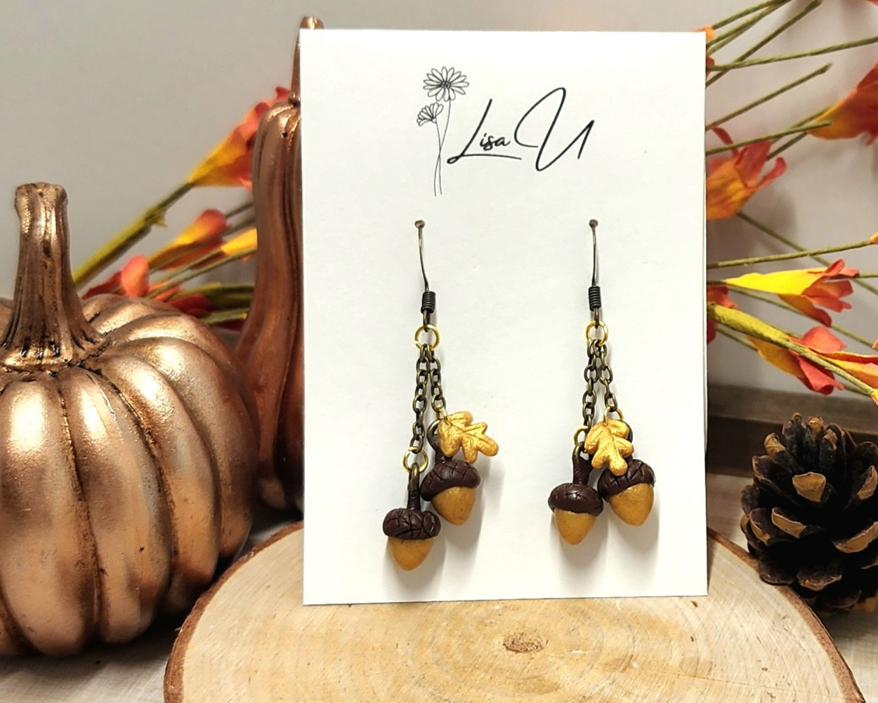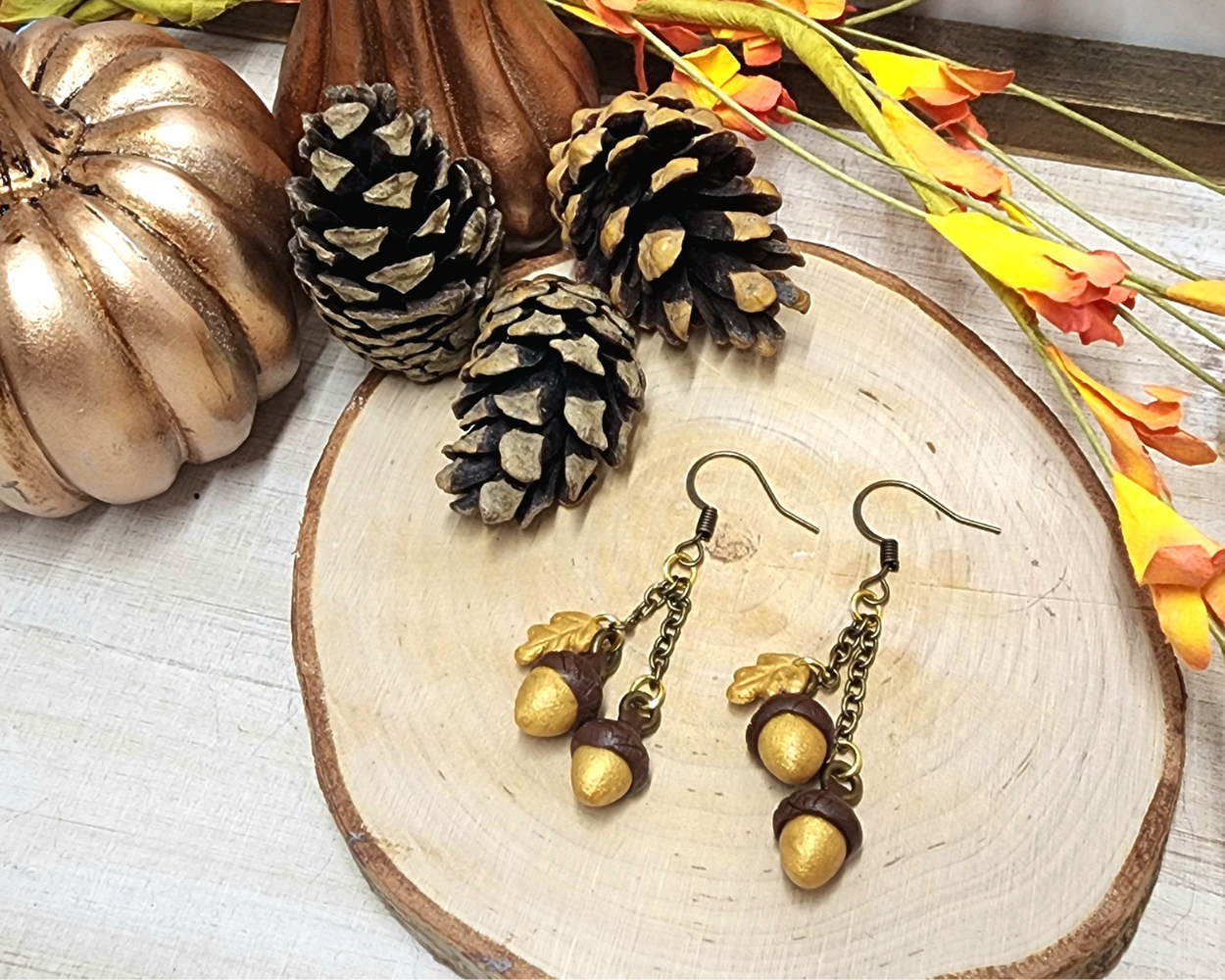 Celebrate the cozy charm of fall with these handcrafted polymer clay acorn earrings. Each pair is sculpted by hand using rich brown clay and 18K gold–color polymer clay for a warm, metallic finish. Antique-gold metal accents complete the woodland look. Lightweight and comfortable, these earrings add the perfect seasonal touch to any outfit—from pumpkin patch visits to Thanksgiving gatherings.