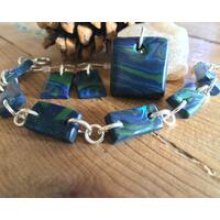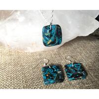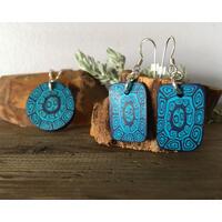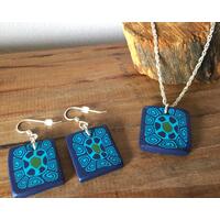 Handmade Baked Polymer Clay Earring and Matching Necklace Set. Fun, everyday clay jewelry with detailed spiral and circle geometric pattern. Turquoise and navy, square shaped, one piece dangle / drop earrings. Pattern is repeated on both front and backside of the earrings with sterling silver french ear wire hook.