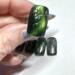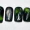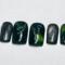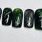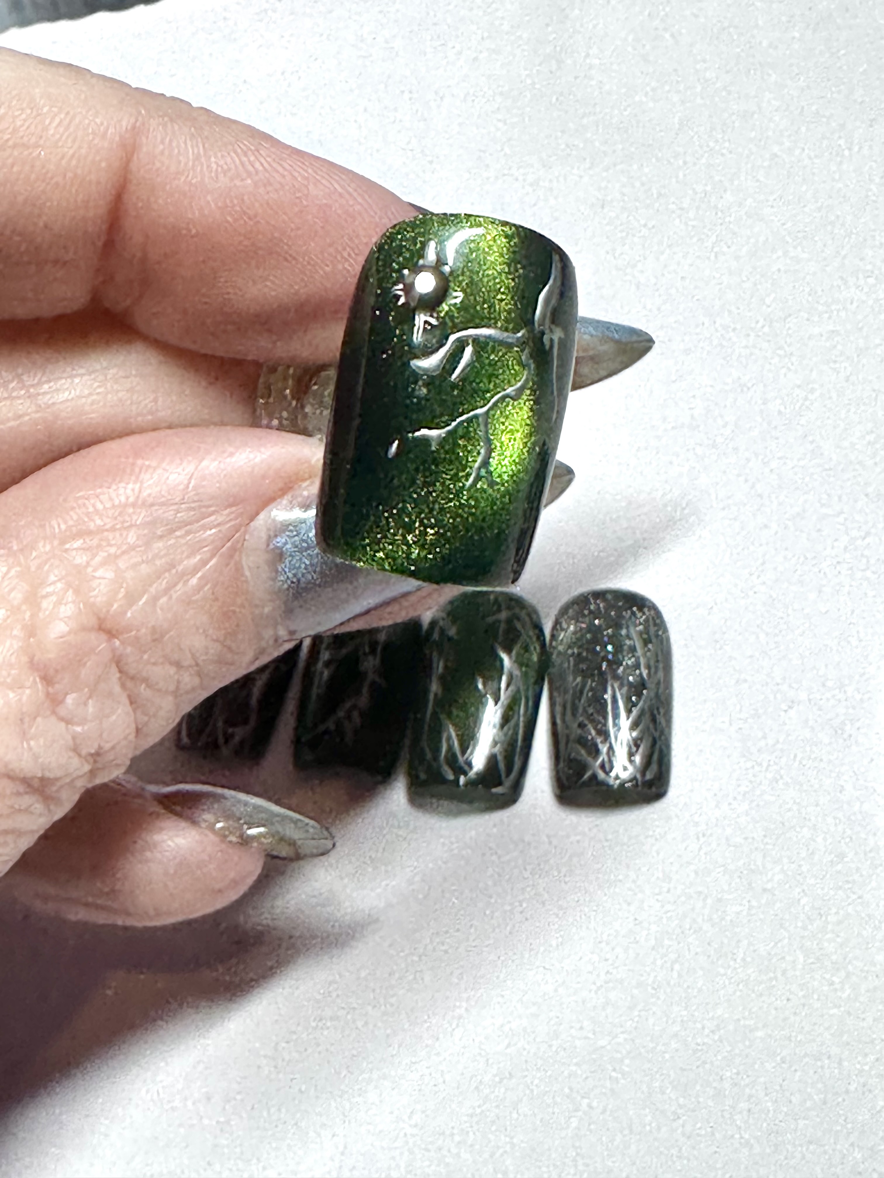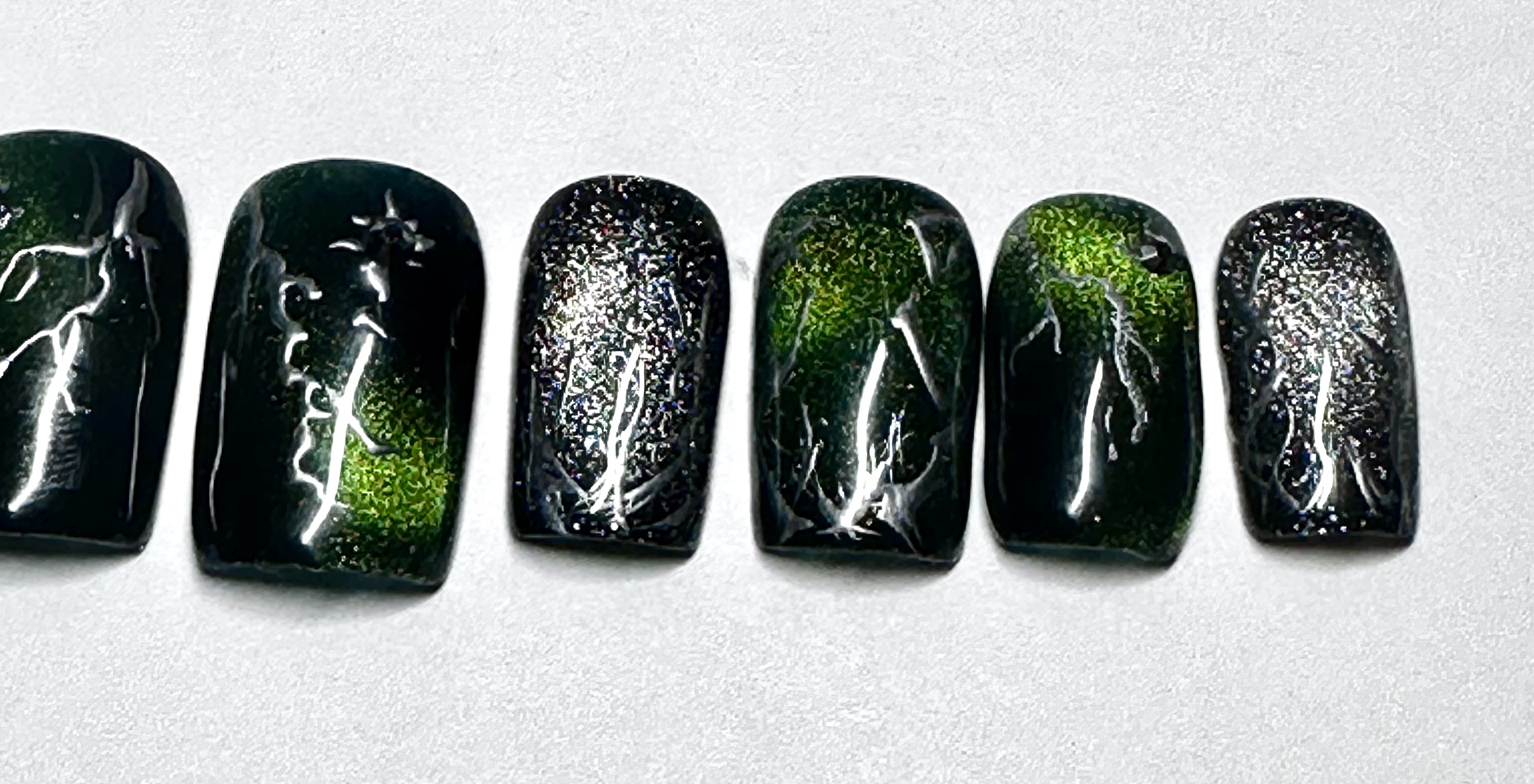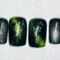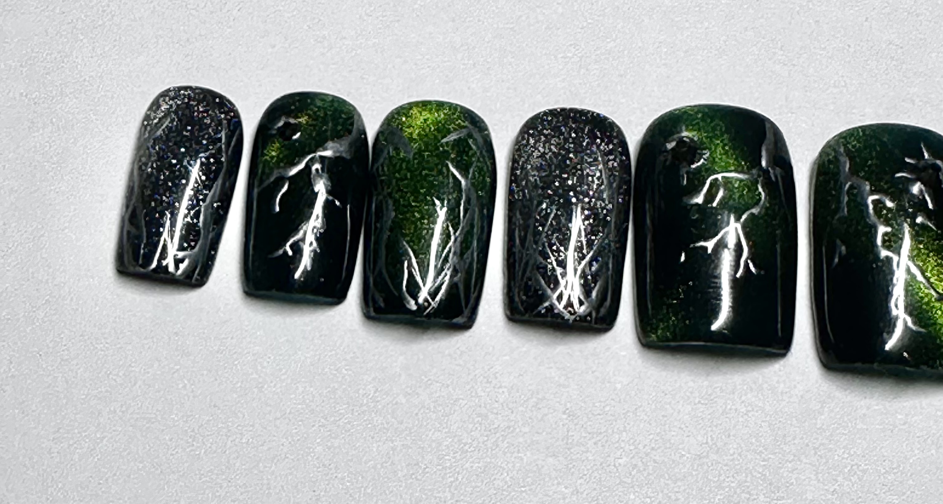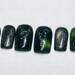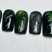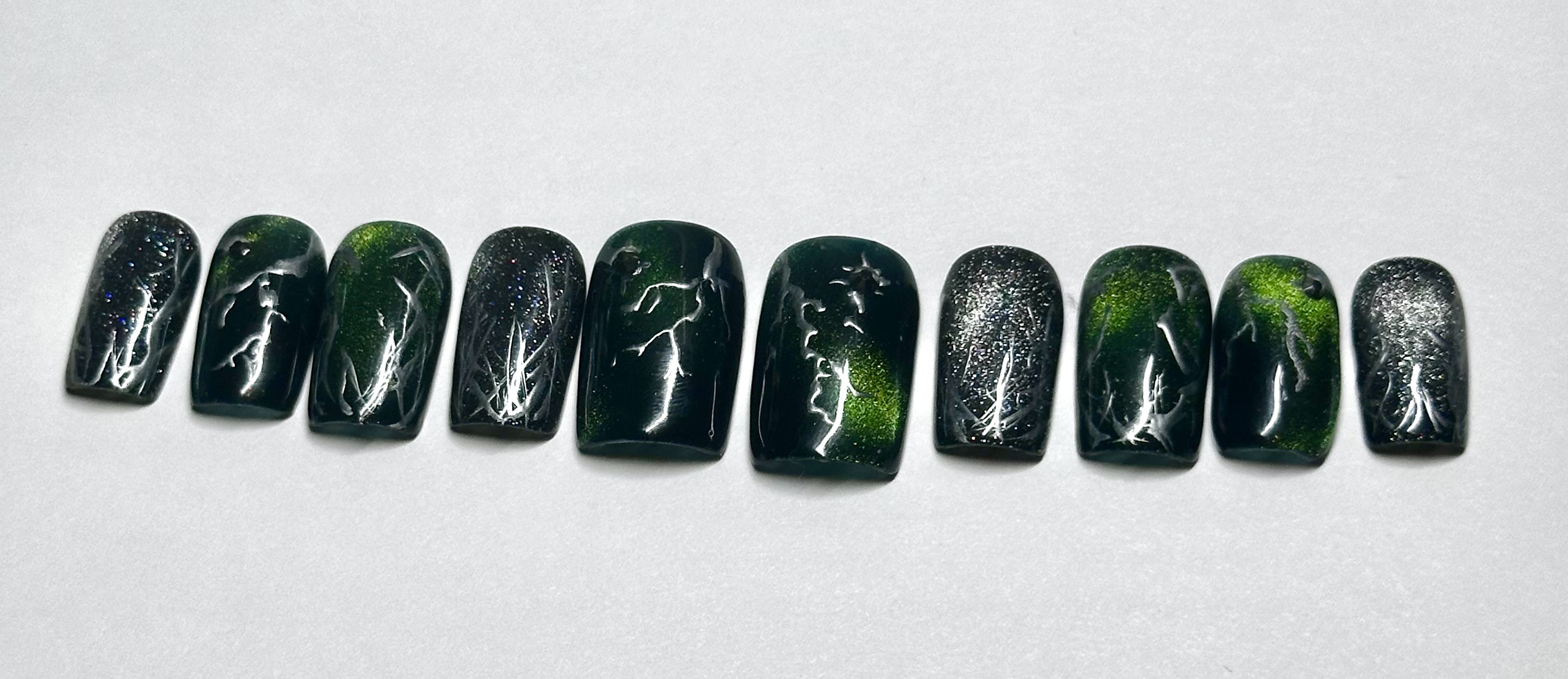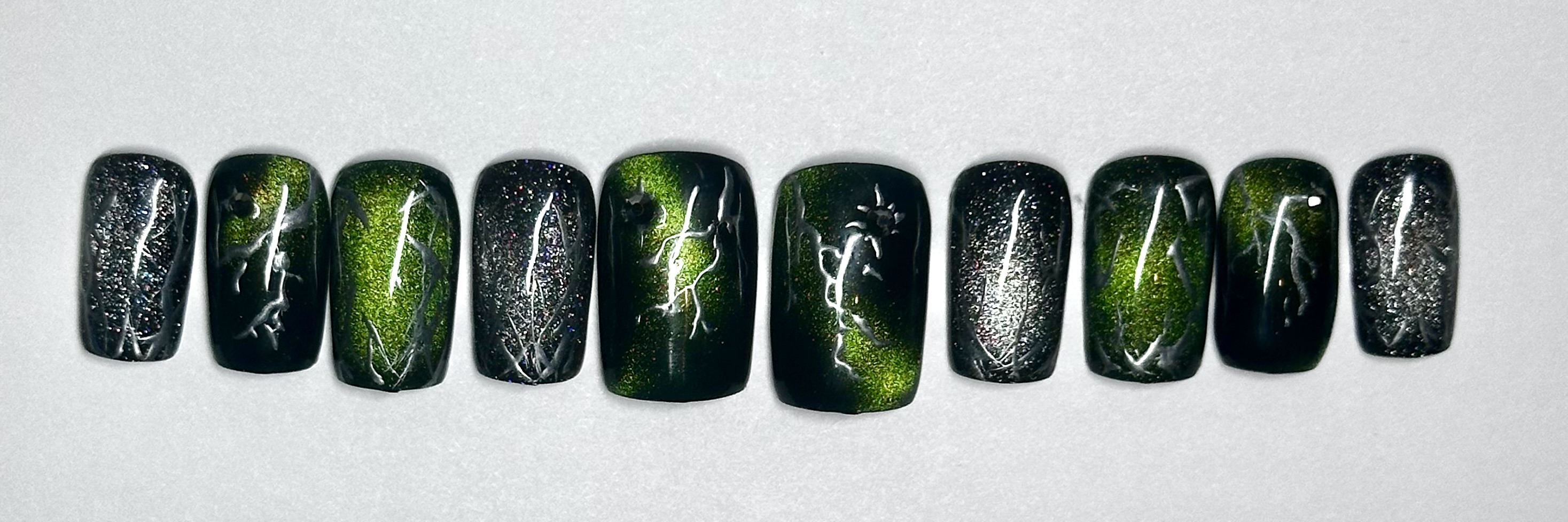 This nail set is inspired by kpop group Seventeen’s Happy Burst Day album and track Thunder. It features a dark green cat eye, black, and chrome color pallet inspired by the album concept. A key element featured in the design is the hand painted chrome lighting bolts highly by gunmetal gem stones.