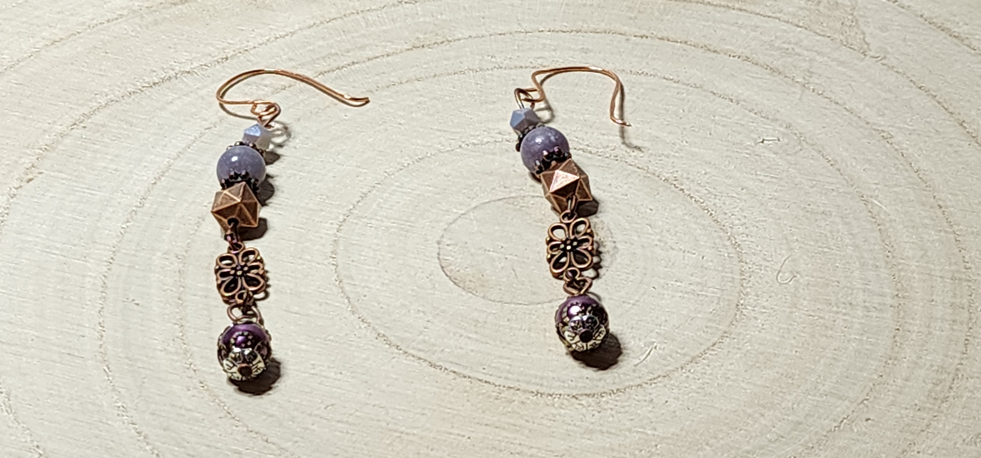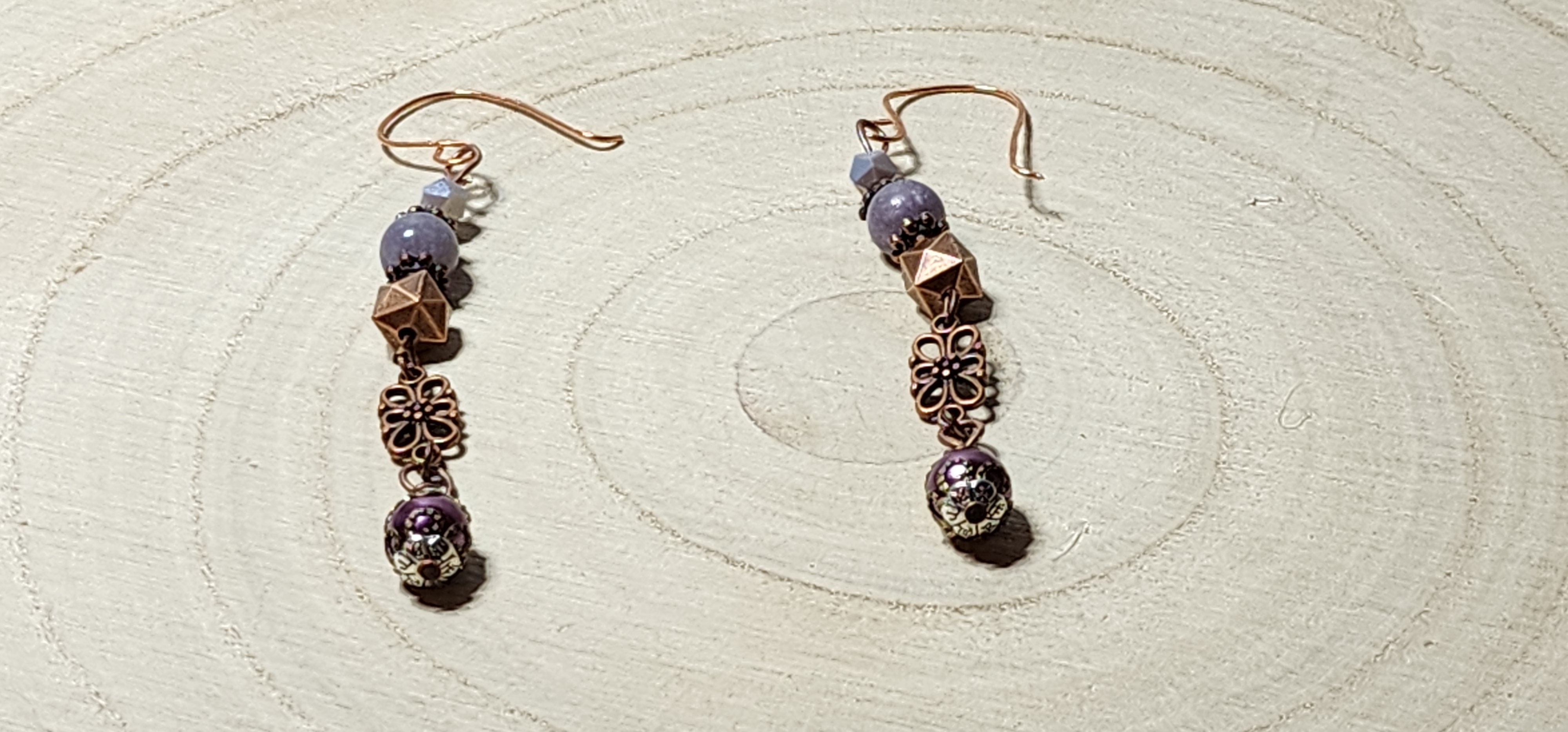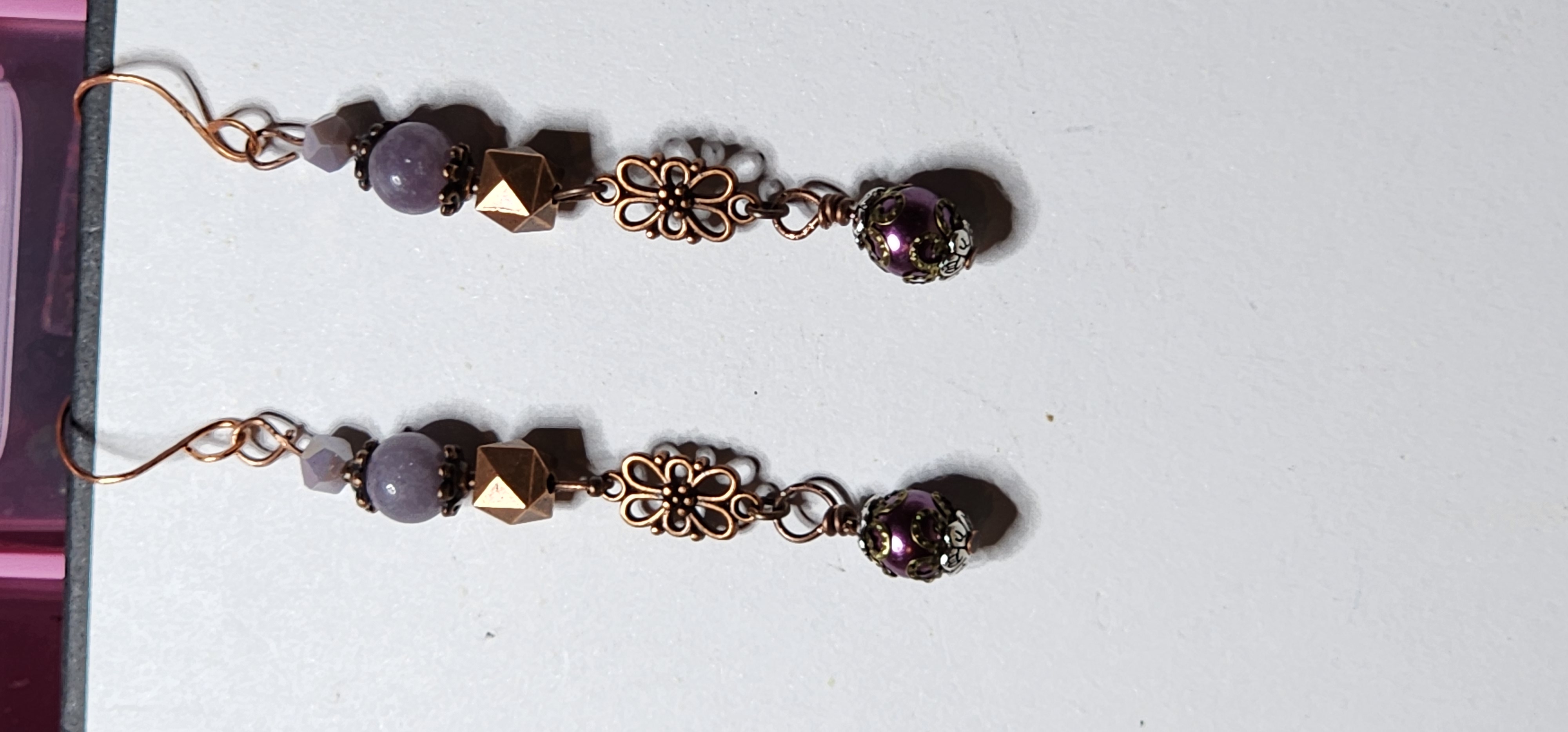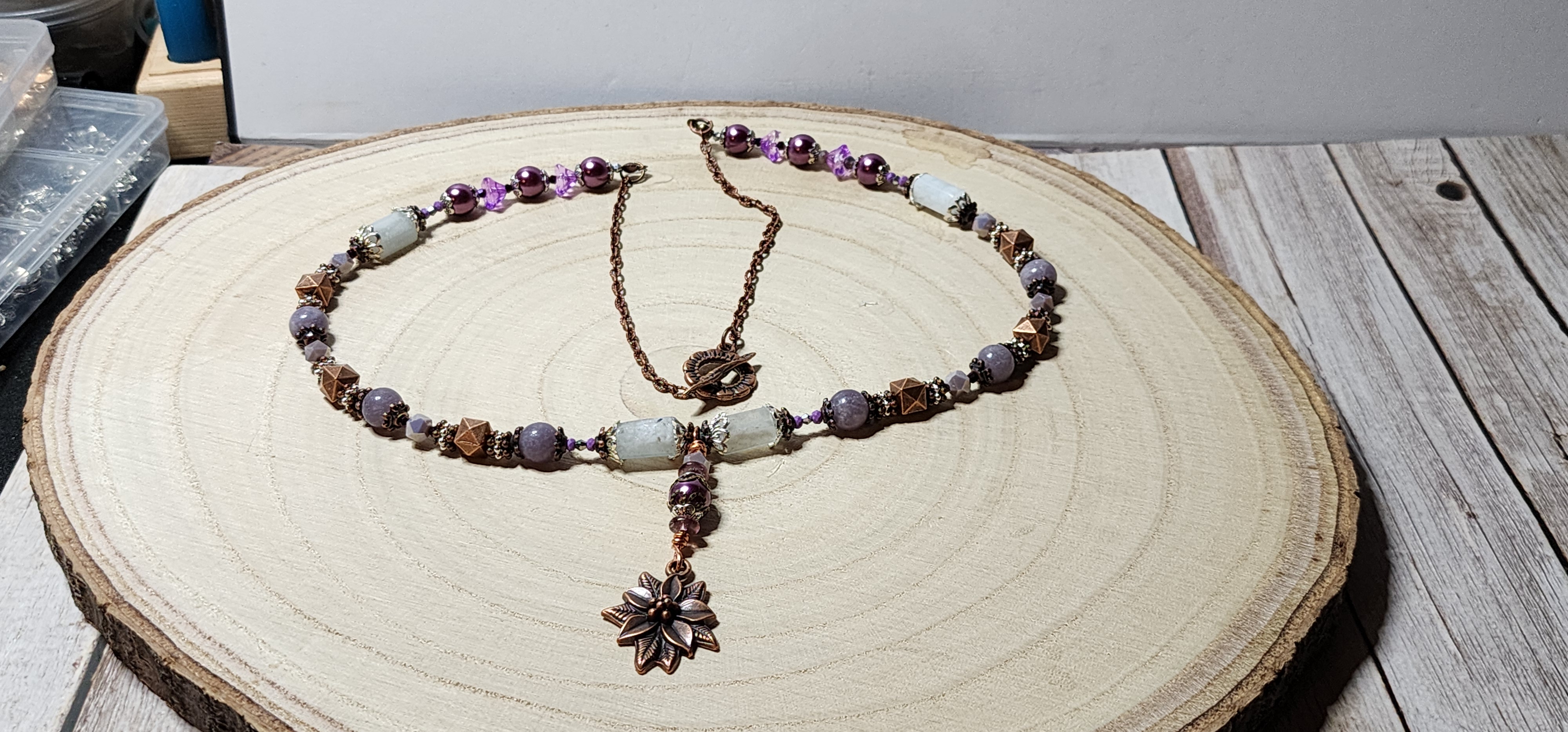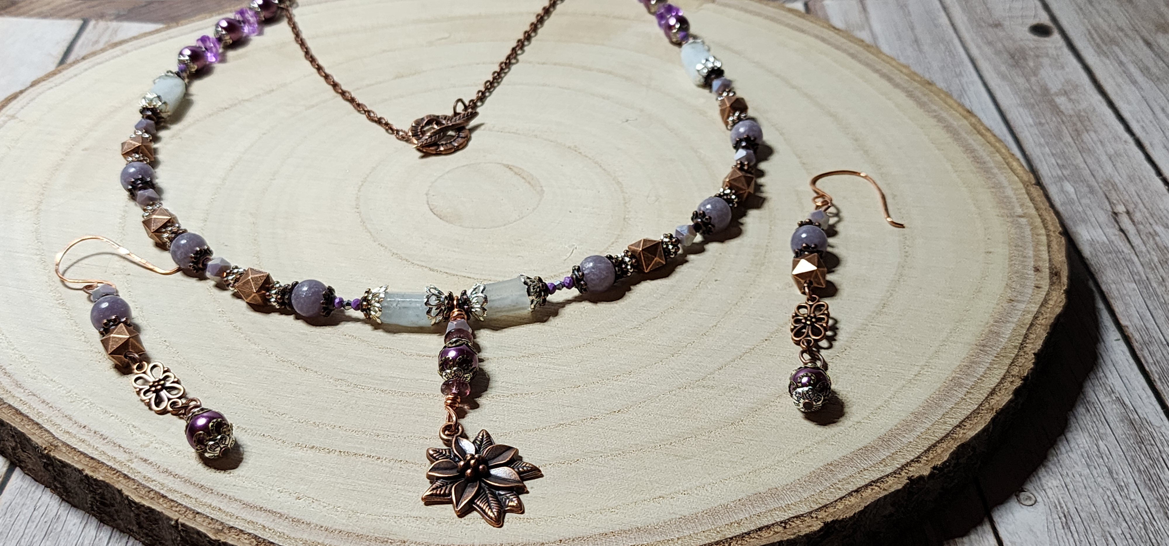 • Purple Lepidolite, Aquamarine , and copper metallic beads with antique copper floral accents