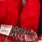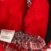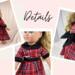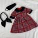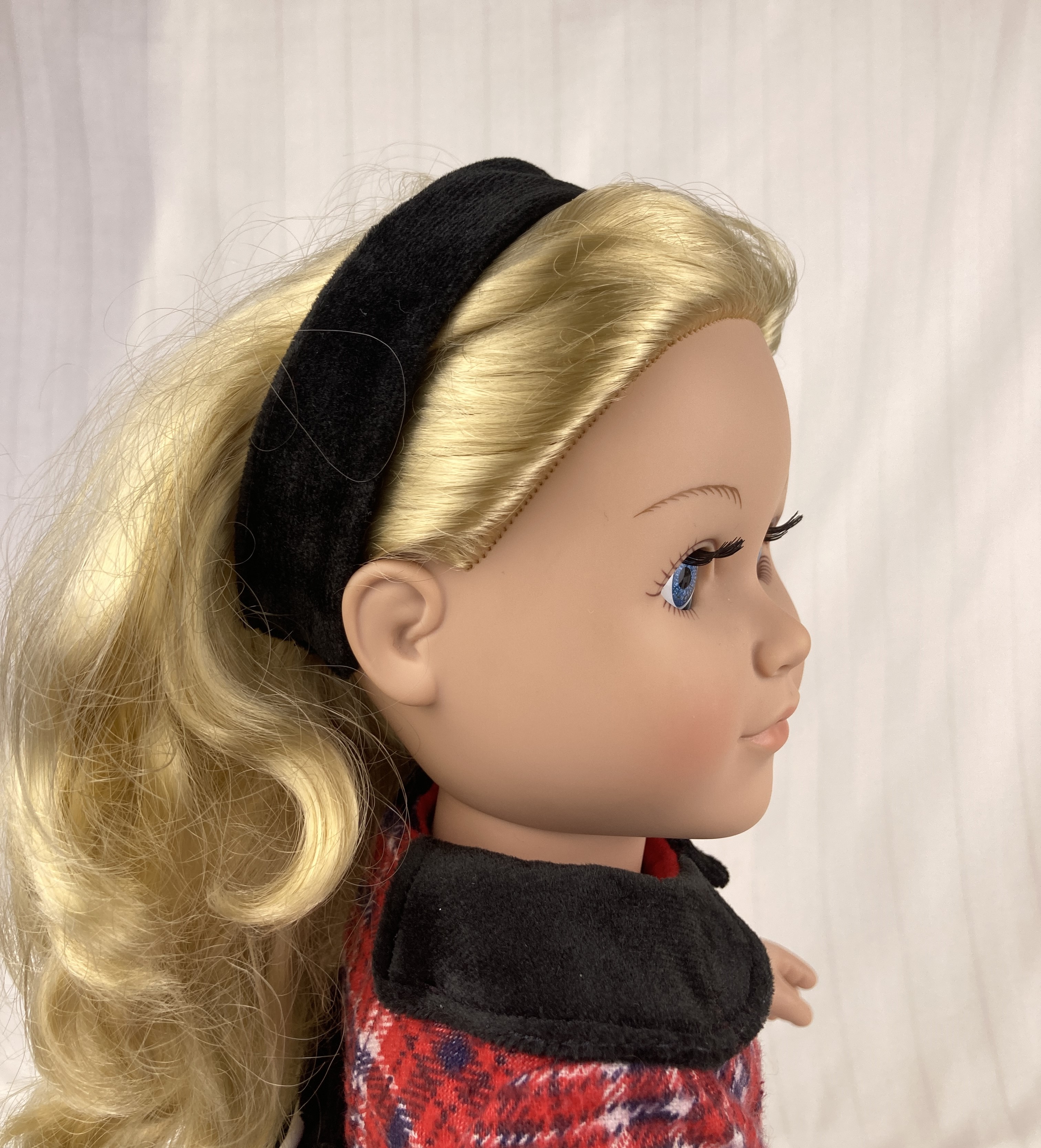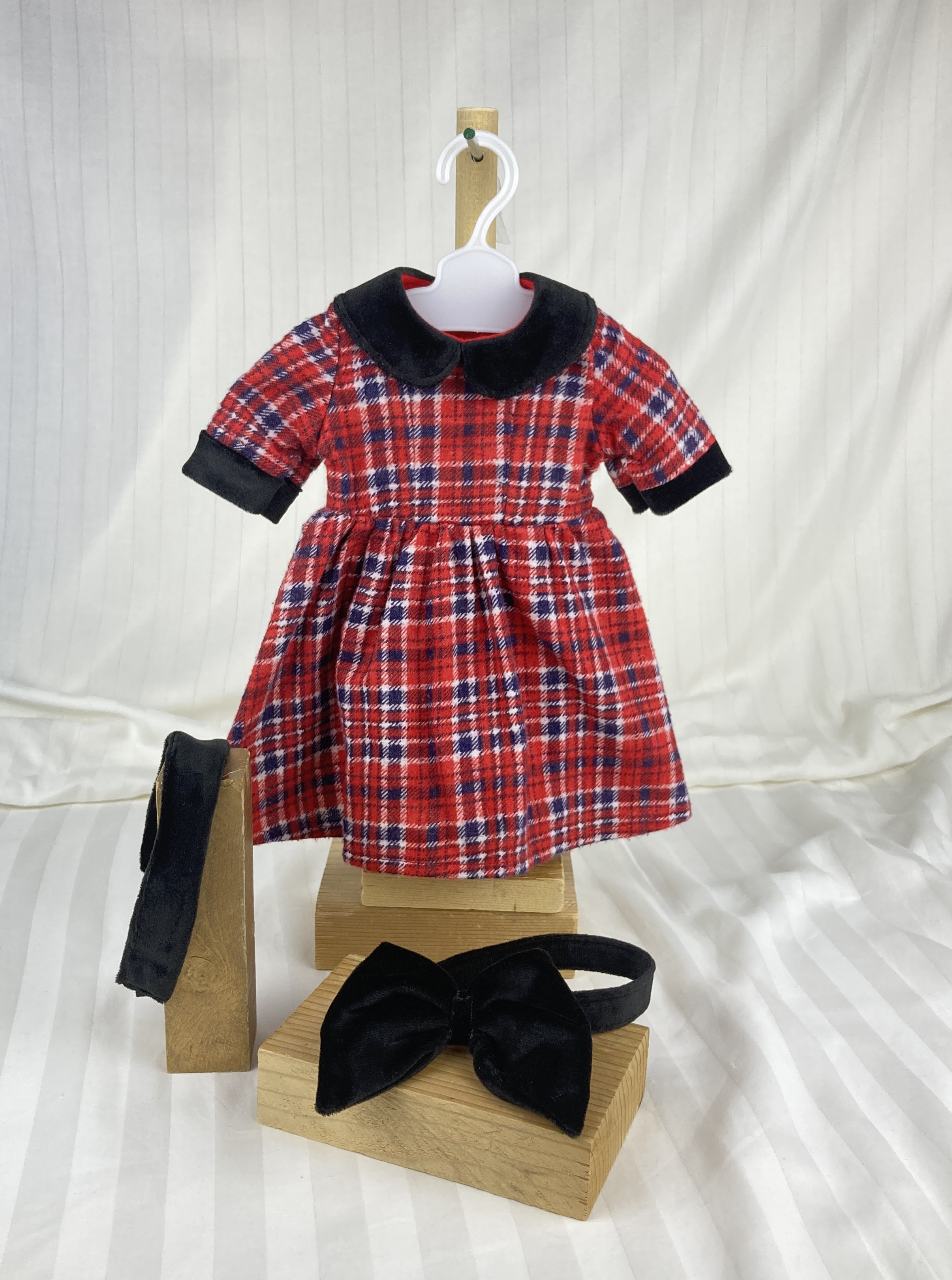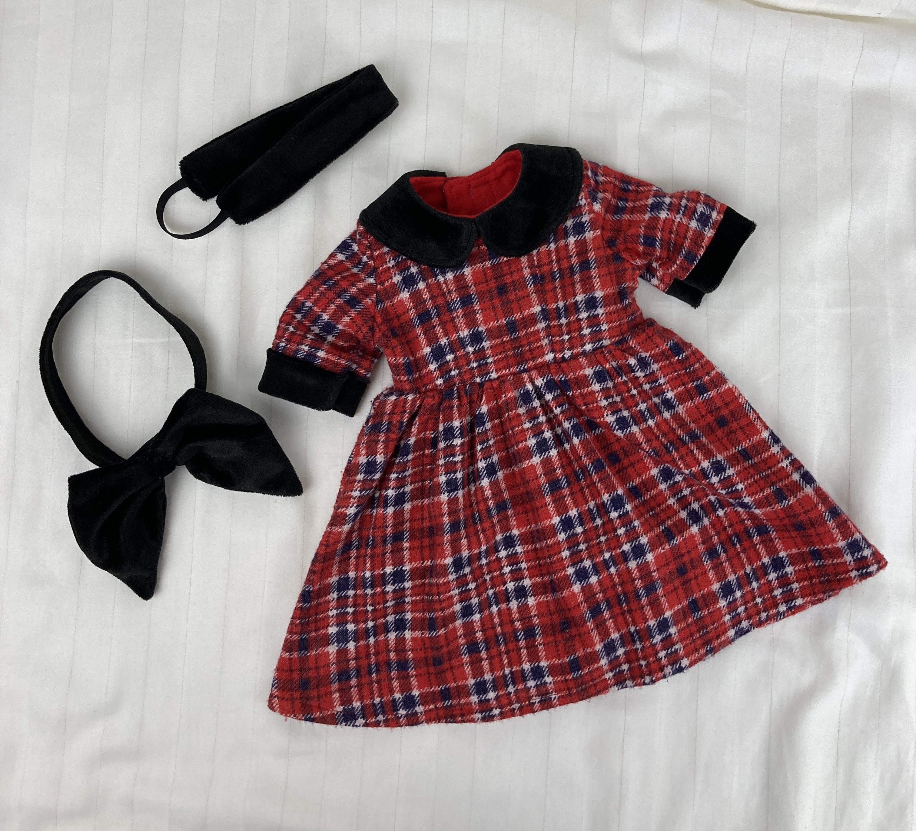 This cozy, winter plaid dress is perfect for the Christmas season! Made from red, white, and black plaid flannel, this dress features contrasting cuffs and a peter pan collar in luxurious black velvet. The bodice has front and back darts for shaping and the back closure is hook and loop. Bodice is lined. The gathered skirt hits about mid-calf and lets the fabric do the talking. The sash/belt is made from black velvet and boasts a large bow in back. The sash has a hook and loop back closure. The matching headband is also from black velvet and makes a stunning addition to this nostalgic outfit.