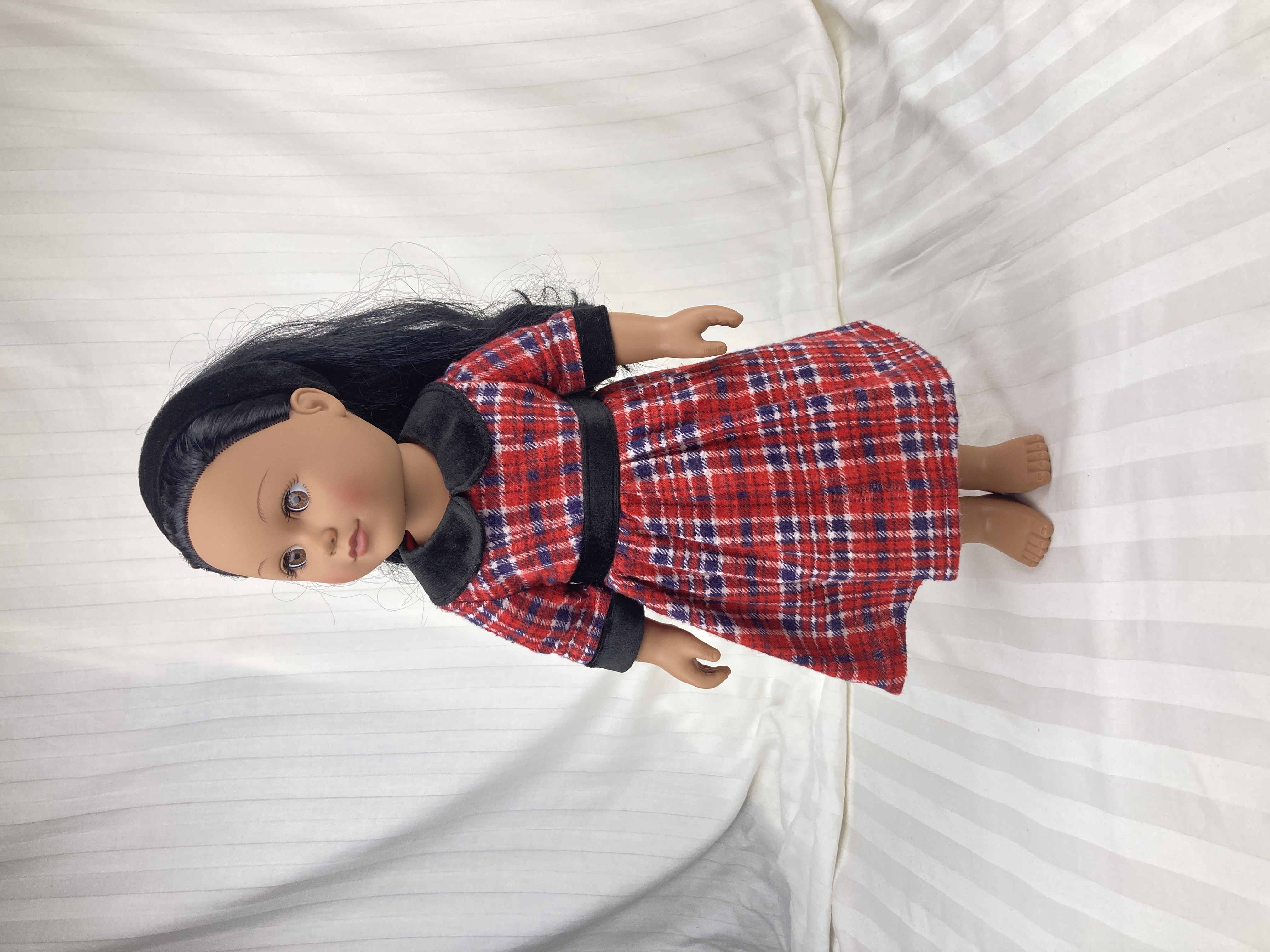 All our doll dresses are handmade by us using quality materials, and old fashioned industry, labor, skill and a passionate vision! ALL our 18 doll clothes have lined bodices unless specified and ALL our 18 doll clothes have finished seams either by multiple zigzagging or by enclosure; depending on the fabric and dress style, the skirts of our doll dresses are also often lined or have an attached petticoat (see individual listings). We strive to create 18 inch doll clothes that are realistic and cute/beautiful- clothes that last longer than fast fashion- clothes that maybe can even be handed down to future generations. A Yankee Doodle Darlings 18 inch doll dress is designed to fit well yet be easy to put on and take off. We try to sewn on all the little details such as buttons, beads, and trims for durability but at times must use a durable glue (see individual listings). Closures are hook and loop unless otherwise stated in listing.