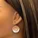 Inmade these boho-style earrings with Brass, Copper, and Sterling Silver sheet using traditional metalsmithing skills. I textured, polished, and tumbled the brass, copper, and sterling silver circles before layering and adding sterling silver ear wires. I oxidized the copper and brass circles to bring out the texture. I finished the earrings with a sterling eyelet to the top copper circle to give it a nice finished look.