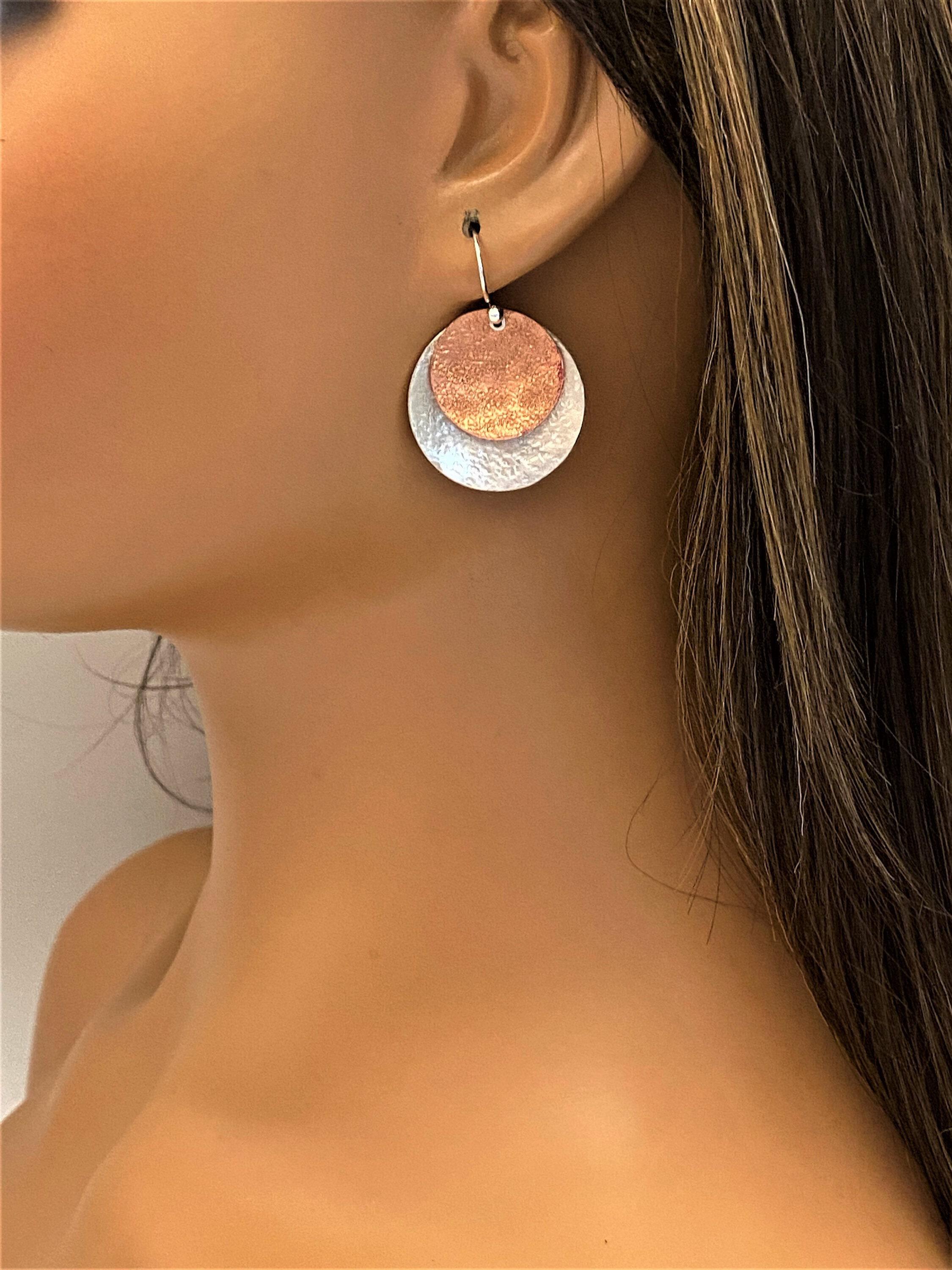 Hammered Copper and Silver Boho Earrings. Perfect gift for women who love handmade mixed metal earrings and mixed metal jewelry. Great choice for someone who loves Boho earrings.