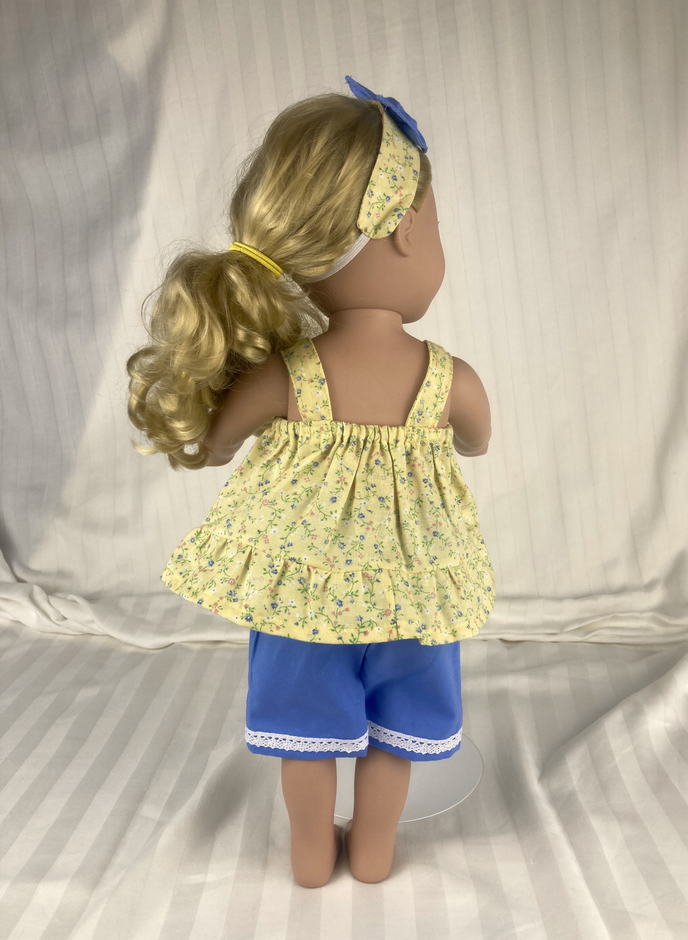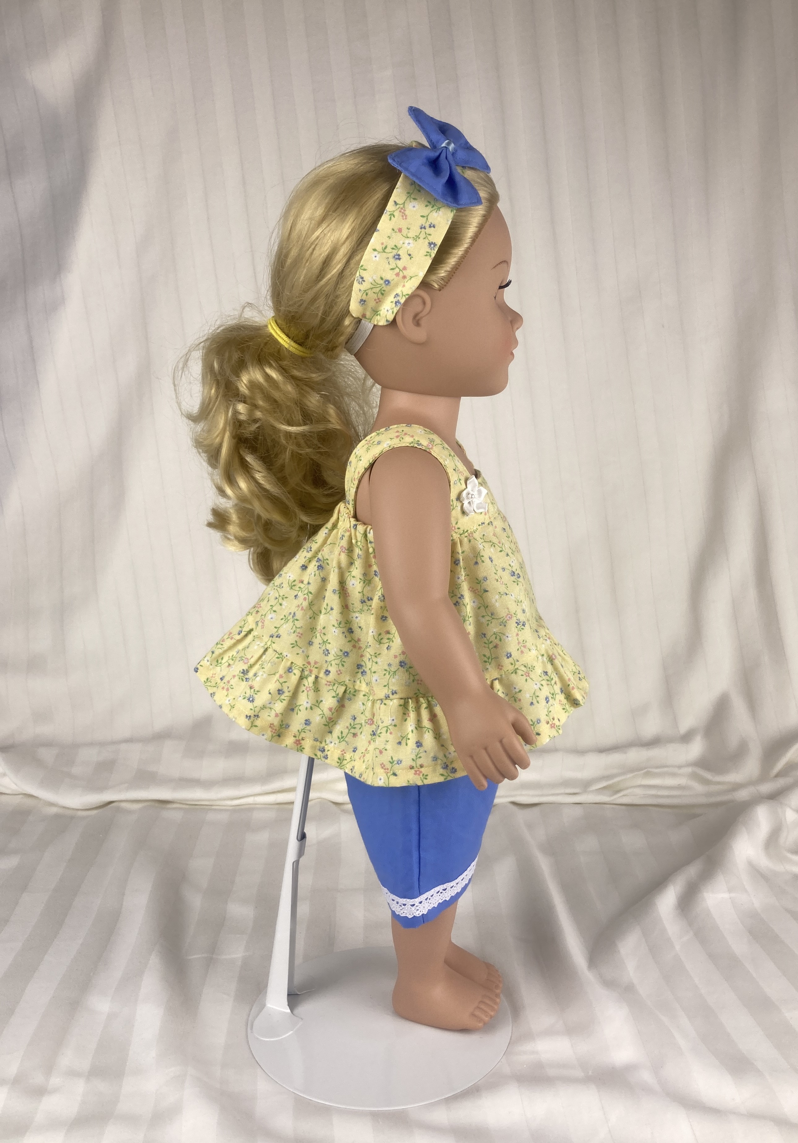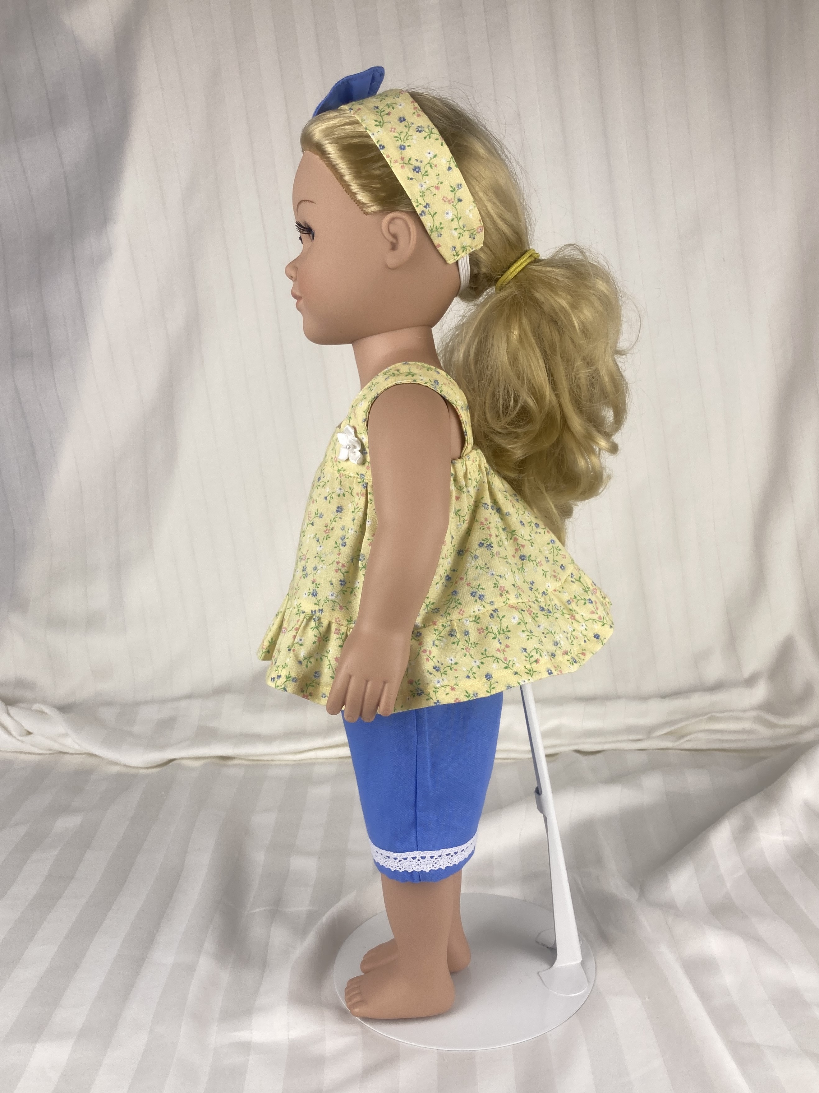 This two piece outfit features a yellow floral cotton top. The full gathered sleeveless top is made in a pullover smock style and has an elastic back to allow it to slide over the dolls head and arms. A medium ruffle edges the top and two white flower/rosettes adorn the area where the straps flow into the front yoke. The capris are made from a medium dusty blue cotton fabric and feature an elastic back. White, crocheted lace adorn the bottoms of the capris lending a sweet vintage feel. The matching headband has an elastic band for easy use. The headband is made from the same yellow fabric as the top and has a medium to large blue bow that matches the capris nestling on the side.
