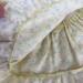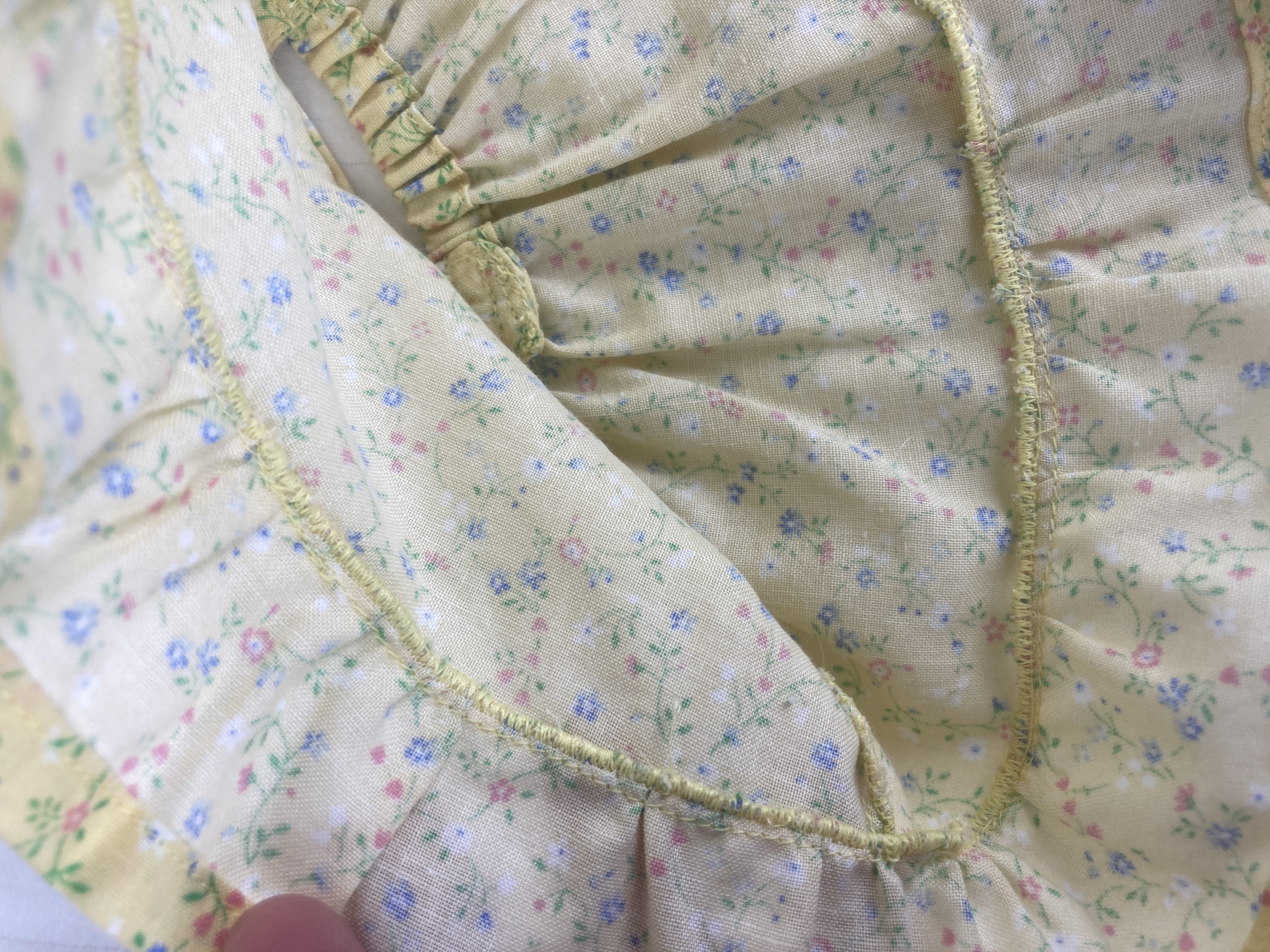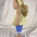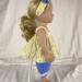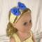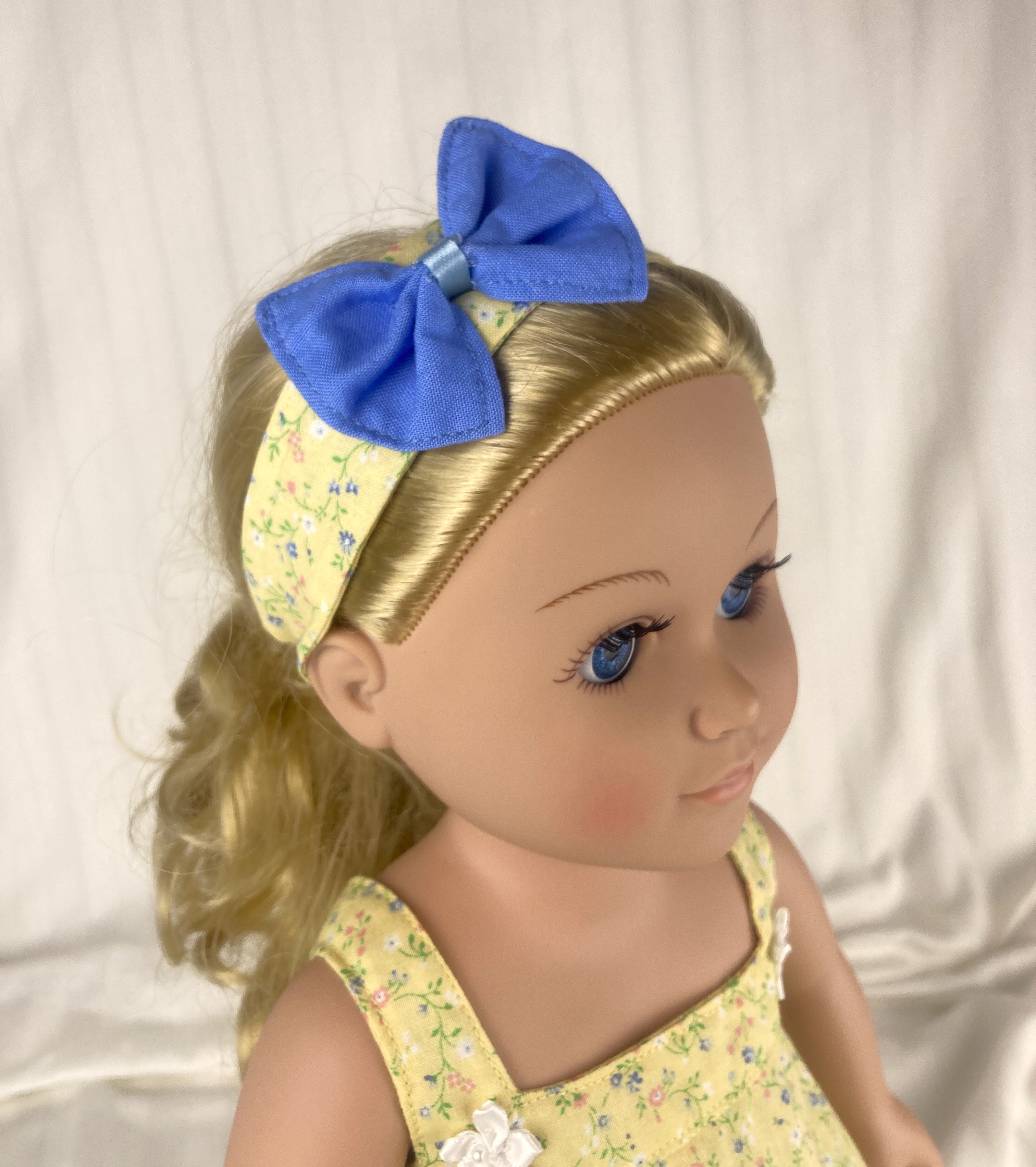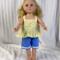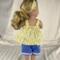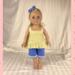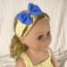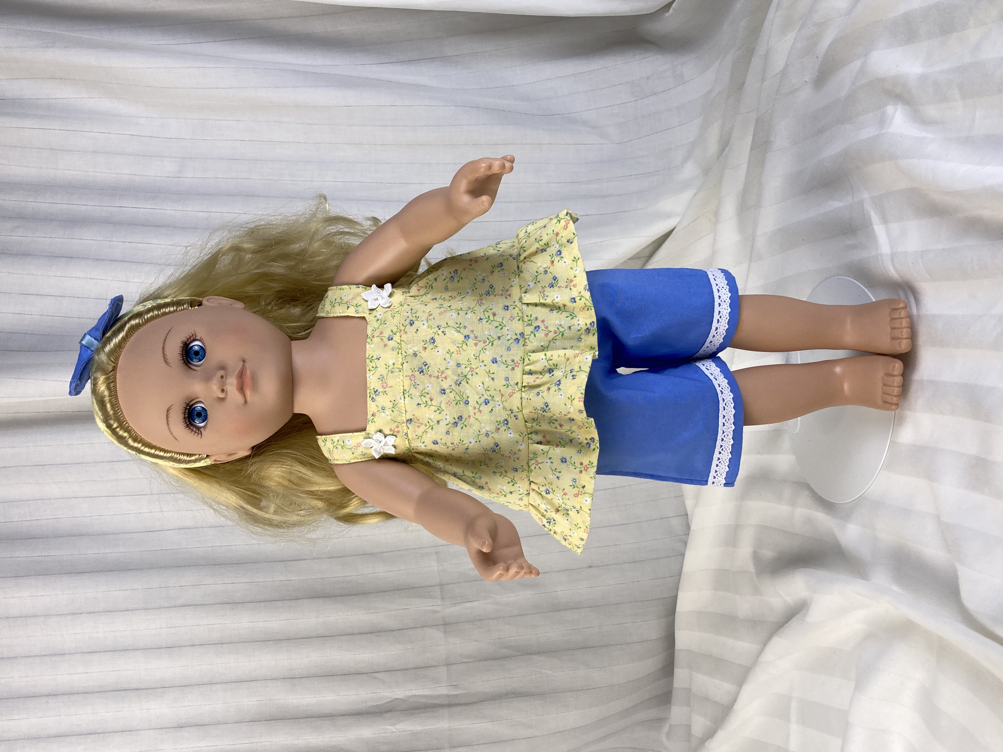 This two piece outfit features a yellow floral cotton top. The full gathered sleeveless top is made in a pullover smock style and has an elastic back to allow it to slide over the dolls head and arms. A medium ruffle edges the top and two white flower/rosettes adorn the area where the straps flow into the front yoke. The capris are made from a medium dusty blue cotton fabric and feature an elastic back. White, crocheted lace adorn the bottoms of the capris lending a sweet vintage feel. The matching headband has an elastic band for easy use. The headband is made from the same yellow fabric as the top and has a medium to large blue bow that matches the capris nestling on the side.