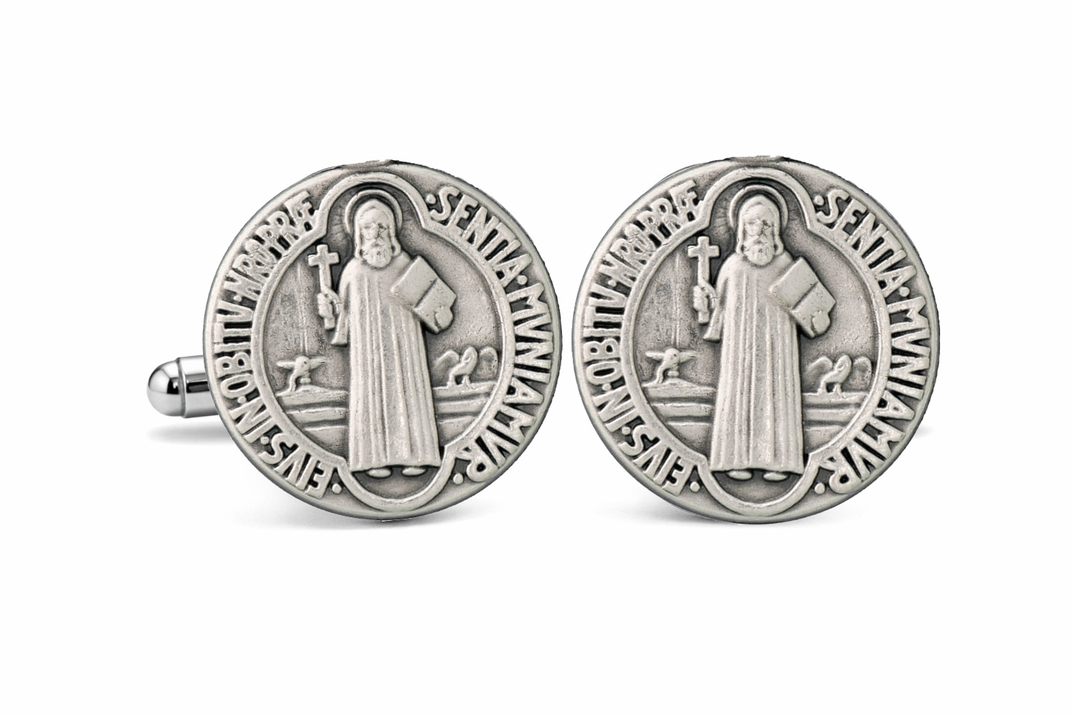 • Silver-tone finish • Detailed St. Benedict medal design • Round face cufflinks • Secure bullet-back closure • Designed for standard French cuff shirts • Durable and comfortable for all-day wear