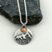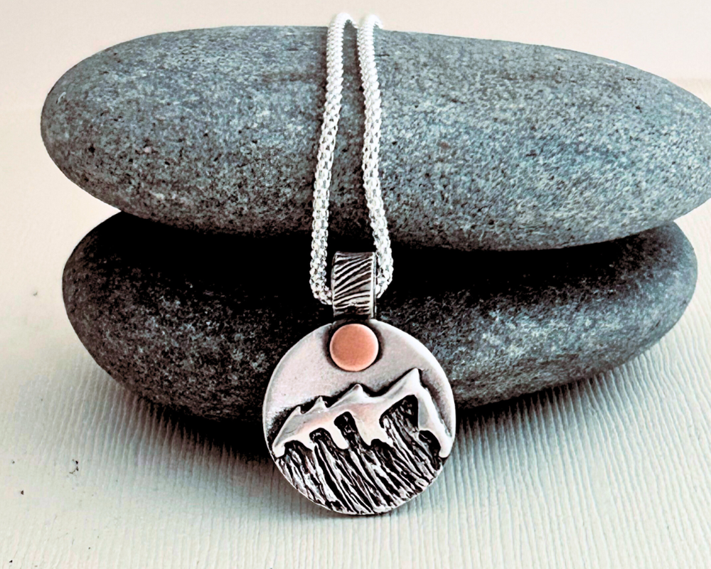 I created this piece with Sterling Silver Metal Clay and Copper Sheet. During the greenware stage, I etched and carved the mountain into the dried clay. After firing I added a copper moon/sun that I punched out of copper sheet and soldered onto the pendant.