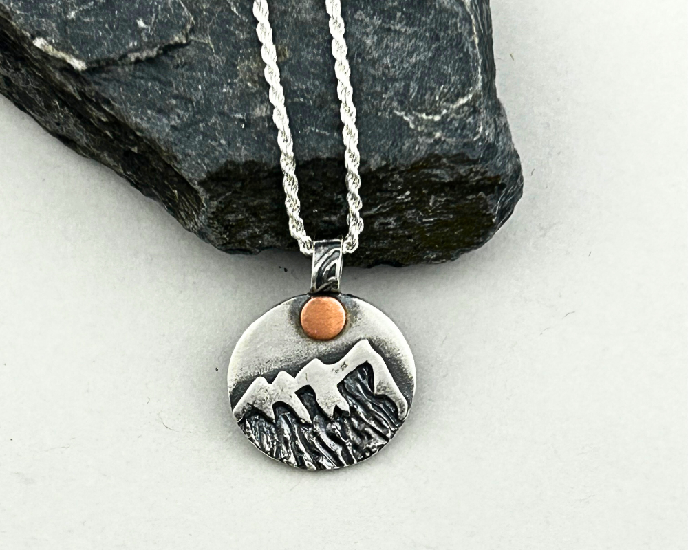 Discover the beauty of nature with our Handmade Sterling Silver and Copper Mountain Pendant Necklace. This unique piece of jewelry is meticulously hand-etched to capture the essence of majestic mountains, making it the perfect accessory for nature lovers and hikers. Crafted with high-quality sterling silver and copper, this pendant necklace showcases the artisanal skill and dedication to quality that goes into each piece.