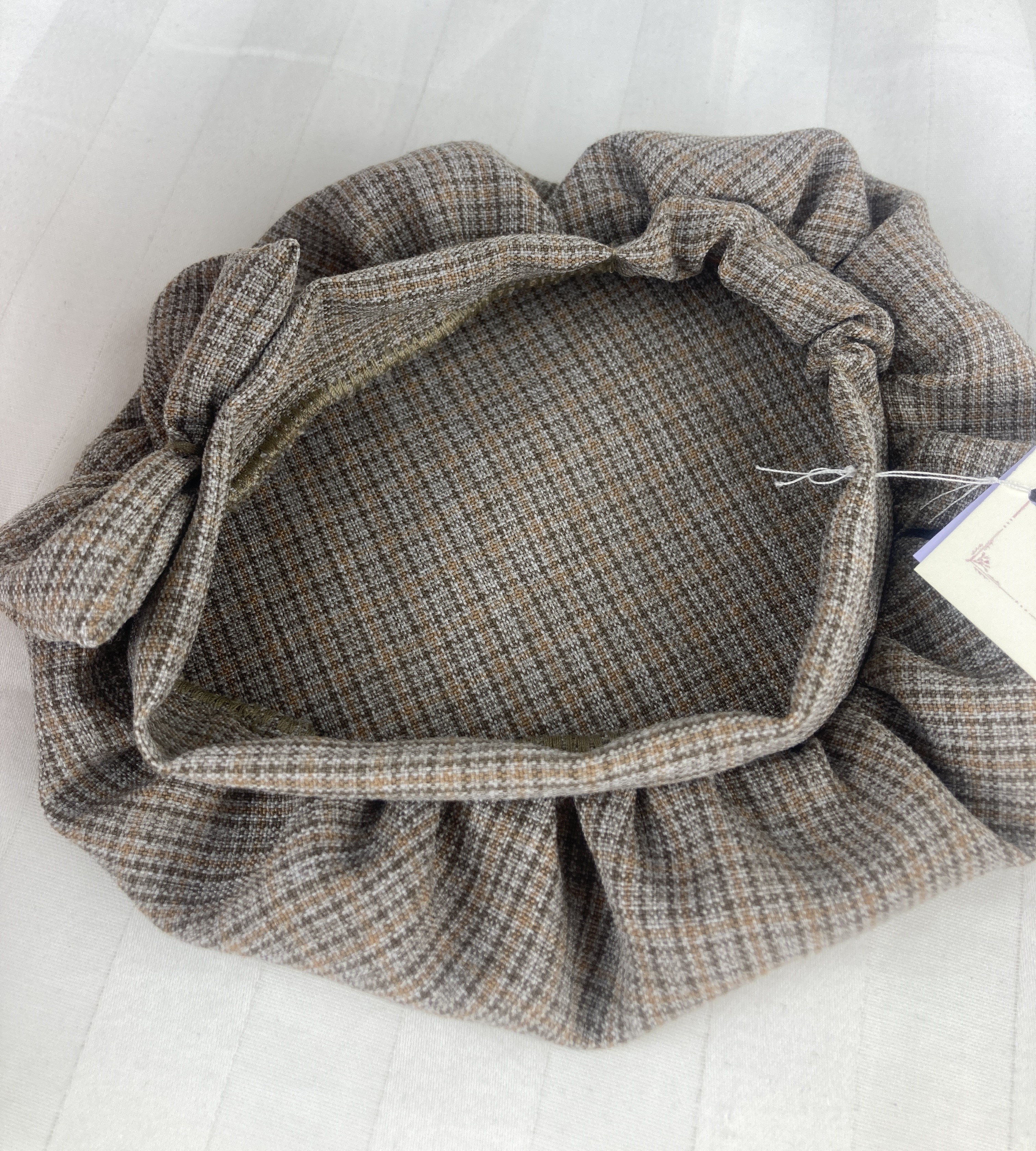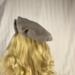 Made from a wonderful tan dupplin check fabric, this beret features a medium to large bow accent on the left side of the hat. A little elastic in back allows for more ease of use. Pair it with a trench style coat, or with an adorable pleated skirt and jacket for a stylish ensemble.