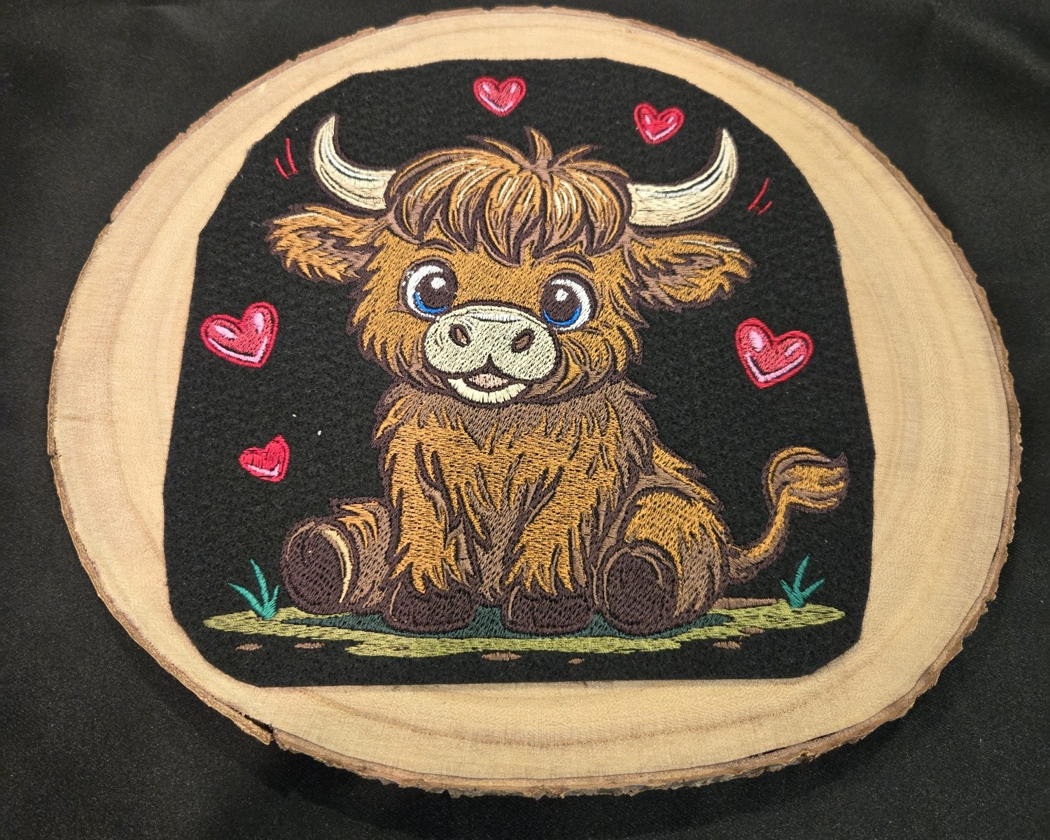Handmade Wall Hanging Embroidered Highland Cow with Hearts