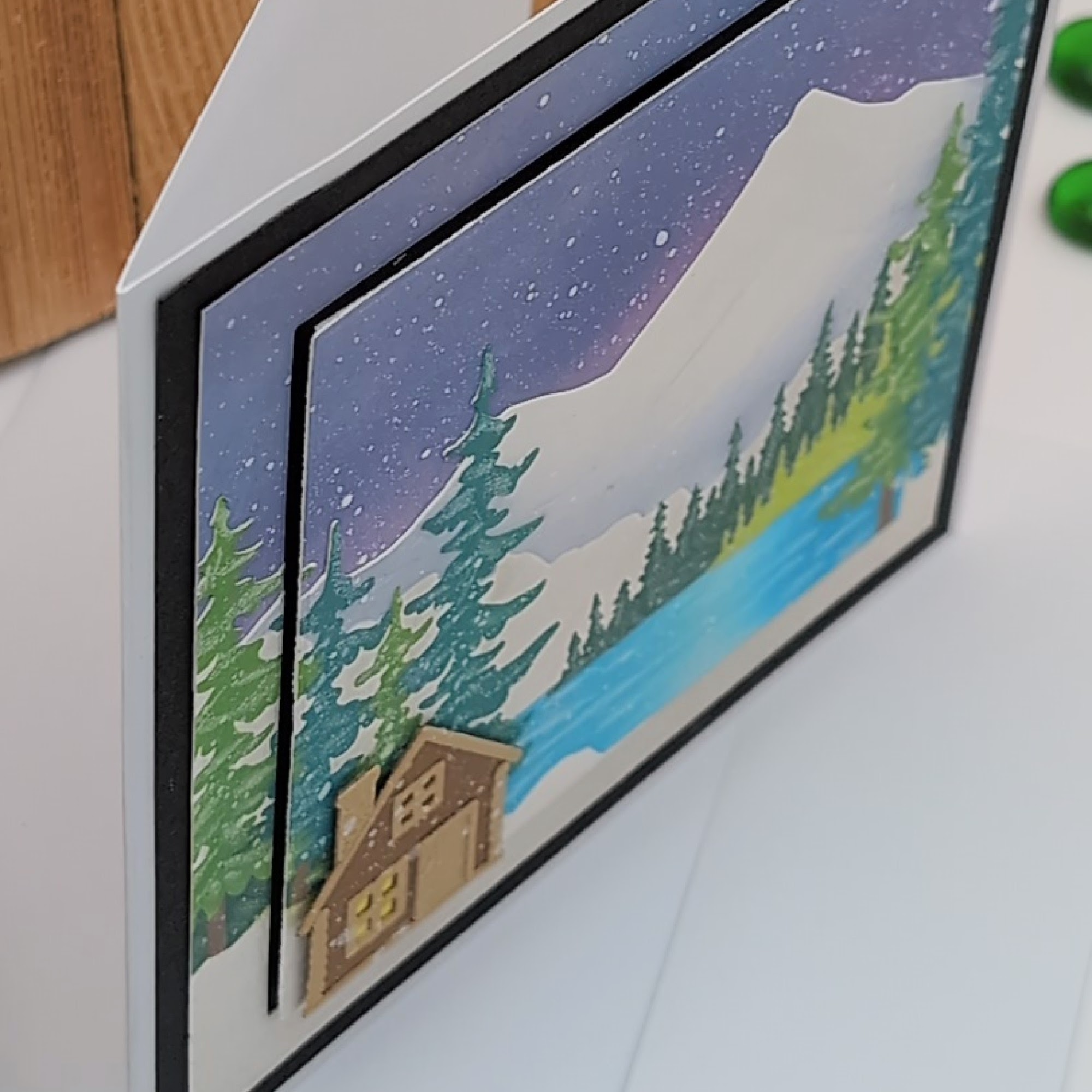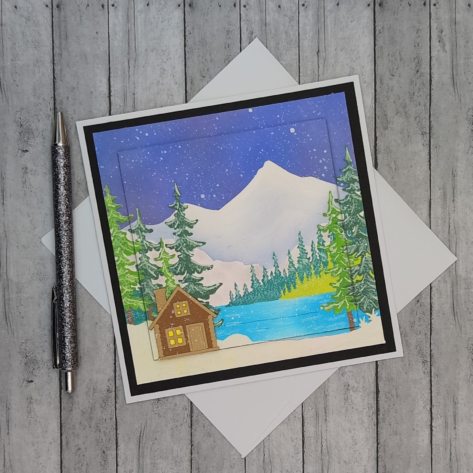 This handmade card captures the quiet magic of winter. Featuring a layered landscape with snowy mountains, falling snow, pine trees, a shimmering lake, and a cozy cabin under a starry sky, it’s a peaceful way to send encouragement, reflection, or a simple hello. Blank inside for your personal message. Ideal for nature lovers, winter enthusiasts, or anyone who appreciates a moment of calm and beauty. Comes with a blank envelope.