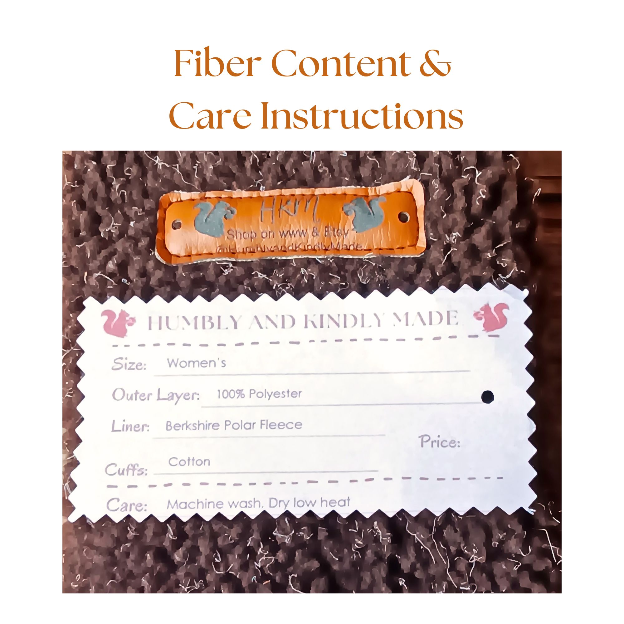 Each tag includes fiber content details and care instructions for transparency.