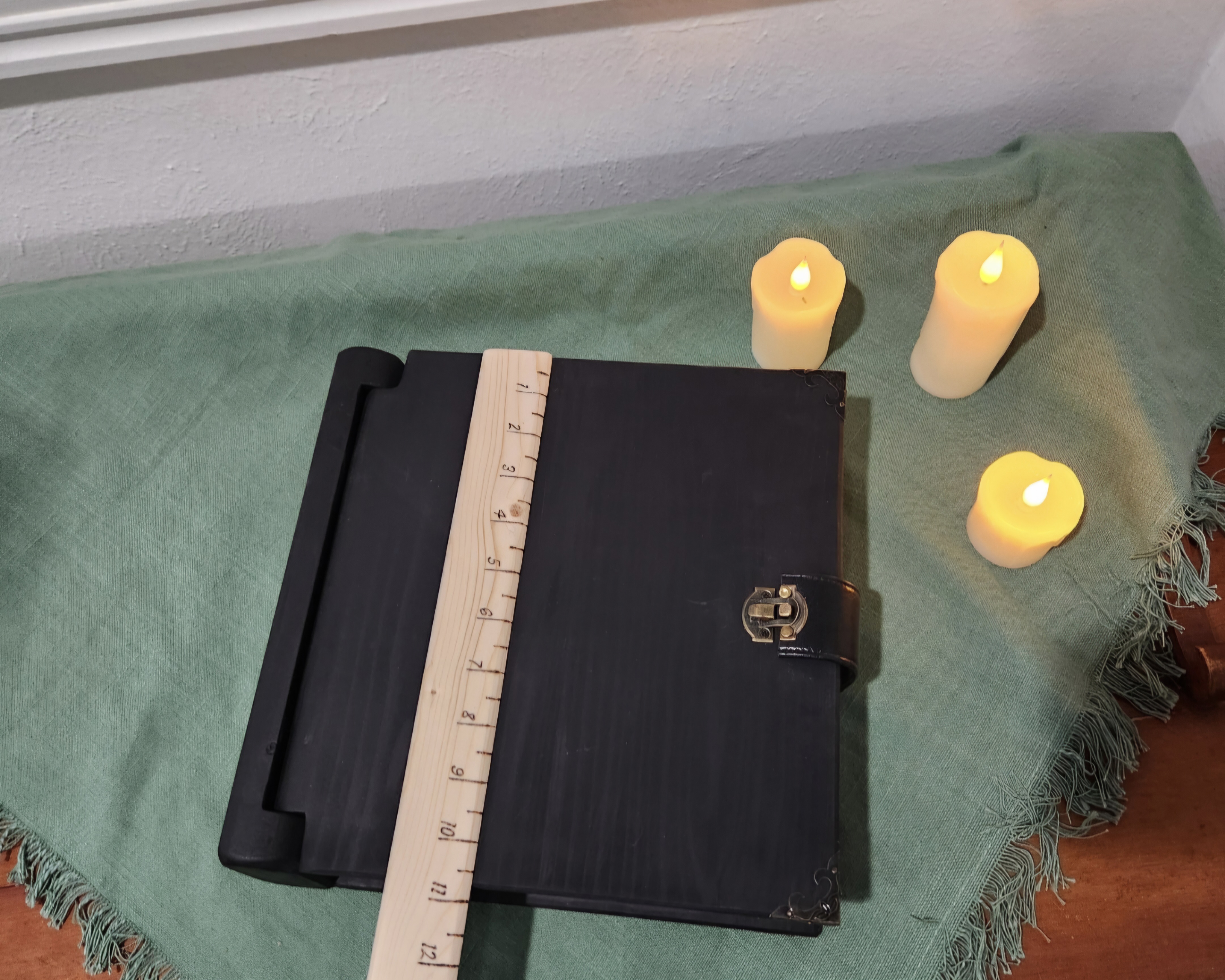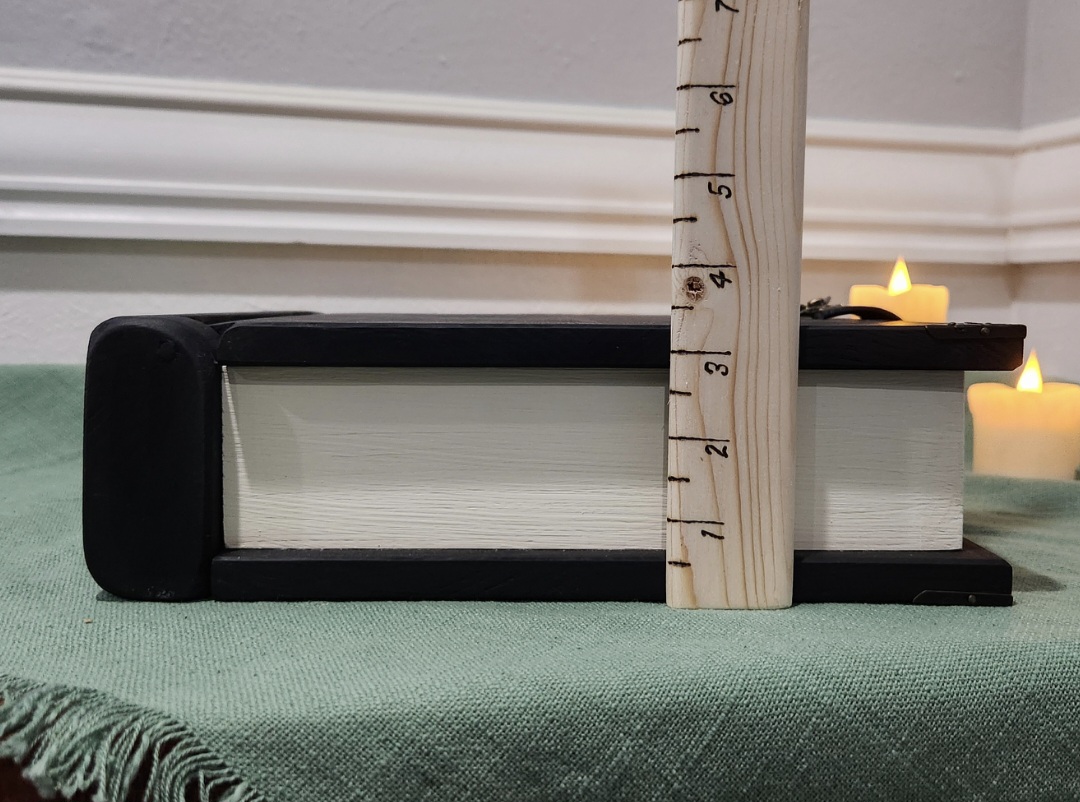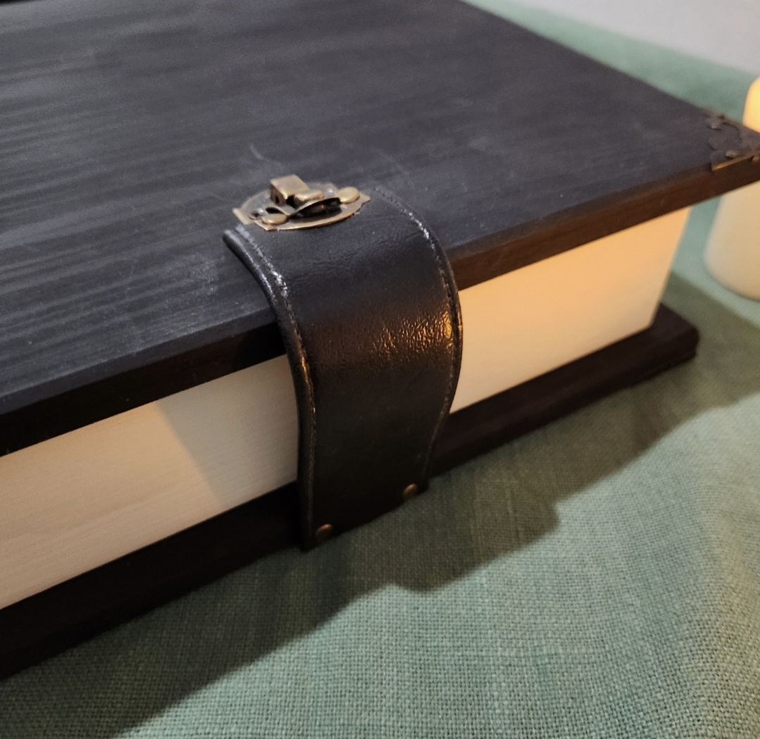 Decorative and functional! Made from wood with matte black and white paint and acrylic finish. Simplistic with old world charm. Decorative corner accents and working leather closure strap and latch. Perfect for stashing small items or adding to Halloween decor collection. A unique addition to any bookcase for keepsakes or adding a dash of whimsy to your memorabilia display.