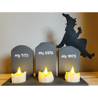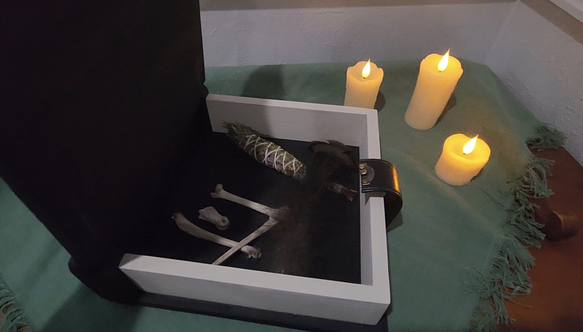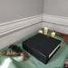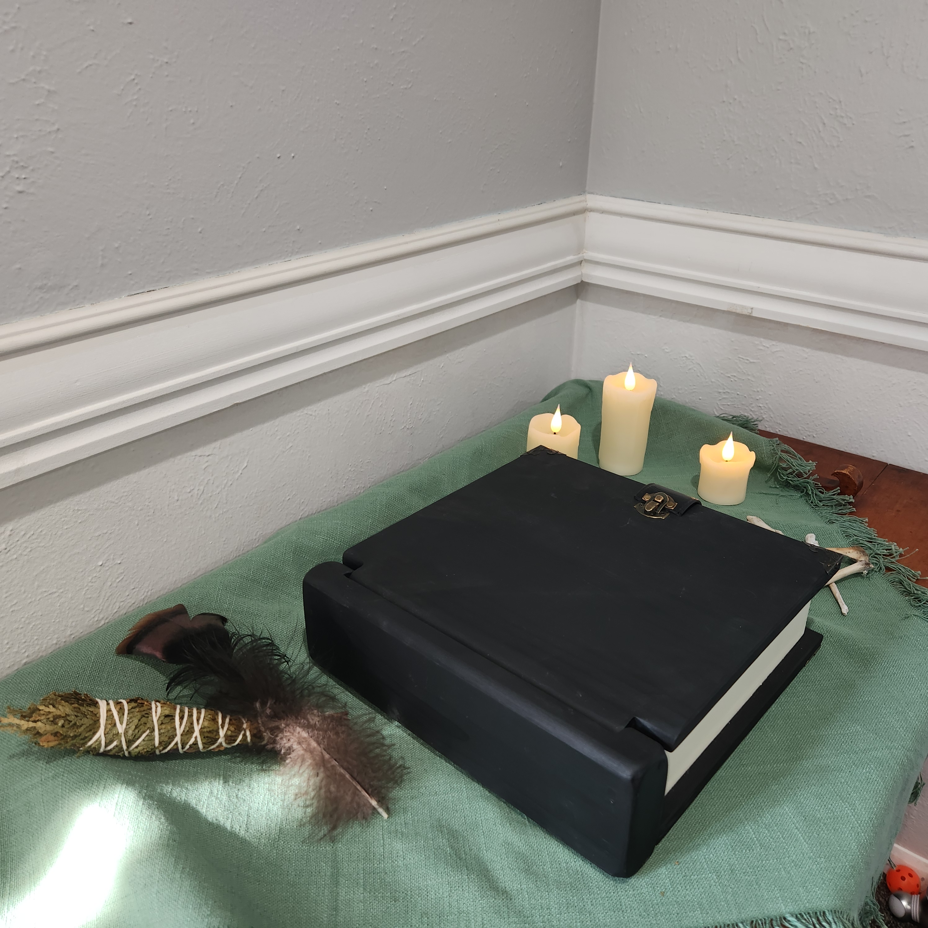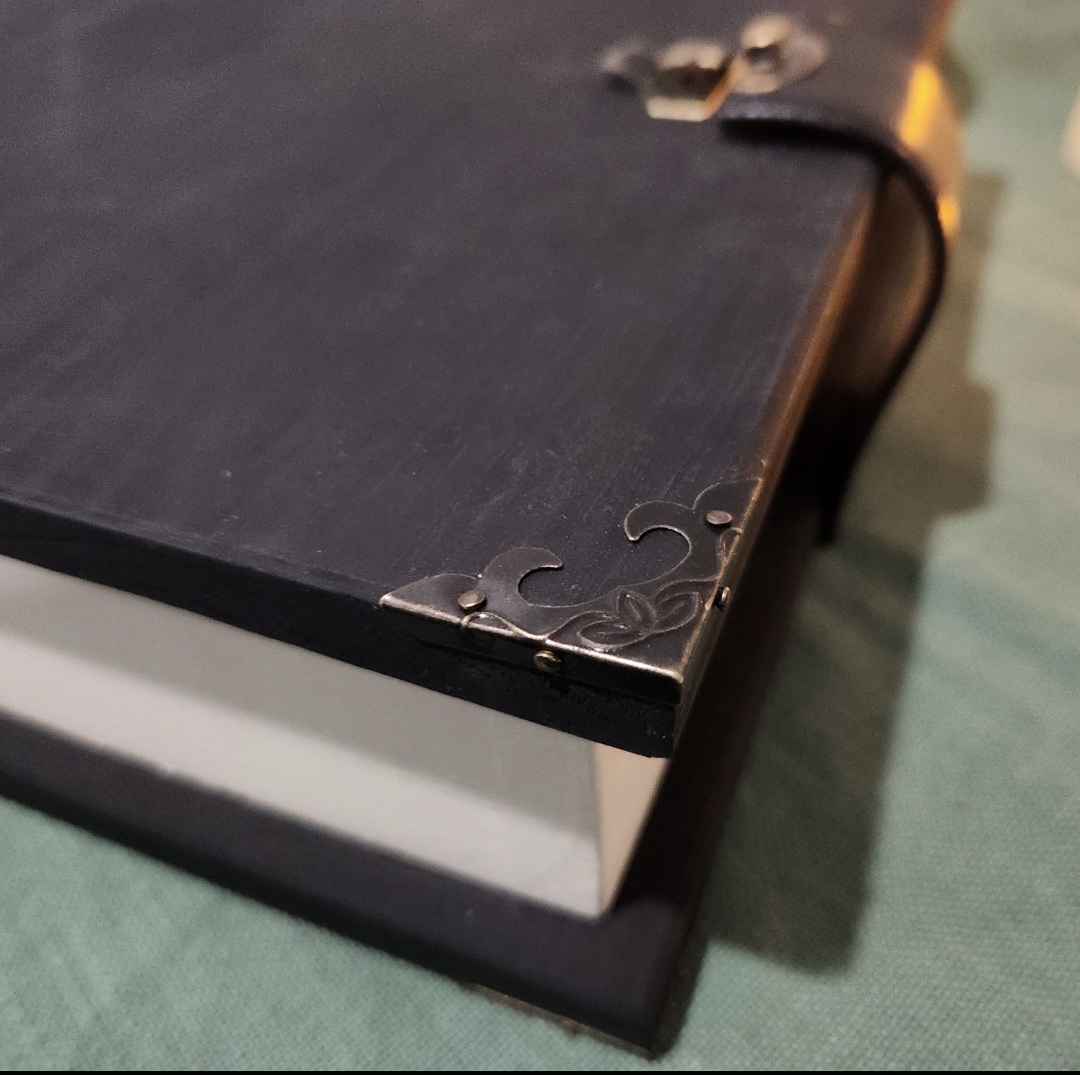 Decorative and functional! Made from wood with matte black and white paint and acrylic finish. Simplistic with old world charm. Decorative corner accents and working leather closure strap and latch. Perfect for stashing small items or adding to Halloween decor collection. A unique addition to any bookcase for keepsakes or adding a dash of whimsy to your memorabilia display.