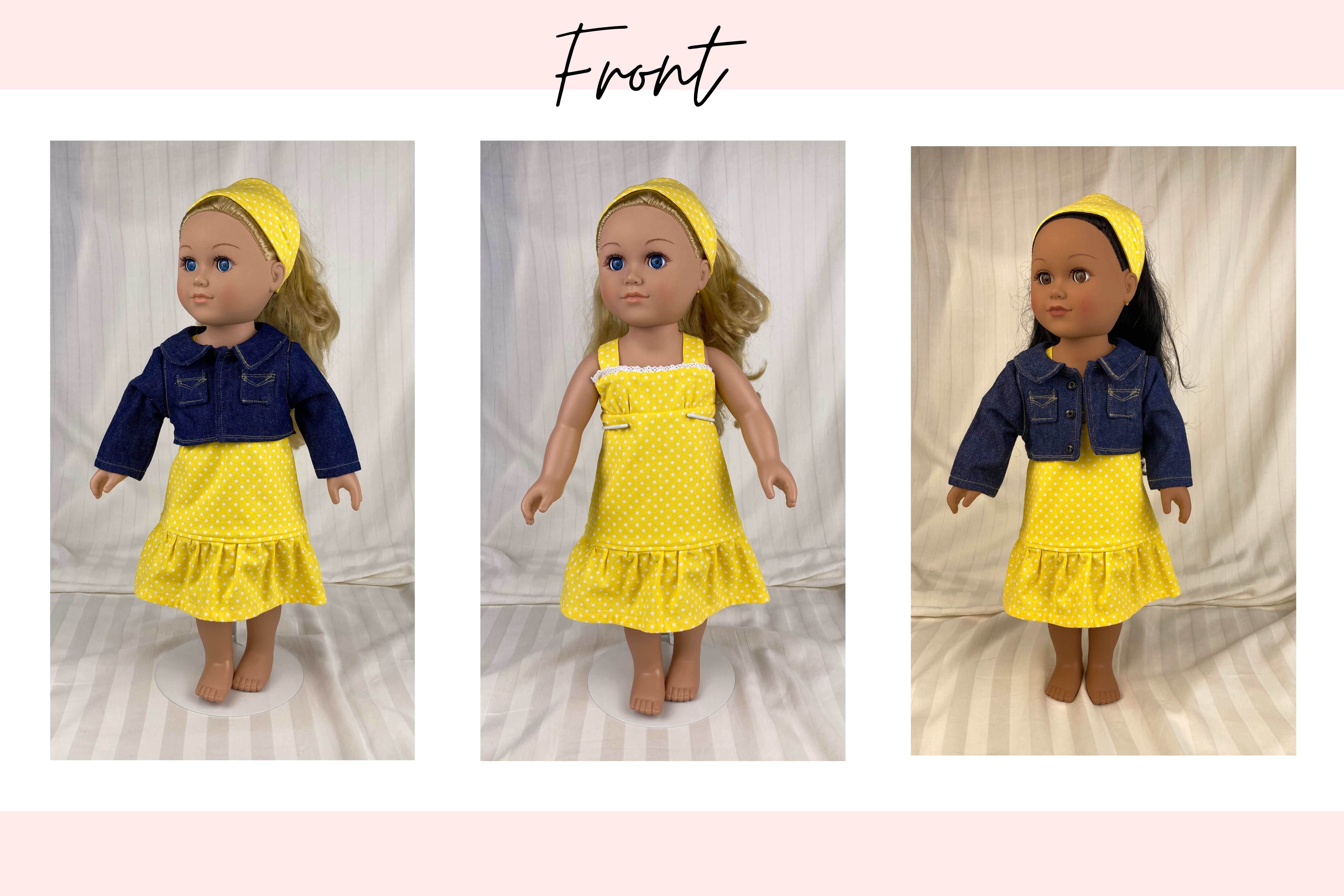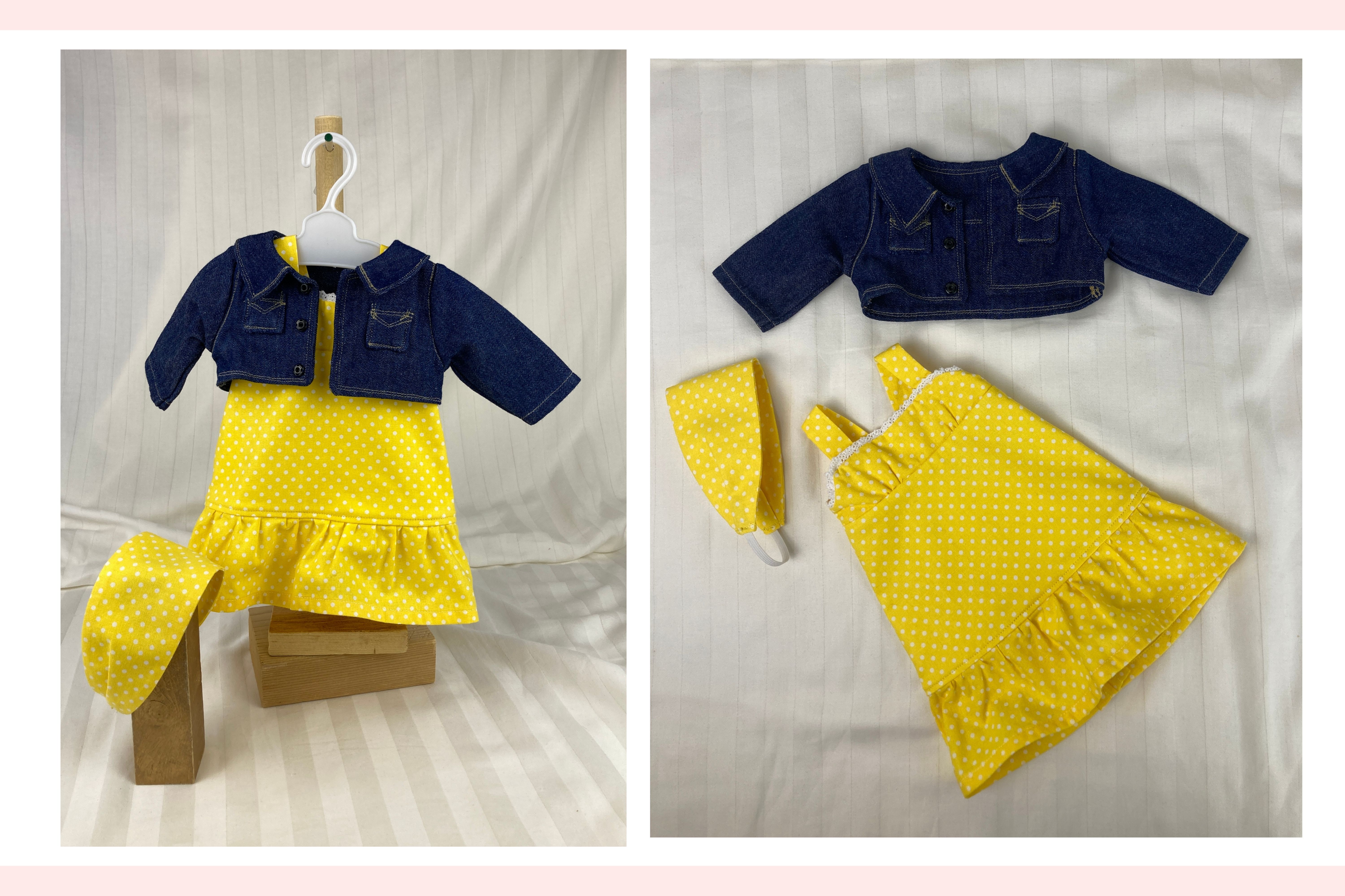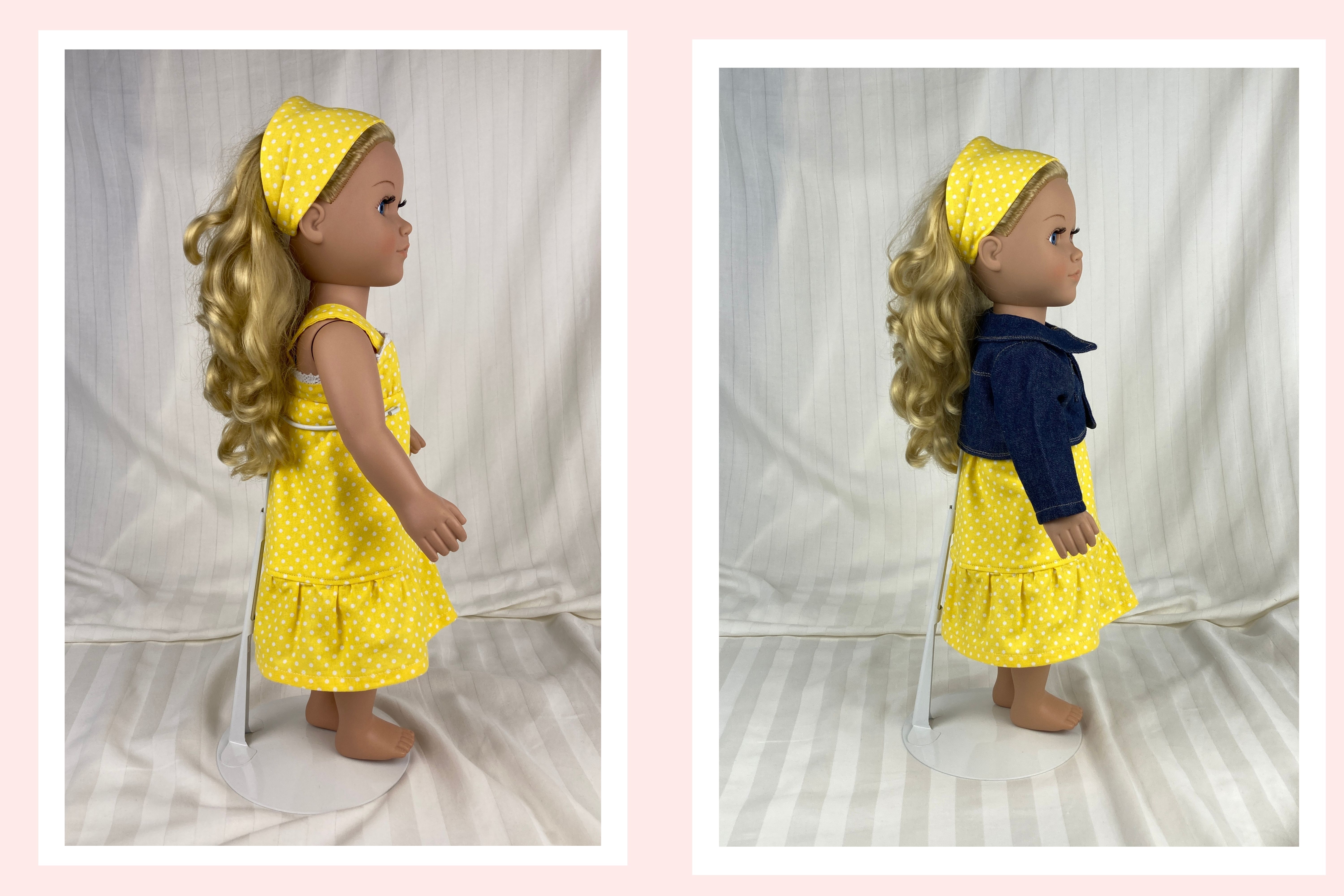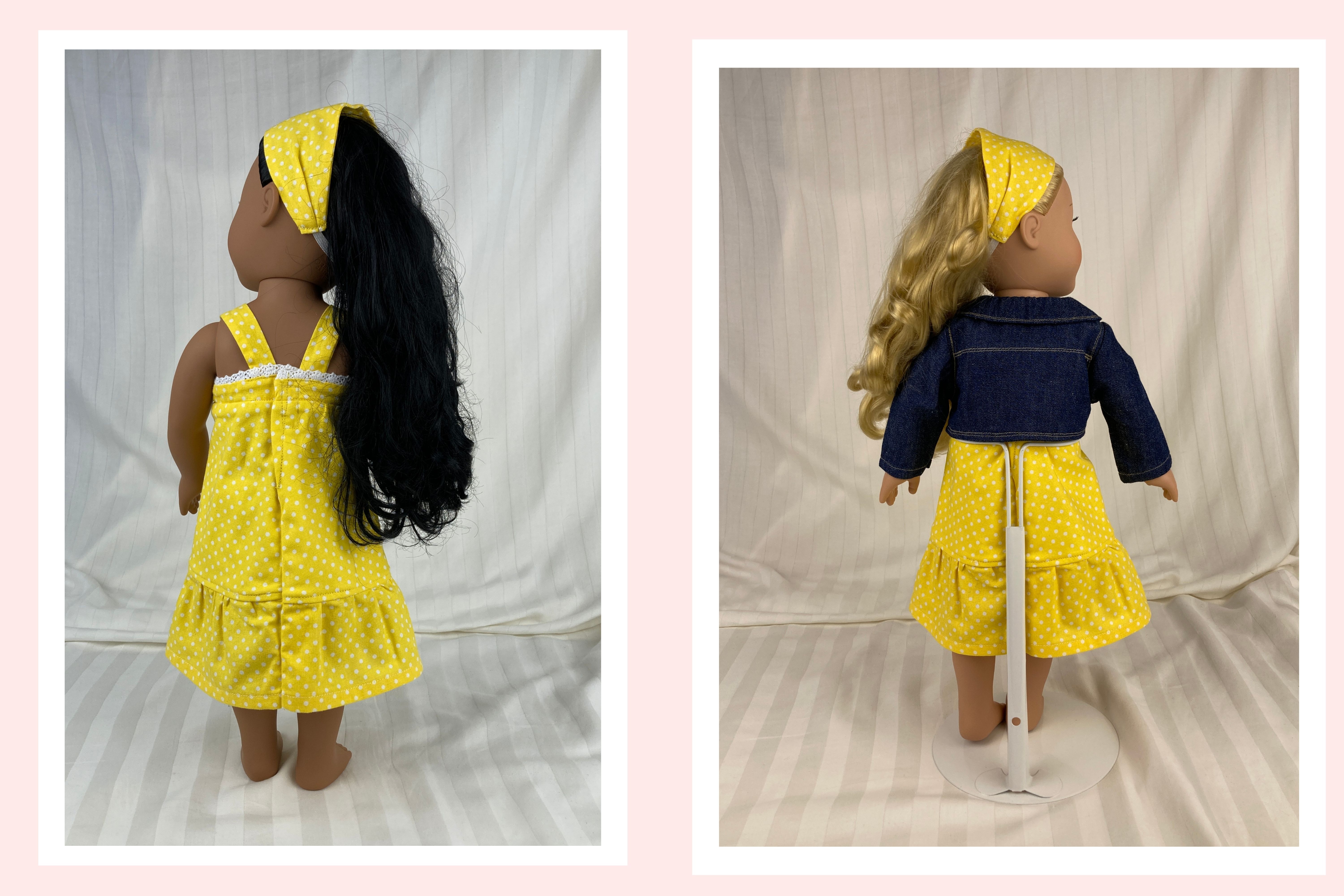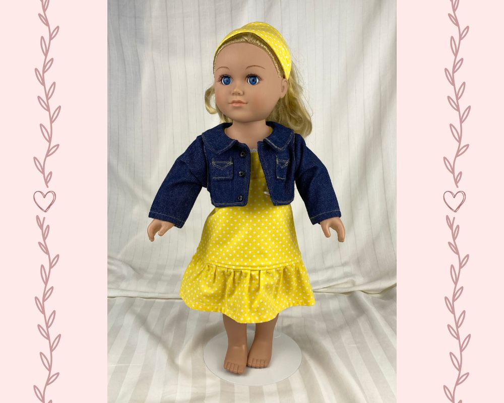 The sleeveless sundress is made from a bright, primary colored yellow and white mini polka dot cotton fabric print. The bodice is short waisted with a regency style waist and the yoke in front has tiny gatherings for darts. The skirt of the dress is a straight A-line that ends in a deep mid-calf ruffle. Both the bodice and skirt are lined. White crocheted lace edges the top edge of the bodice softening the energetic pop of the dress with a country feminine feel. The headband matches the sundress and is made deeper than usual to mimic a bandana style headband. The short/cropped denim jacket is made from a soft, dark blue denim fabric, is lined inside the body, and has contrasting top stitching just like the human version. The sleeves are long and the jacket has a nice collar that also features the top stitching, as well as two front pockets that could be used to hold a very tiny item! The black metal snaps in front mean this jacket can also be worn closed or open! This outfit is sure to become a staple in your dolls wardrobe for years to come.
