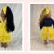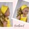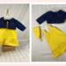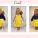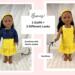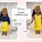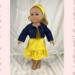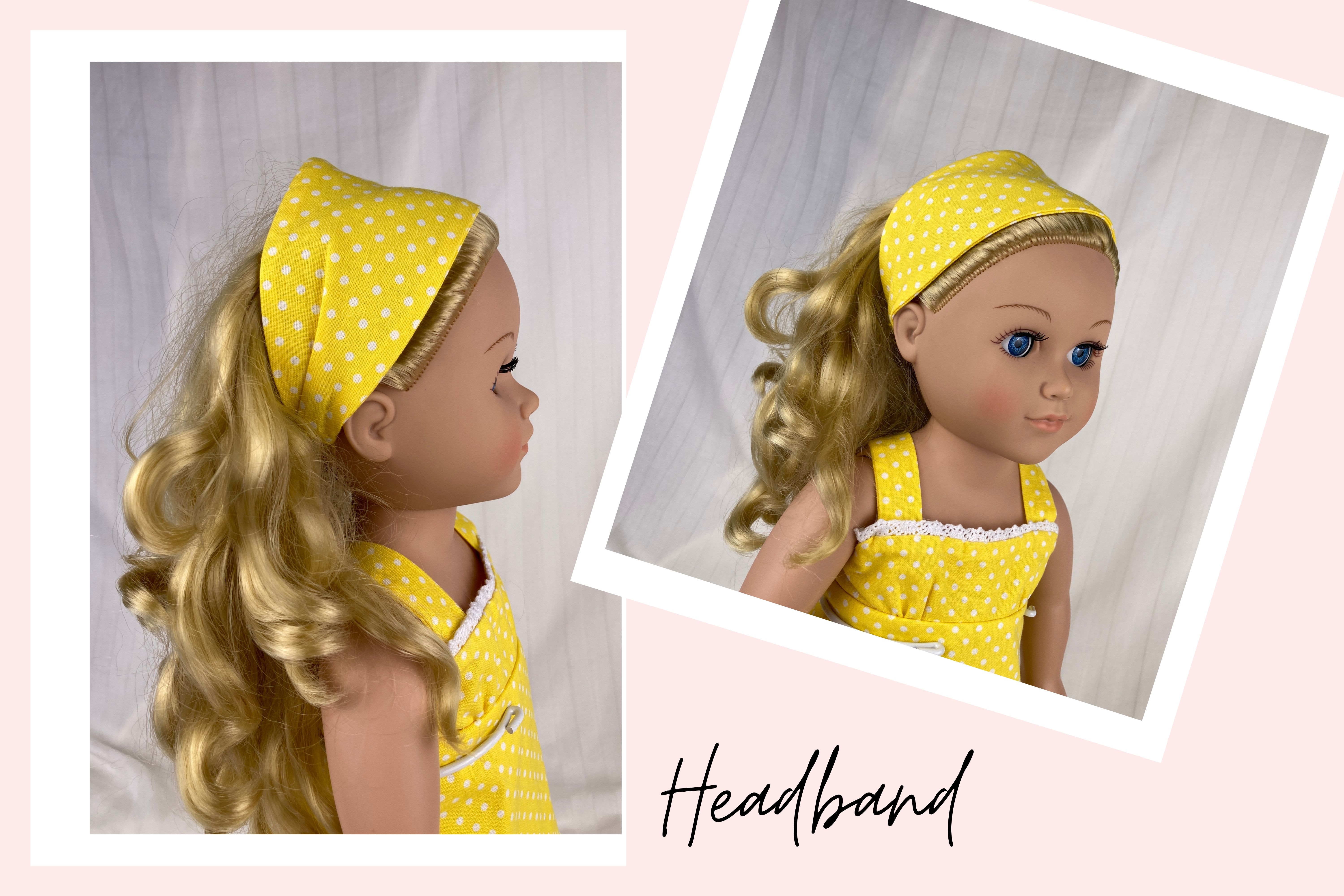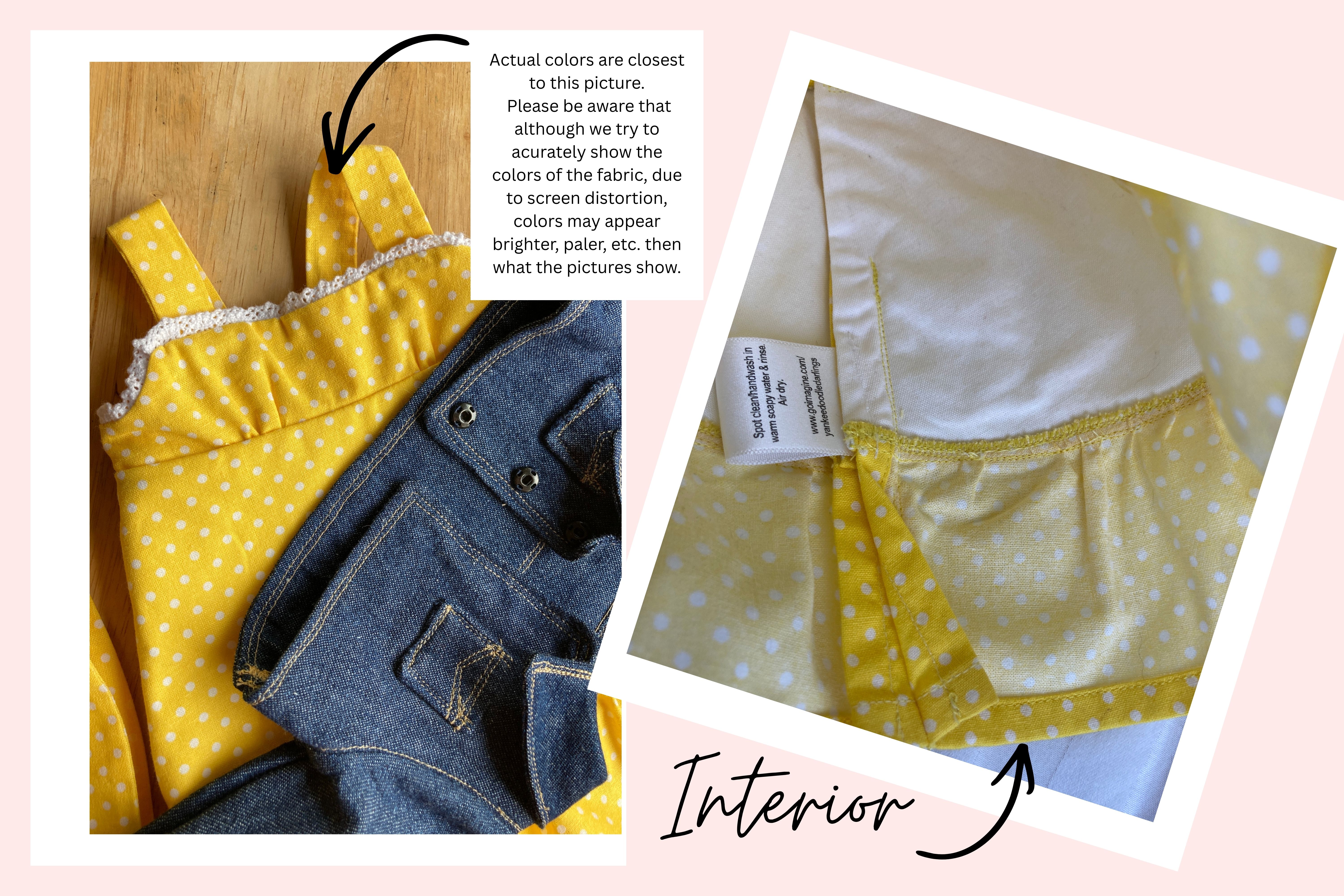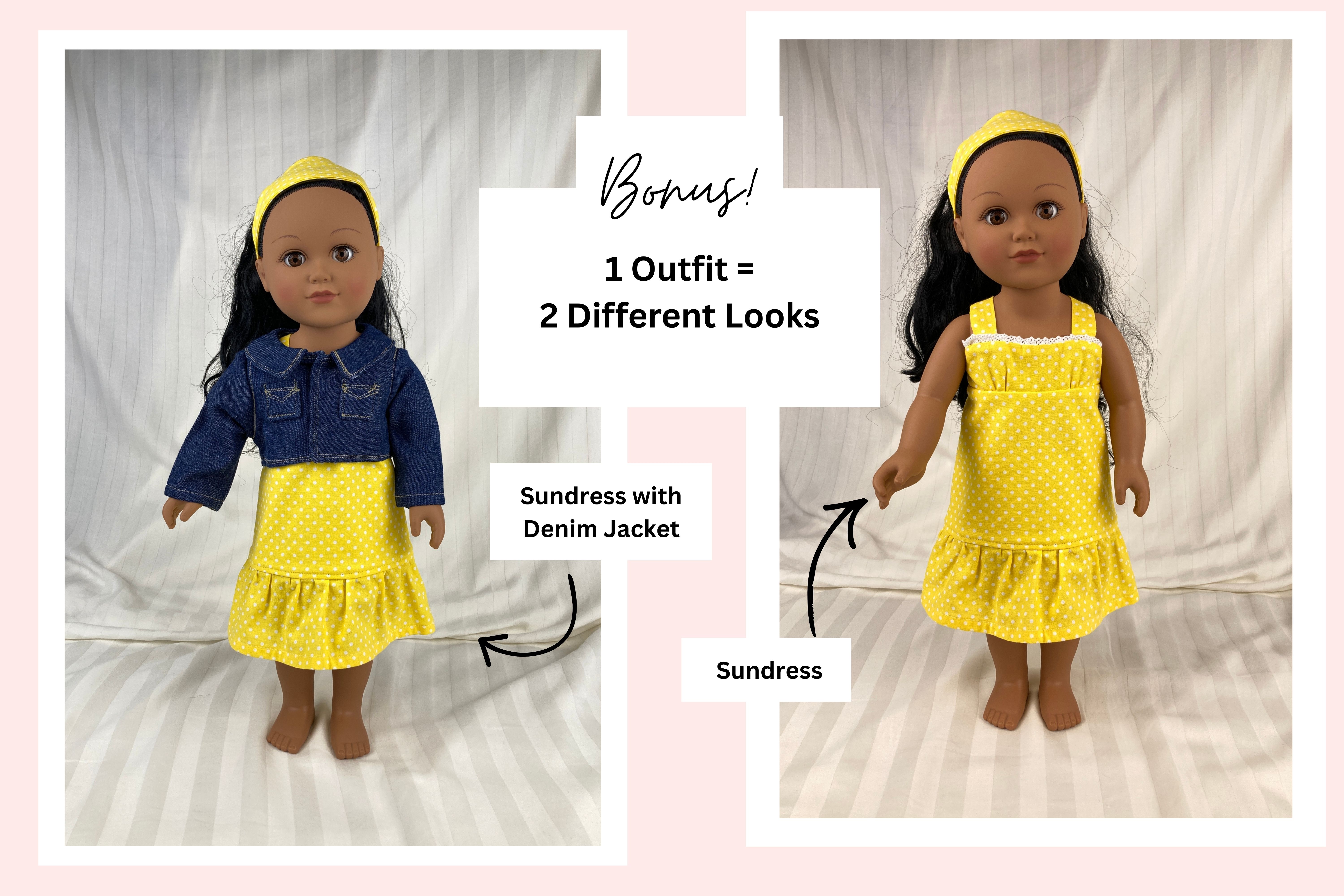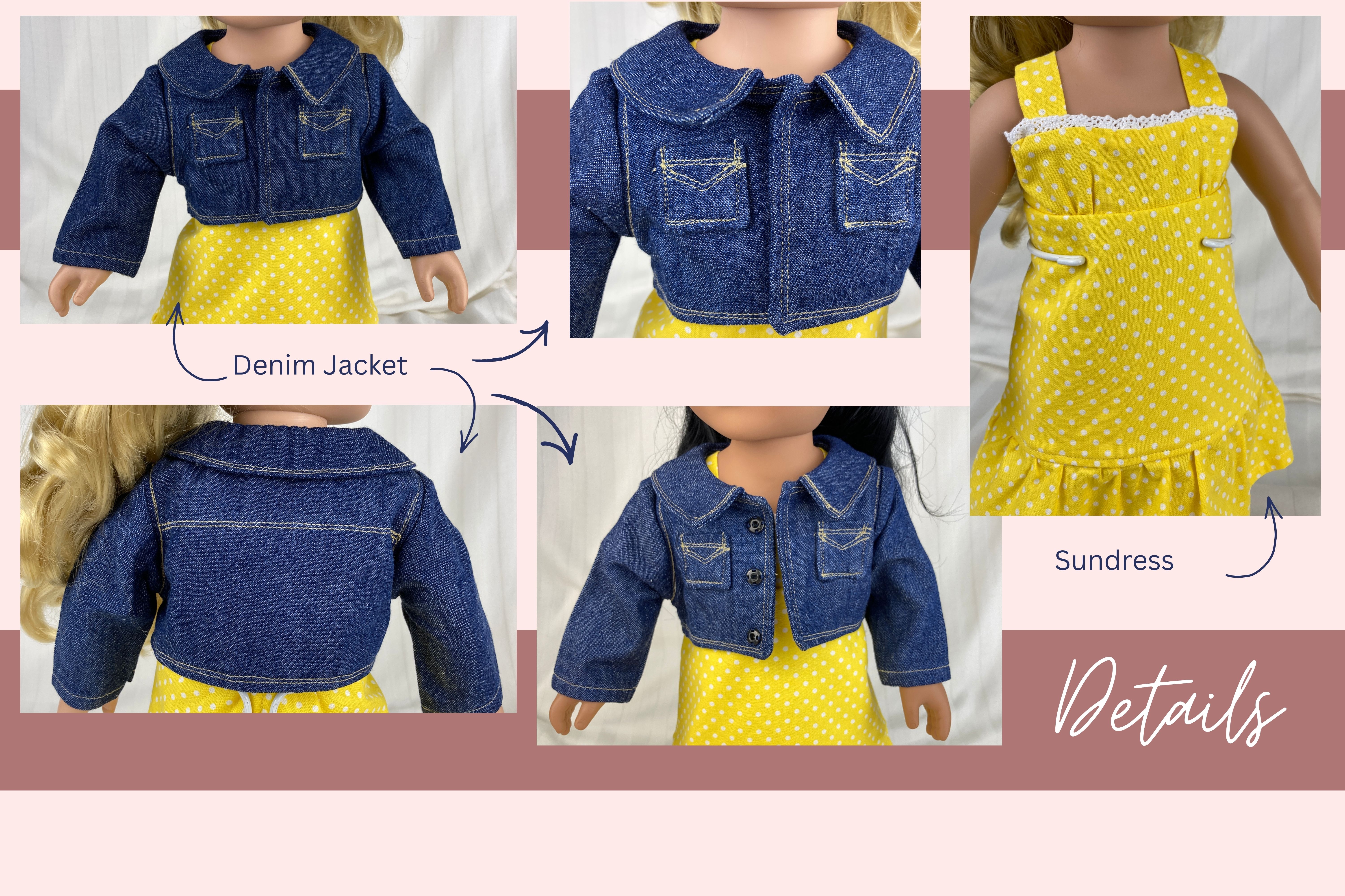 The sleeveless sundress is made from a bright, primary colored yellow and white mini polka dot cotton fabric print. The bodice is short waisted with a regency style waist and the yoke in front has tiny gatherings for darts. The skirt of the dress is a straight A-line that ends in a deep mid-calf ruffle. Both the bodice and skirt are lined. White crocheted lace edges the top edge of the bodice softening the energetic pop of the dress with a country feminine feel. The headband matches the sundress and is made deeper than usual to mimic a bandana style headband. The short/cropped denim jacket is made from a soft, dark blue denim fabric, is lined inside the body, and has contrasting top stitching just like the human version. The sleeves are long and the jacket has a nice collar that also features the top stitching, as well as two front pockets that could be used to hold a very tiny item! The black metal snaps in front mean this jacket can also be worn closed or open! This outfit is sure to become a staple in your dolls wardrobe for years to come.