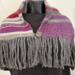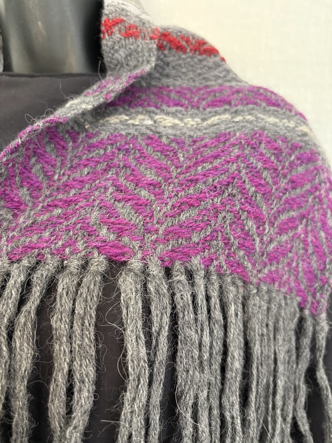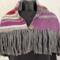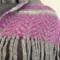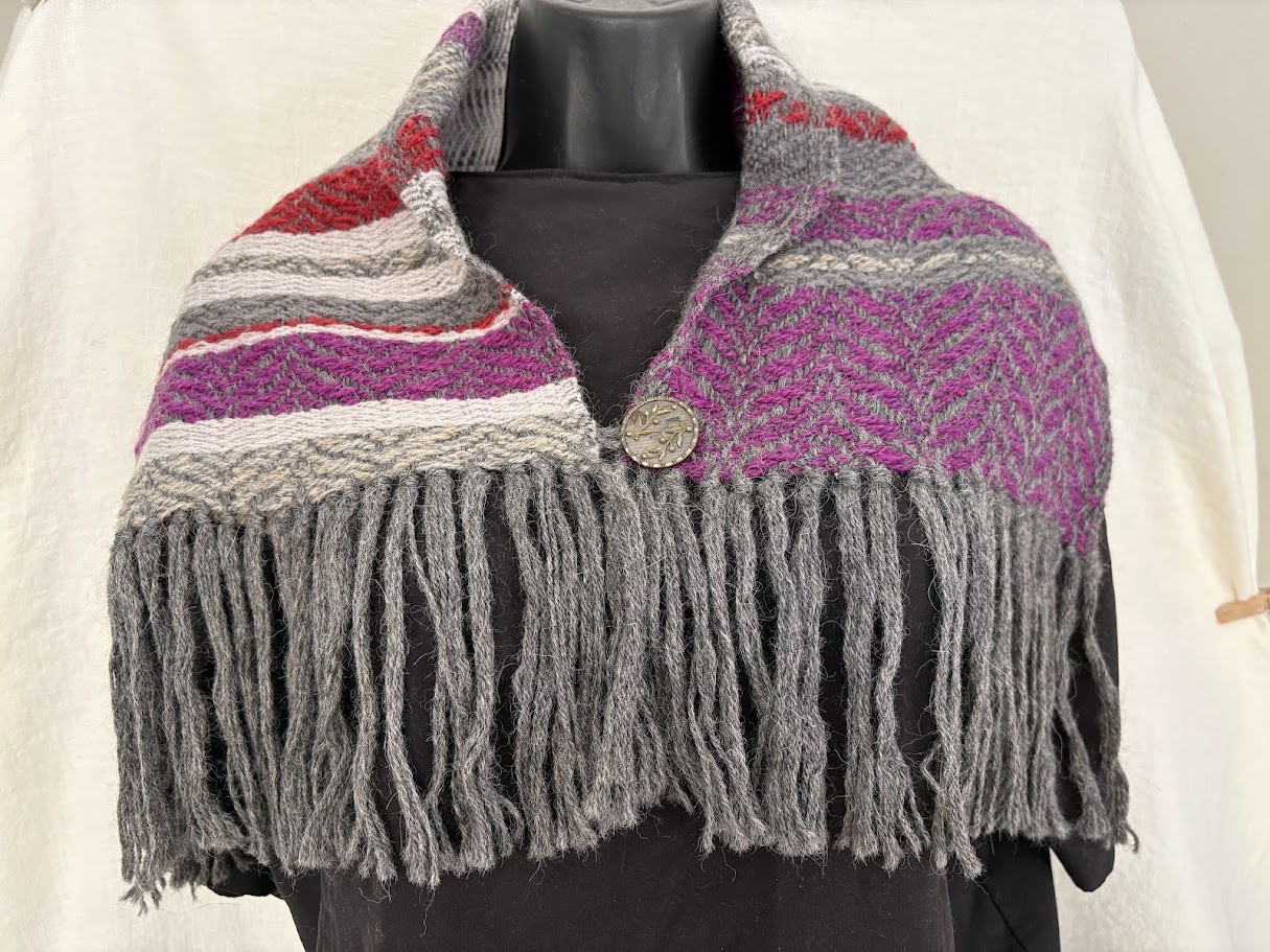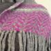 A colorful fuchsia, grey, and white cowl woven in alpaca and wool.