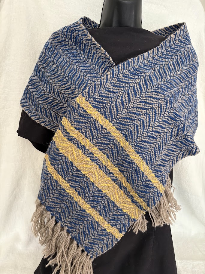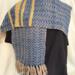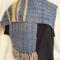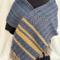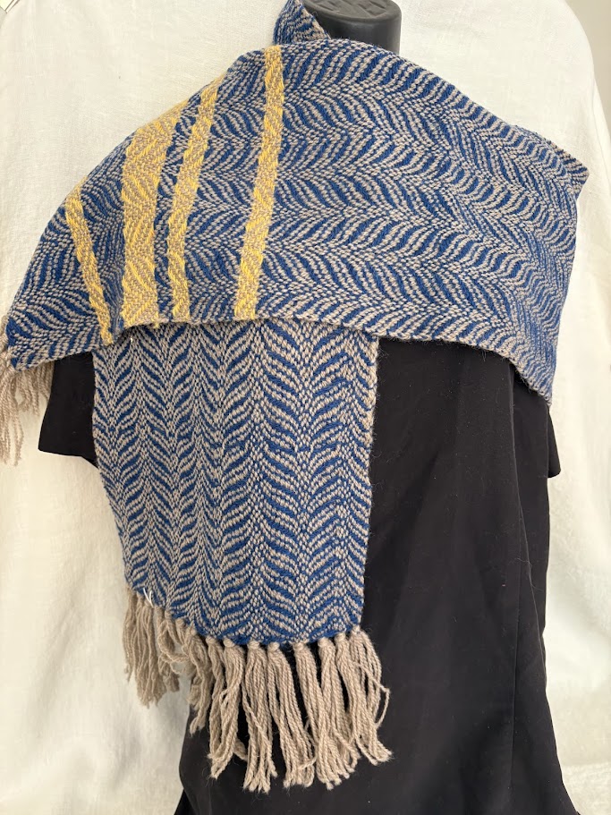 Wrap up in this warm and comfy blue and grey wool scarf with gold contrast in a lovely twill pattern.