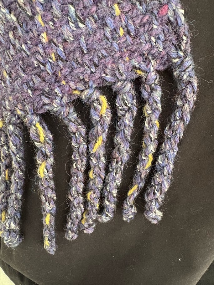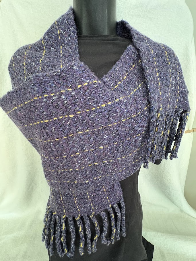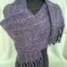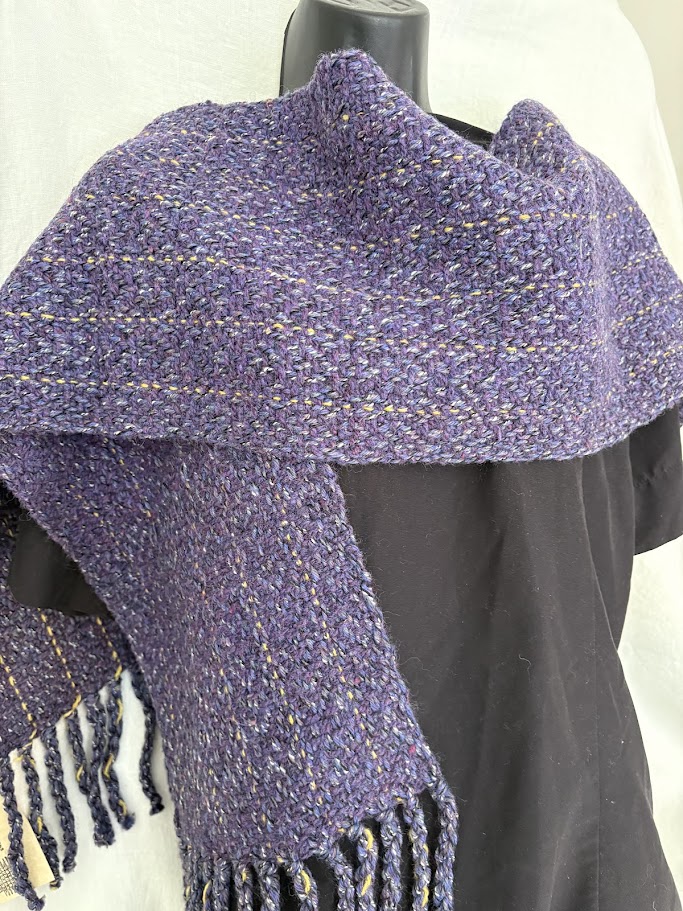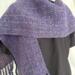 Wrap up in this cozy, soft wool scarf in lavender with hints of yellow for contrast.