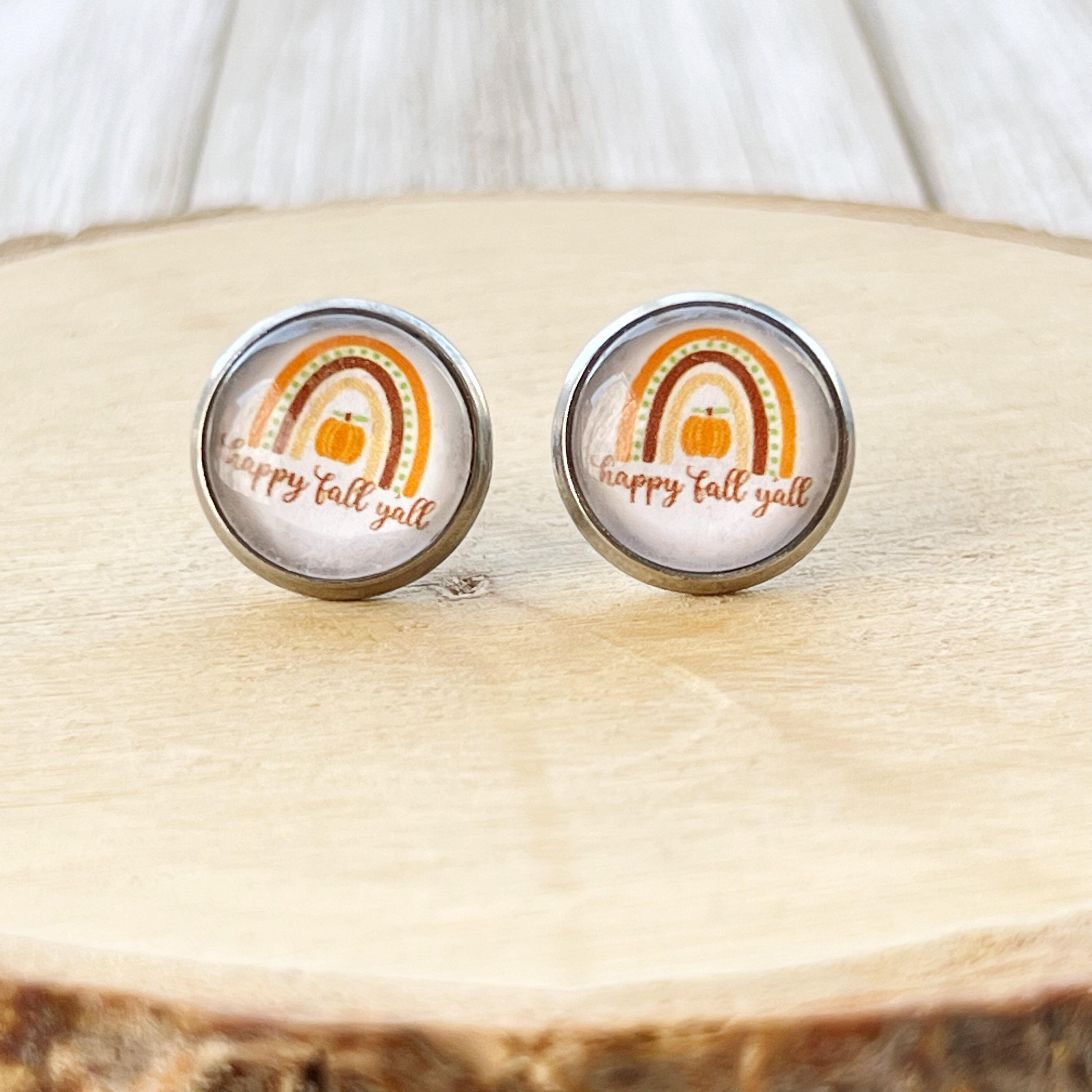 Stud earrings with a Fall Rainbow Pumpkin design. They say “Happy Fall Y’all.” They make a perfect choice as an accessory for Thanksgiving and Fall. These earrings are made from Silver toned Stainless Steel Posts and measure approximately 12mm in diameter. They are light weight, which makes them perfect for all day wear.