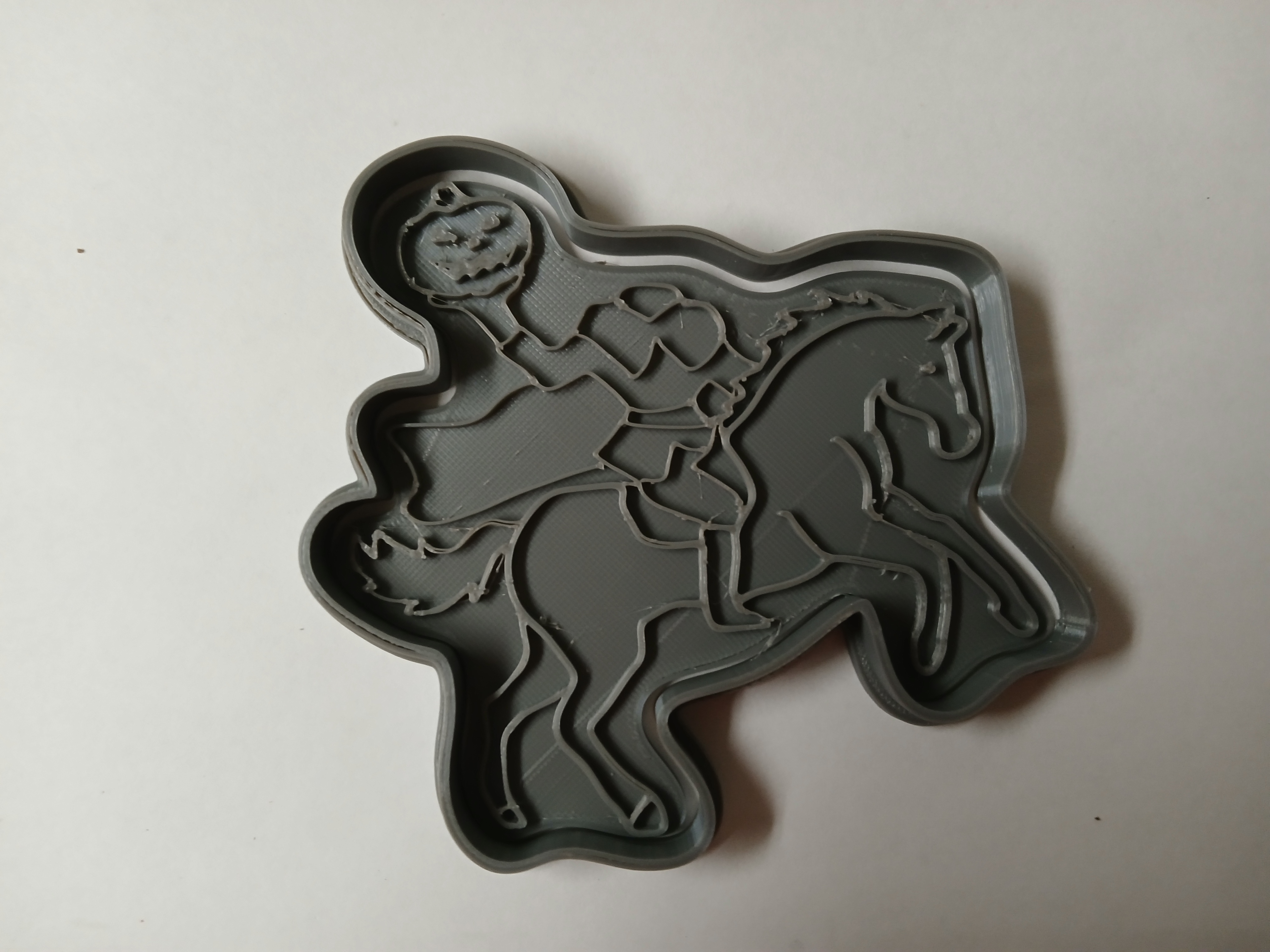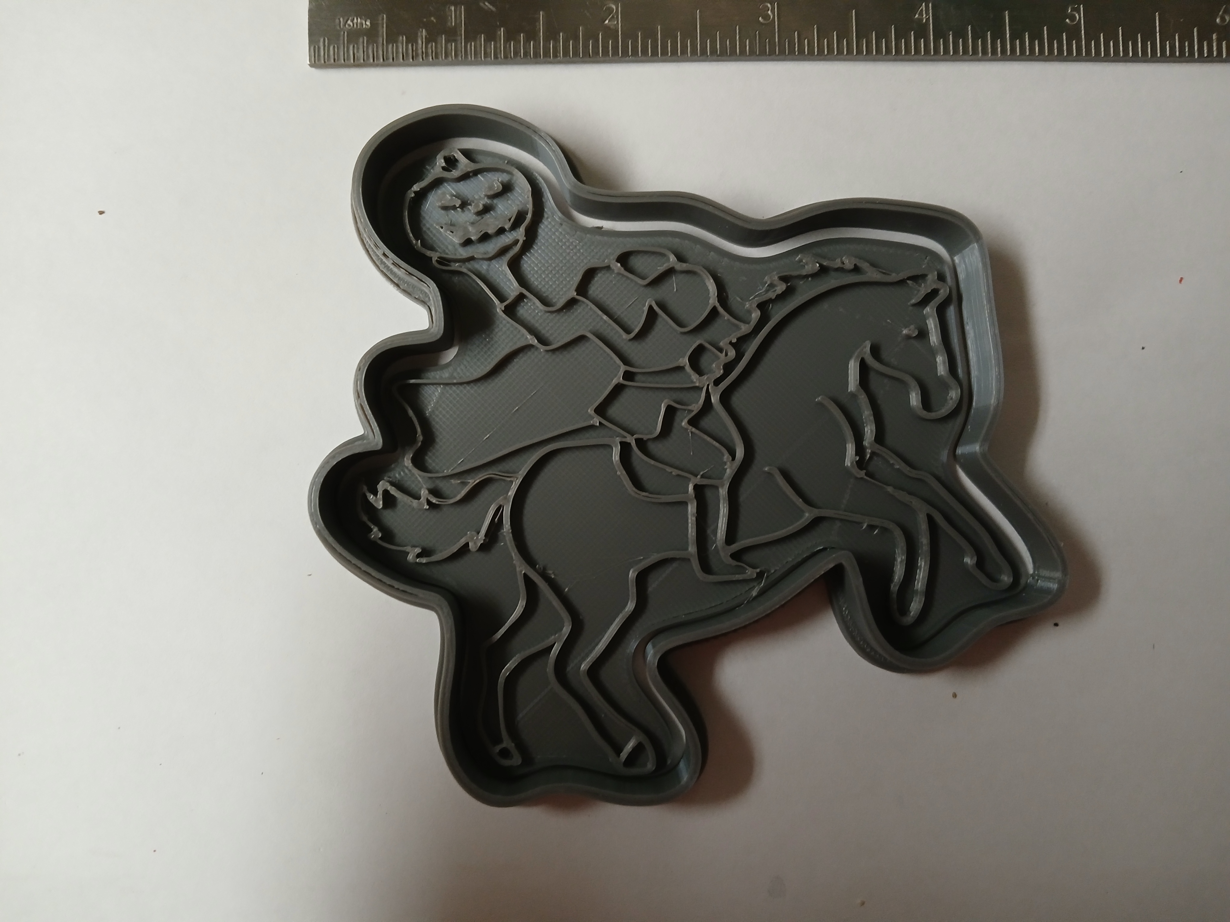 The legend of the Headless Horseman lives on in this one of a kind cookie cutter. Designed with a passion for the story of Icabod Crane and the Headless Horse, this piece would be an awesome addition to any cookie cutter collection or an excellent conversation starter for your next bake sale. The cookie cutter and cookie stamp are made separately with the stamp having a handle on the back for easy removal from the dough.