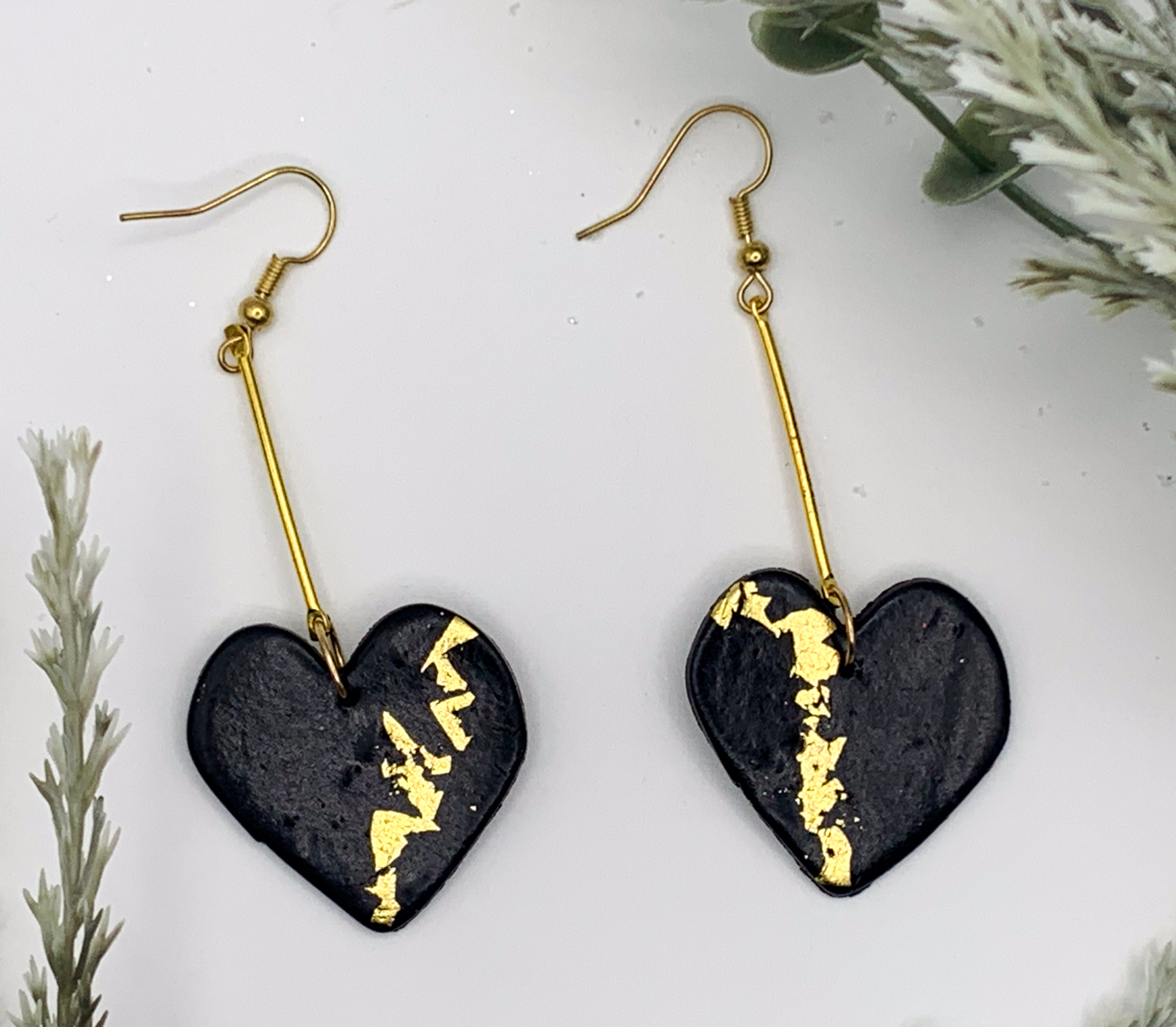 Show your love with these chic heart-shaped earrings! Black clay hearts are accented with bold gold foil and a sleek bar for a modern romantic vibe.