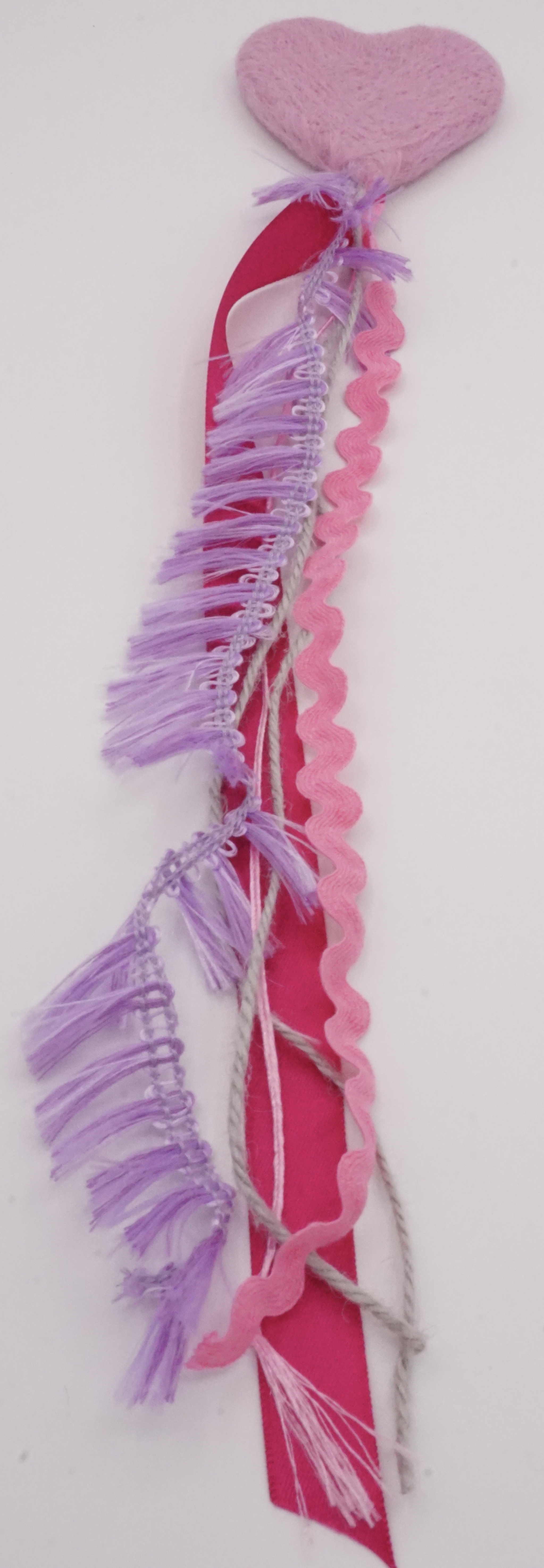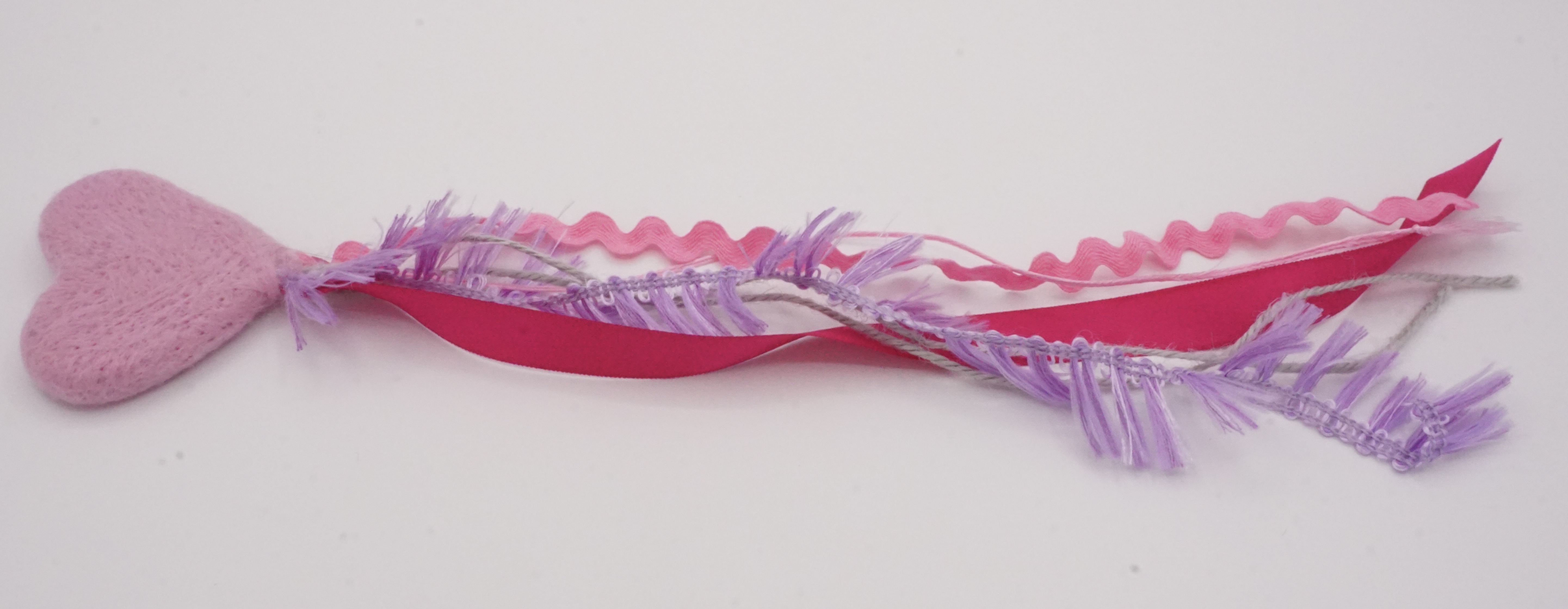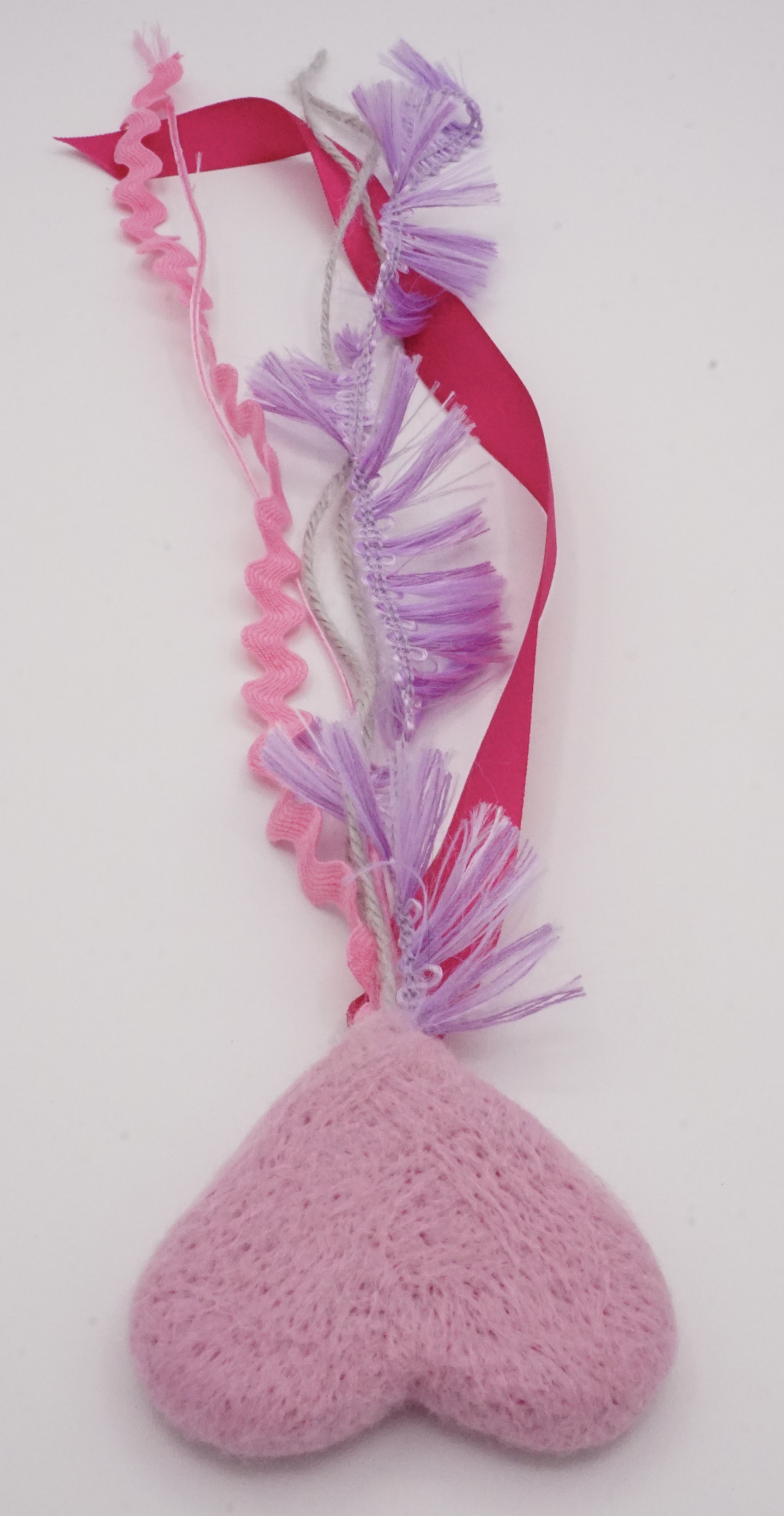 Your friendly feline is going to love playing with the Heart & Strings Toy. As you make movement while holding the heart in your hand, your silly little meow master will pounce towards the strings in anticipation for a win! The felted heart has a vibrant tassel composed of twine & a mix of ribbons that are attached to give it flair and movement. The heart is needle felted and it is made of 100% wool. A bell is placed within the felt heart to make a sound when rattled to capture your cats attention when playtime is initiated. This is perfect gift for the perfect cat in your life.