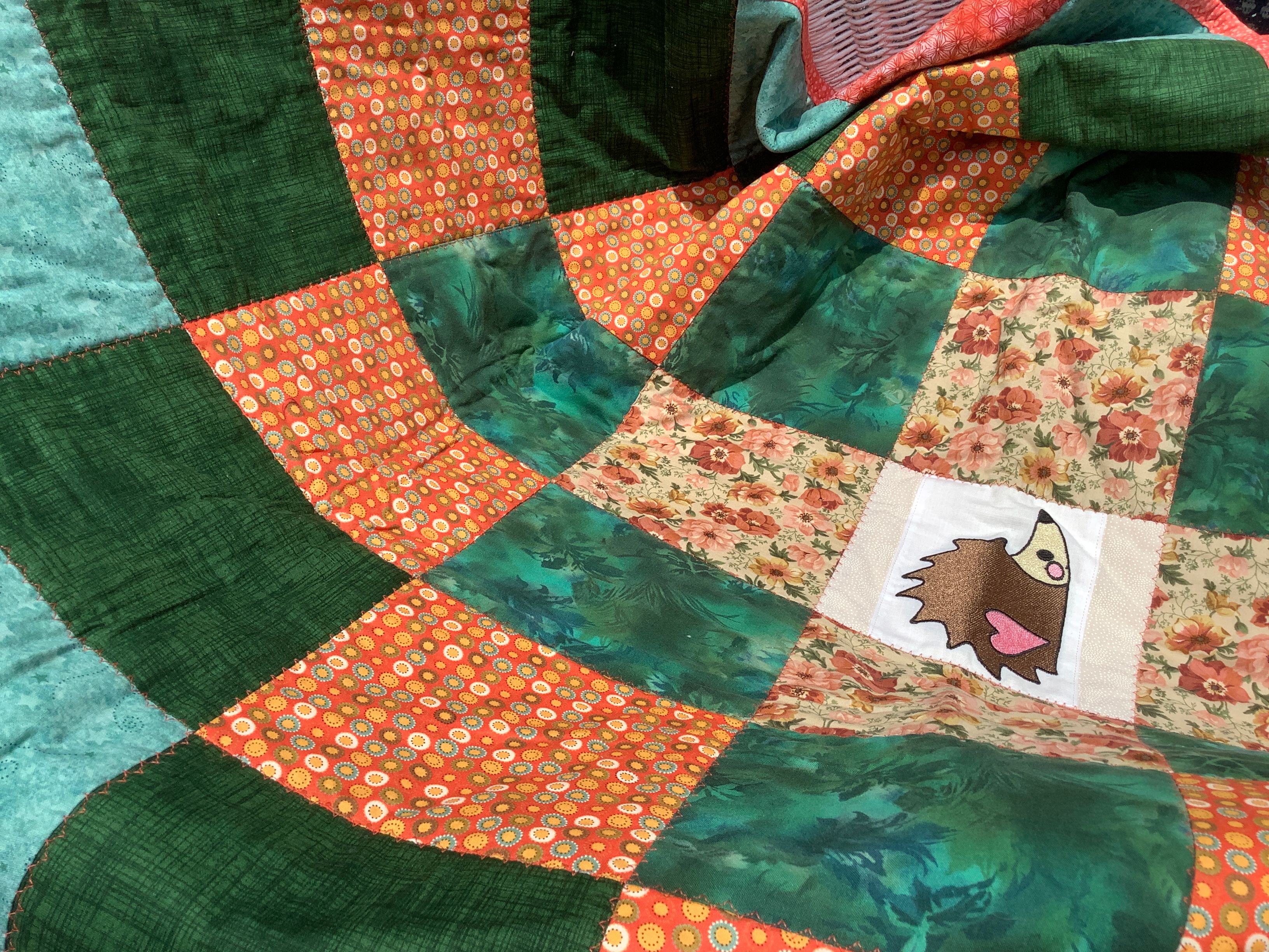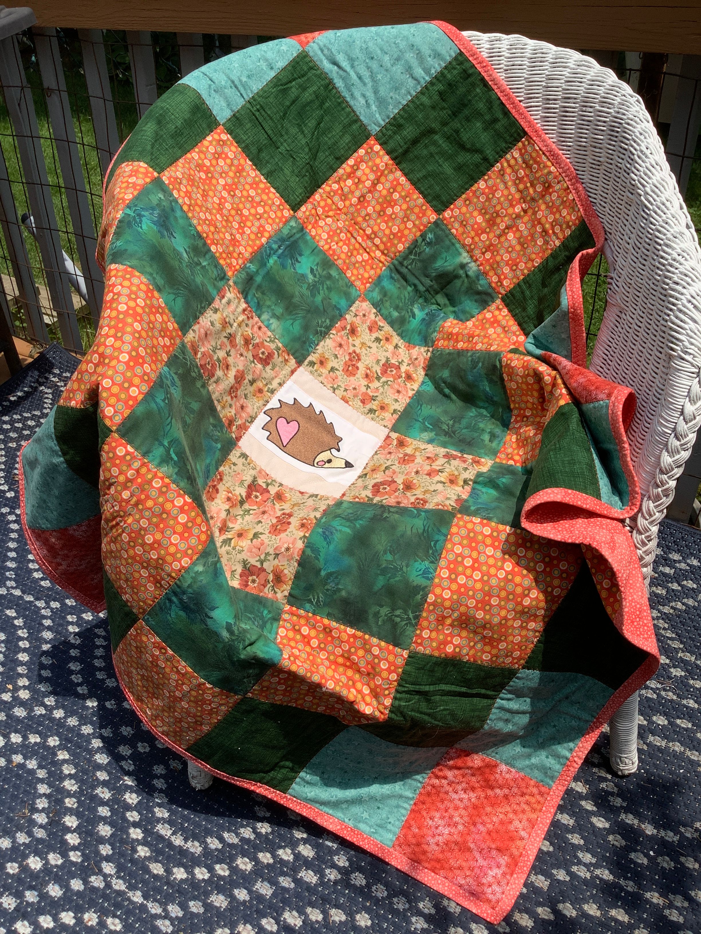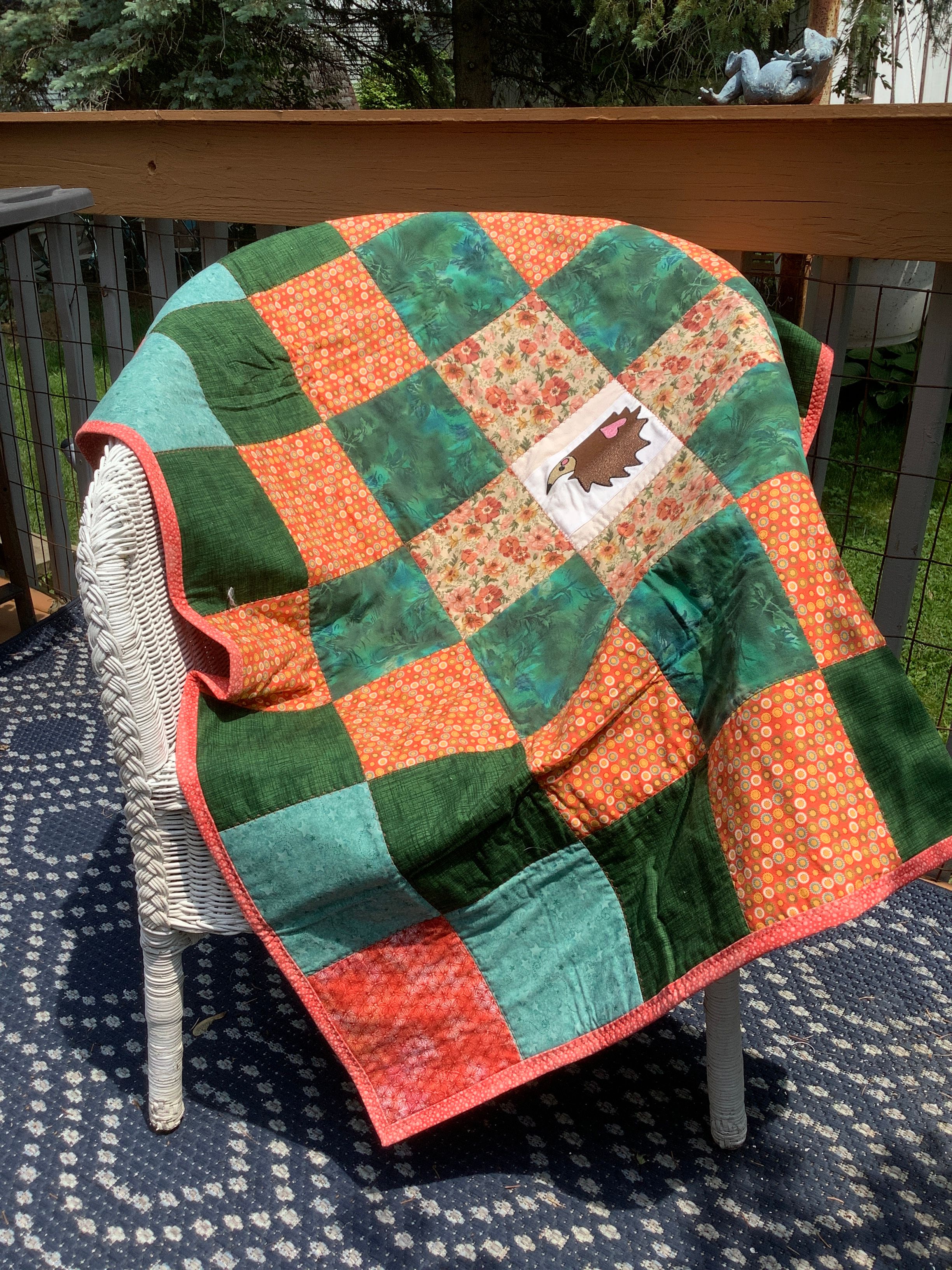 Beautiful cotton quilt in colors of green and rust – Squares make diagonal rows in 5 different prints – Suprise! In the center is a machine embroidered Hedgehog, so cute! – It is backed in a fun melon colored fabric with polka dots and light blotches