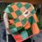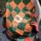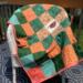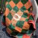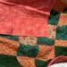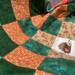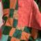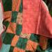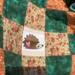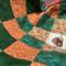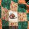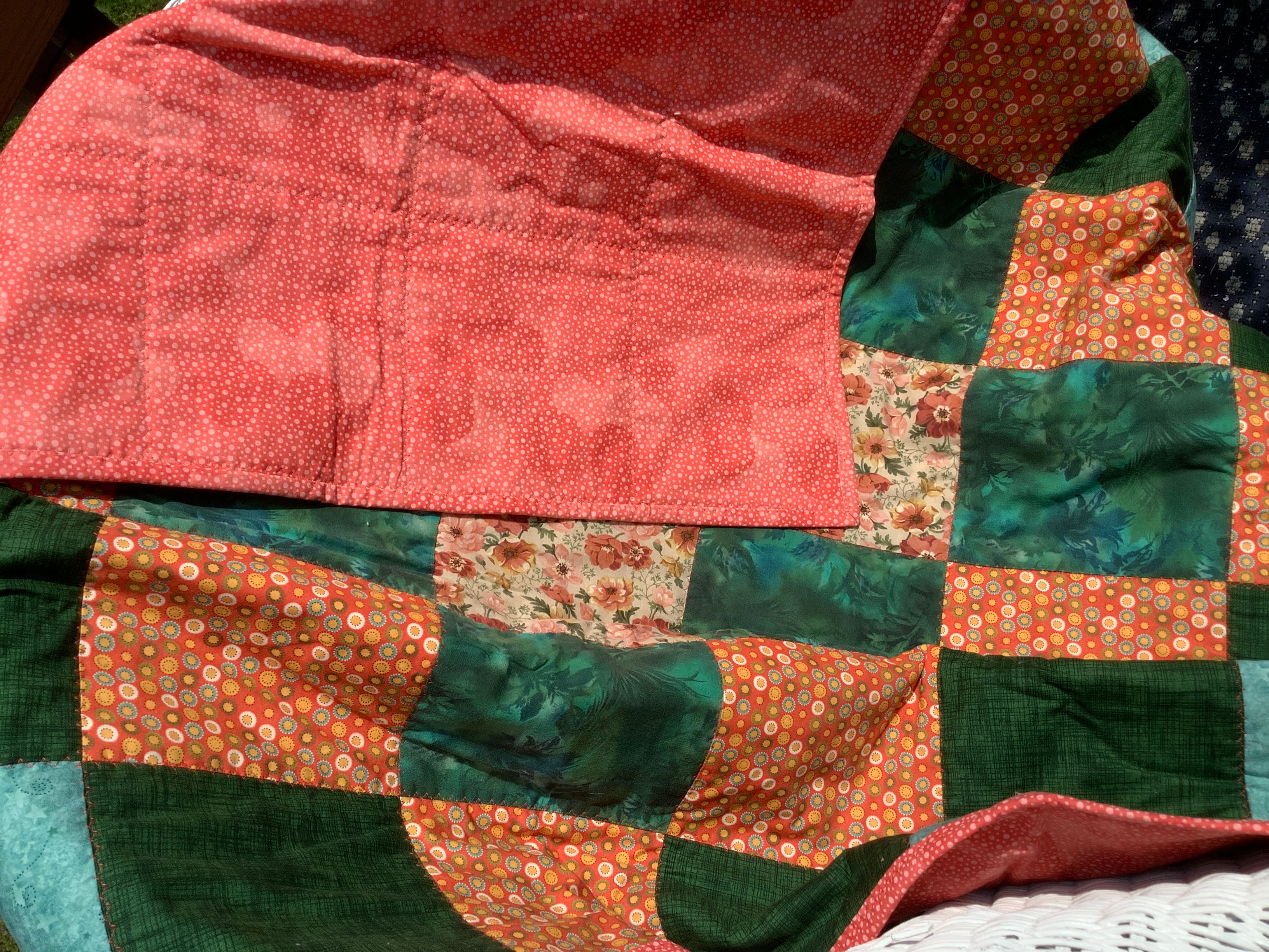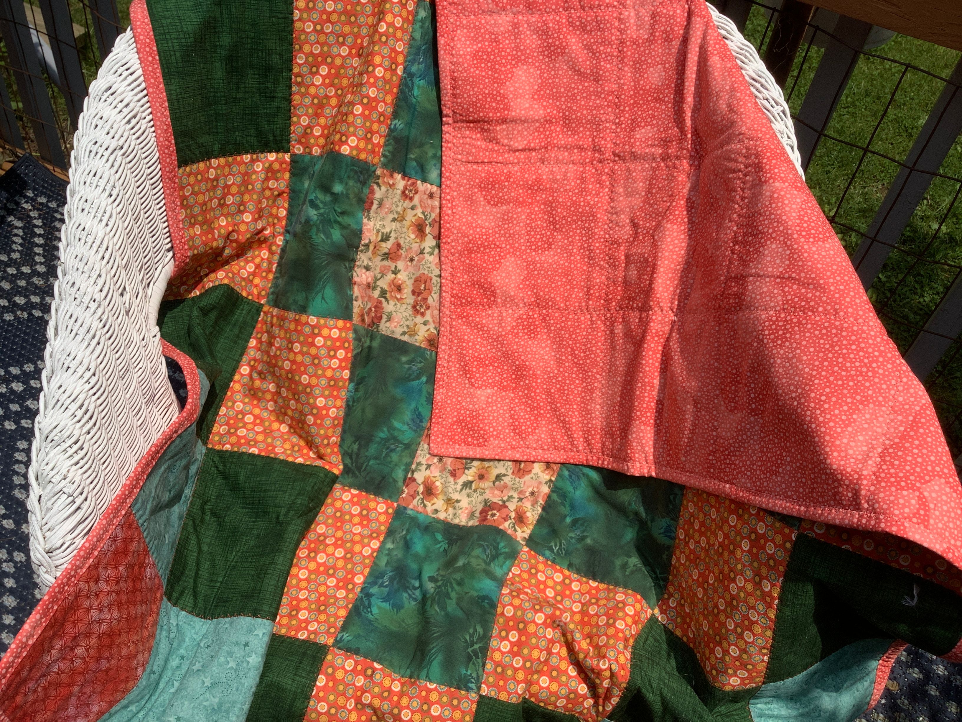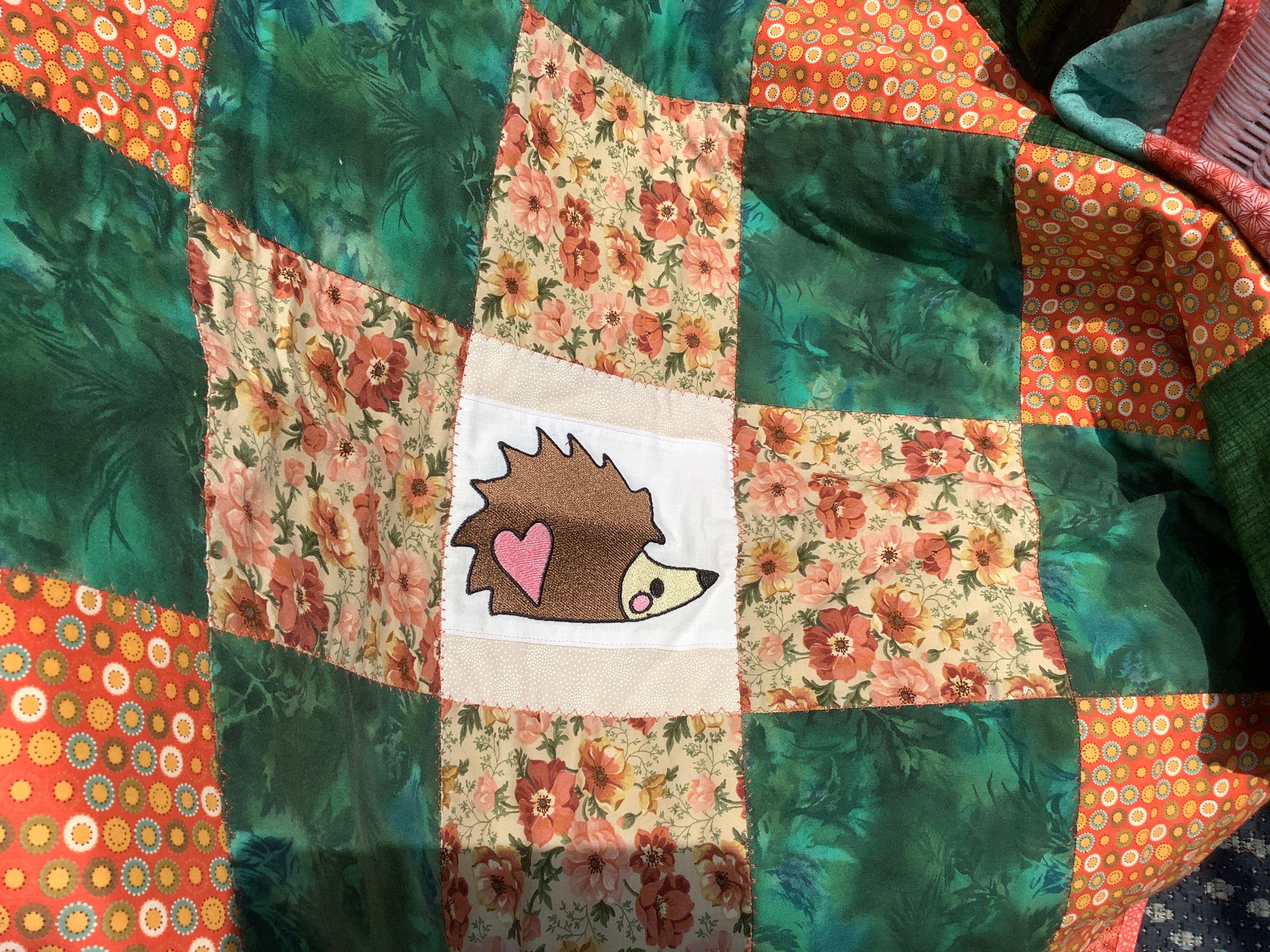 Beautiful cotton quilt in colors of green and rust – Squares make diagonal rows in 5 different prints – Suprise! In the center is a machine embroidered Hedgehog, so cute! – It is backed in a fun melon colored fabric with polka dots and light blotches
