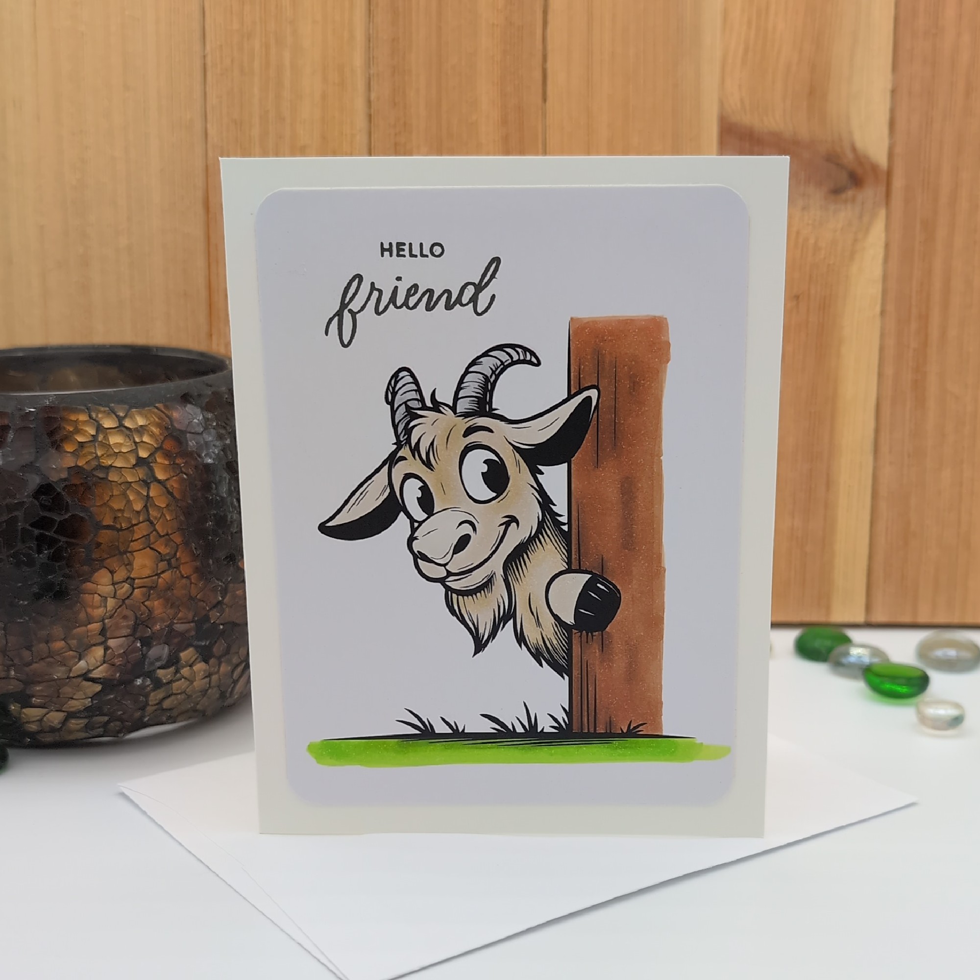 This handmade greeting card features a friendly goat with curved horns and a tufted chin, peeking out from behind a rustic wooden post. Colored with alcohol markers for rich, expressive detail, the front reads “HELLO friend” in a mix of bold and cursive script. The inside is blank, giving you space to share a warm greeting, a note of encouragement, or a spontaneous smile. Whimsical and versatile, this card is perfect for all occasions and seasons of life.