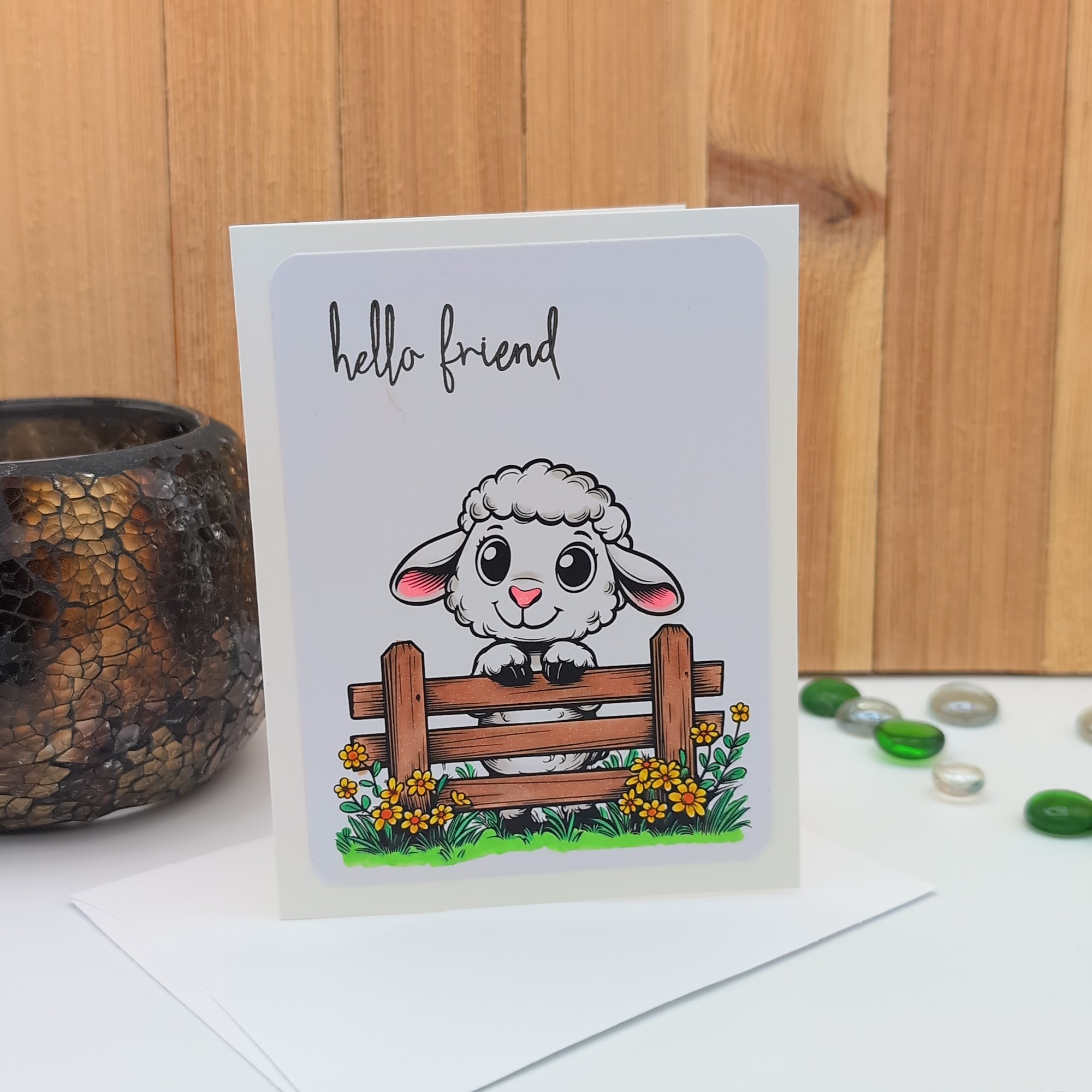 This handmade greeting card features a cheerful sheep with pink ears and a tuft of wool, leaning over a rustic fence surrounded by wildflowers. Colored with alcohol markers for soft, expressive detail, the front reads “hello friend” in casual script. The inside is blank, giving you space to share a warm greeting, a note of encouragement, or a spontaneous smile. Whimsical and versatile, this card is perfect for all occasions and seasons of life.