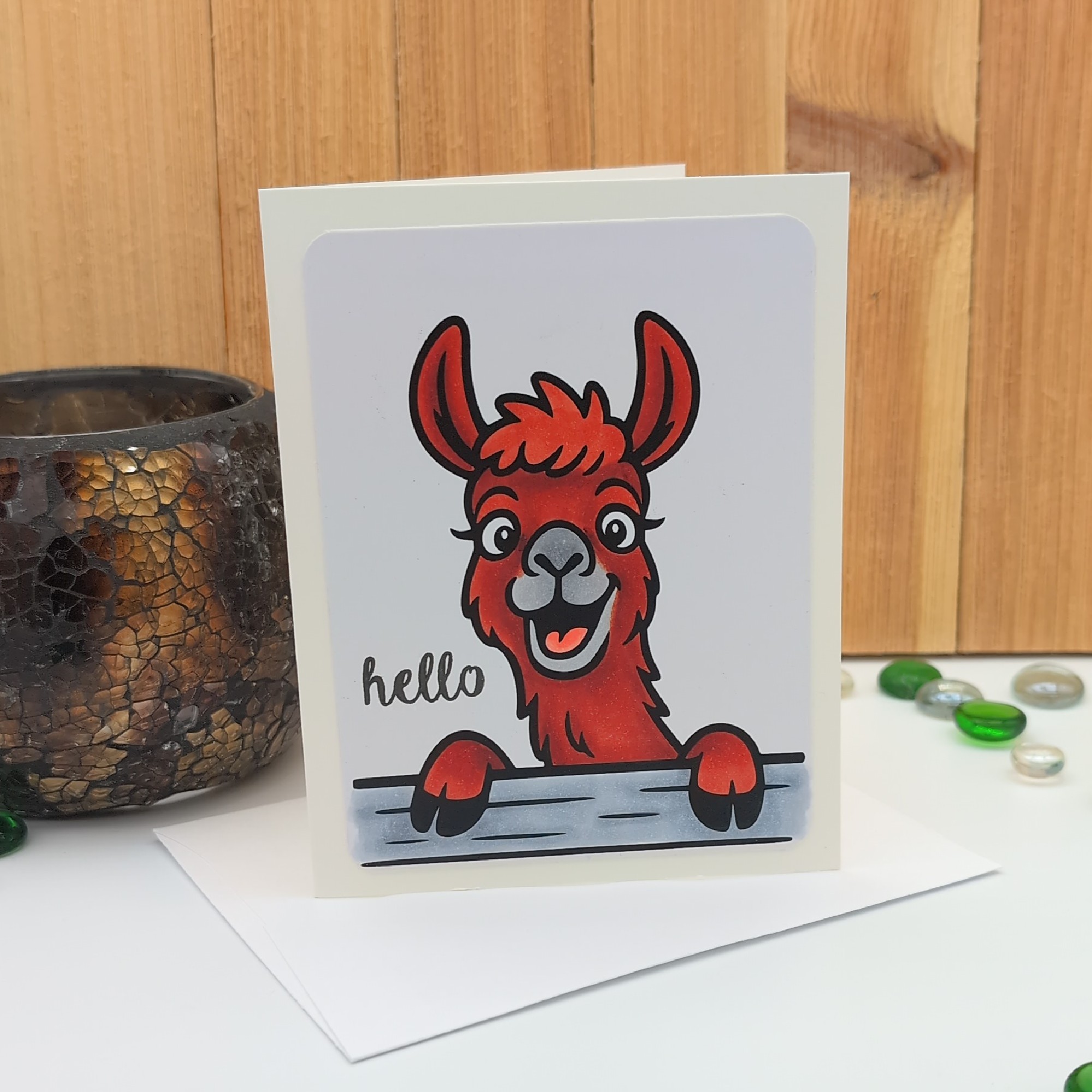 Brighten someone’s day with this handmade llama greeting card, featuring a playful red llama peeking over a rustic fence. Colored with alcohol markers for rich detail and charm, the front reads “hello” in casual script. The inside is blank, giving you space to personalize your message—whether it’s a note of encouragement, a friendly check-in, or a spontaneous smile. This card blends whimsy and warmth, making it a versatile choice for all occasions.