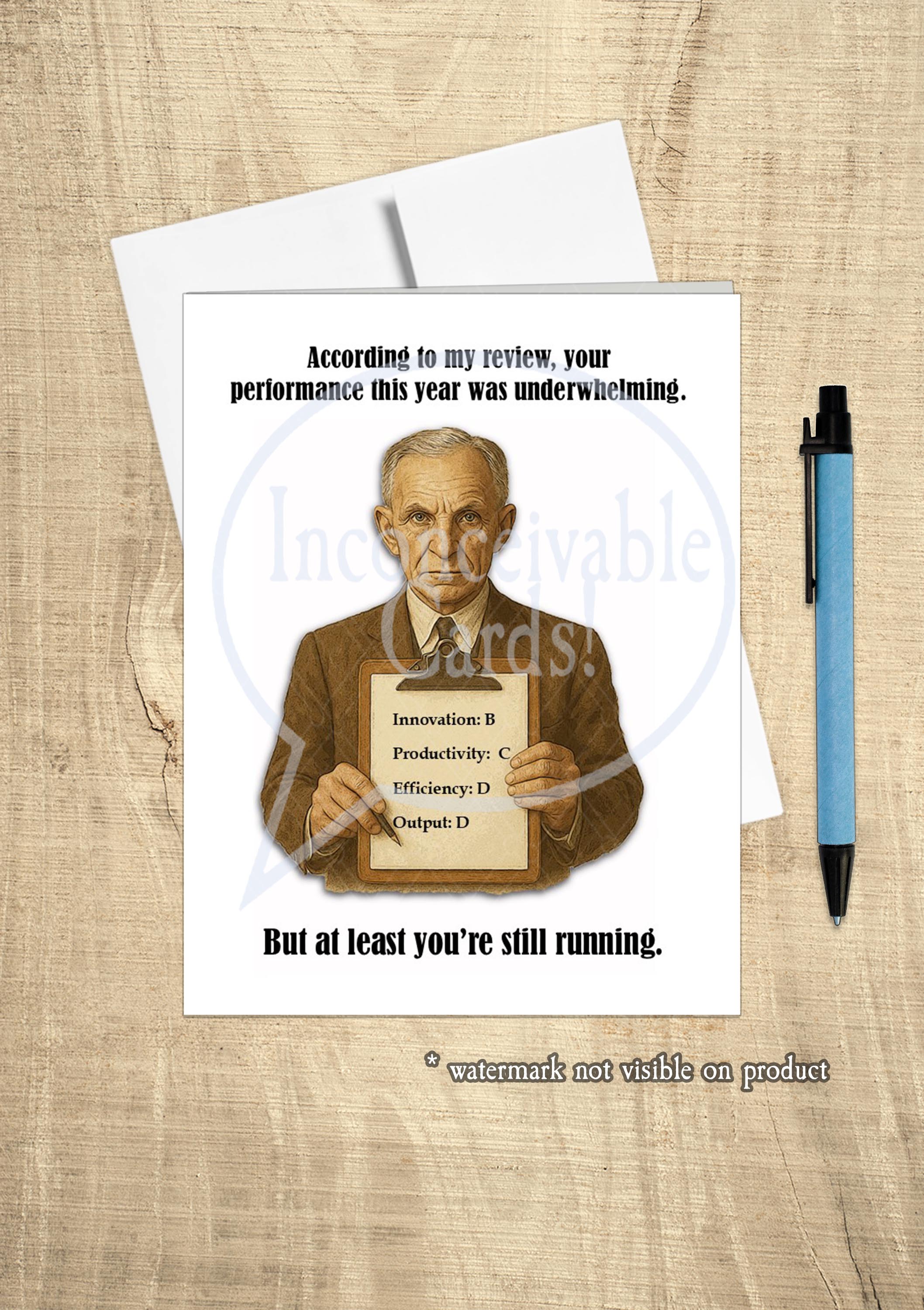 Celebrate another trip around the sun with the kind of encouragement only a clipboard-wielding disappointment in human form can provide. This end-of-year card delivers a brutal performance review—because what says "congrats" quite like being reminded your efficiency is a “D” but hey, you’re still functioning.