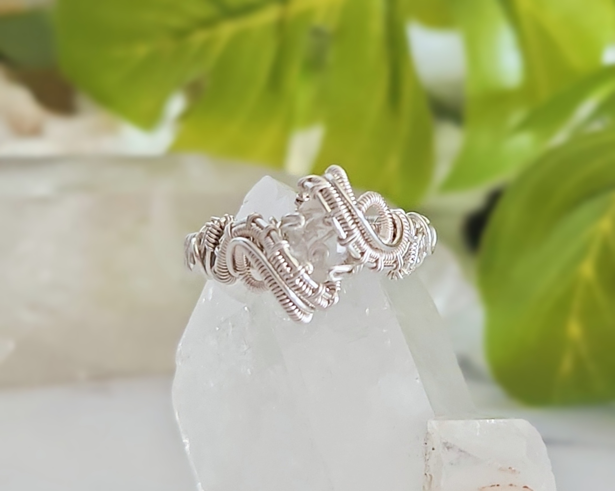 This ring is made from Sterling Silver wire and hosts a Herkimer Diamond in the center.