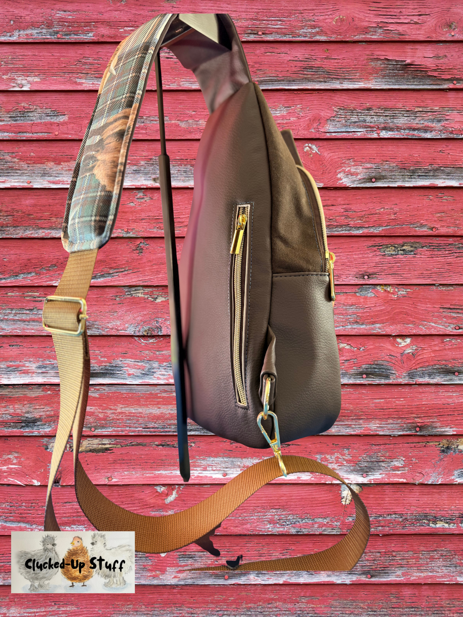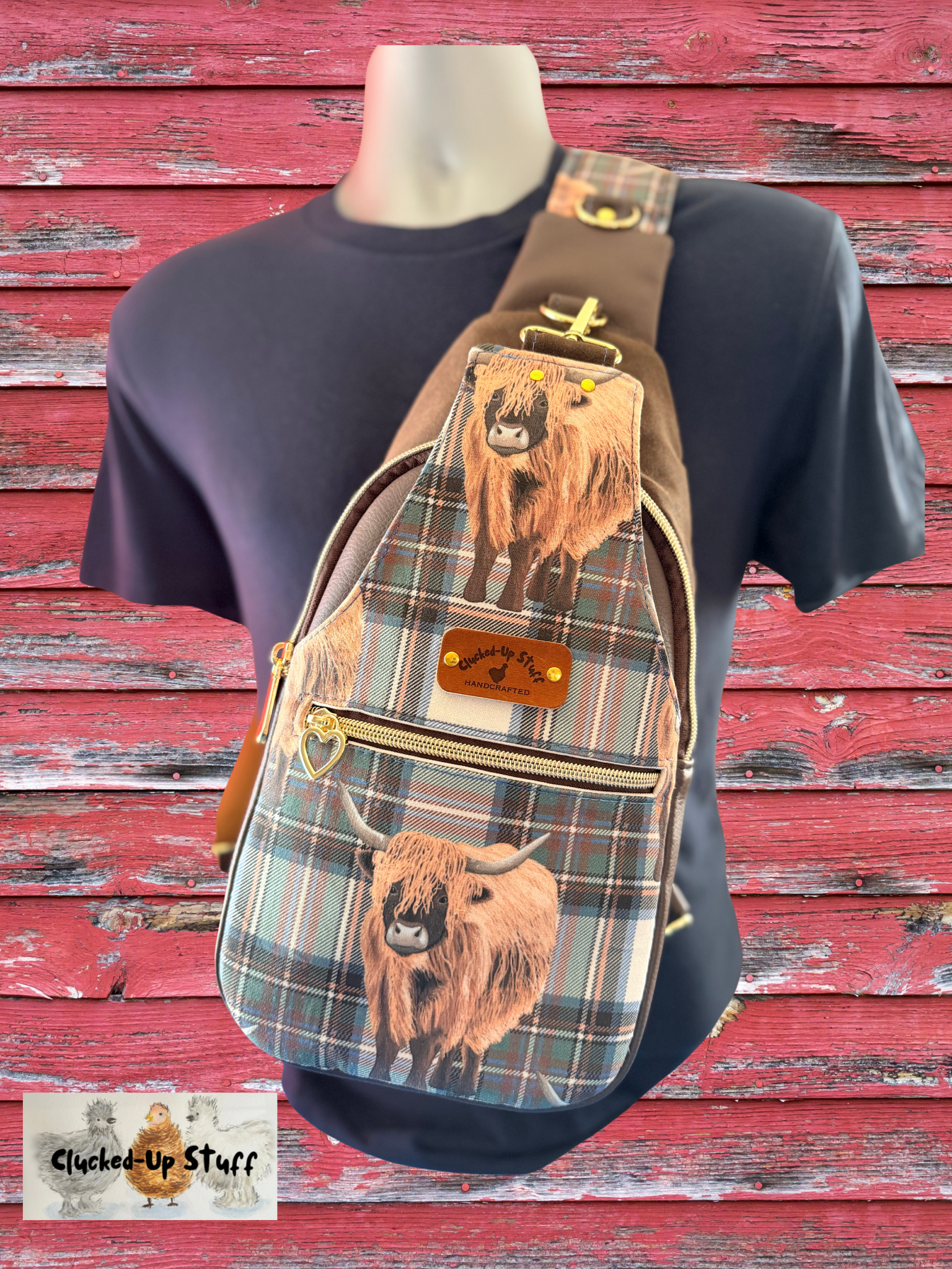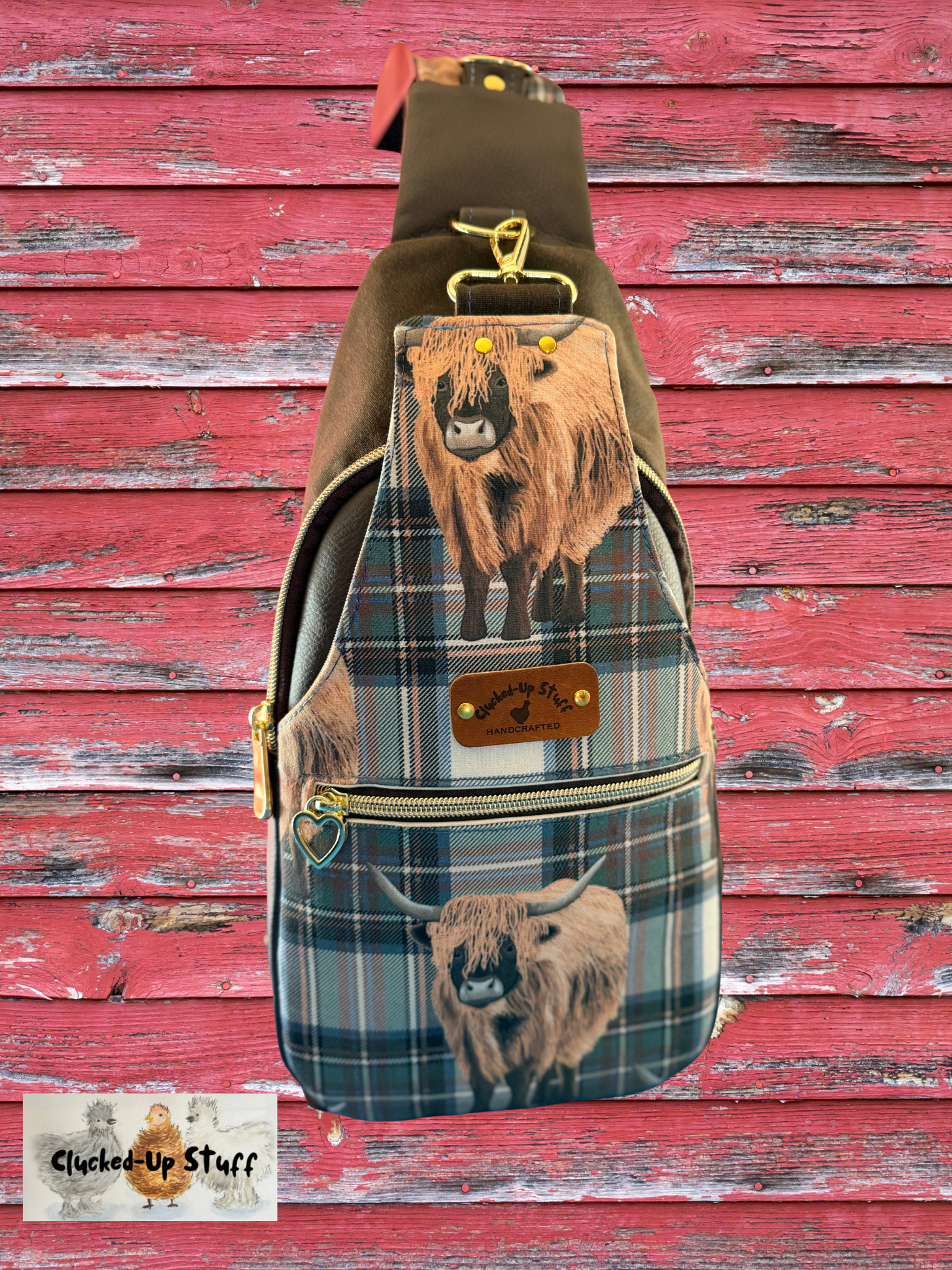 Carry a little rustic charm wherever you go with this handcrafted Highland Cow sling bag. Designed for both style and durability, this bag features a gorgeous cotton-linen canvas printed with Highland cows, paired with rich waxed canvas and buttery faux leather accents. The result is a unique, nature-inspired bag that’s as functional as it is eye-catching.