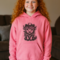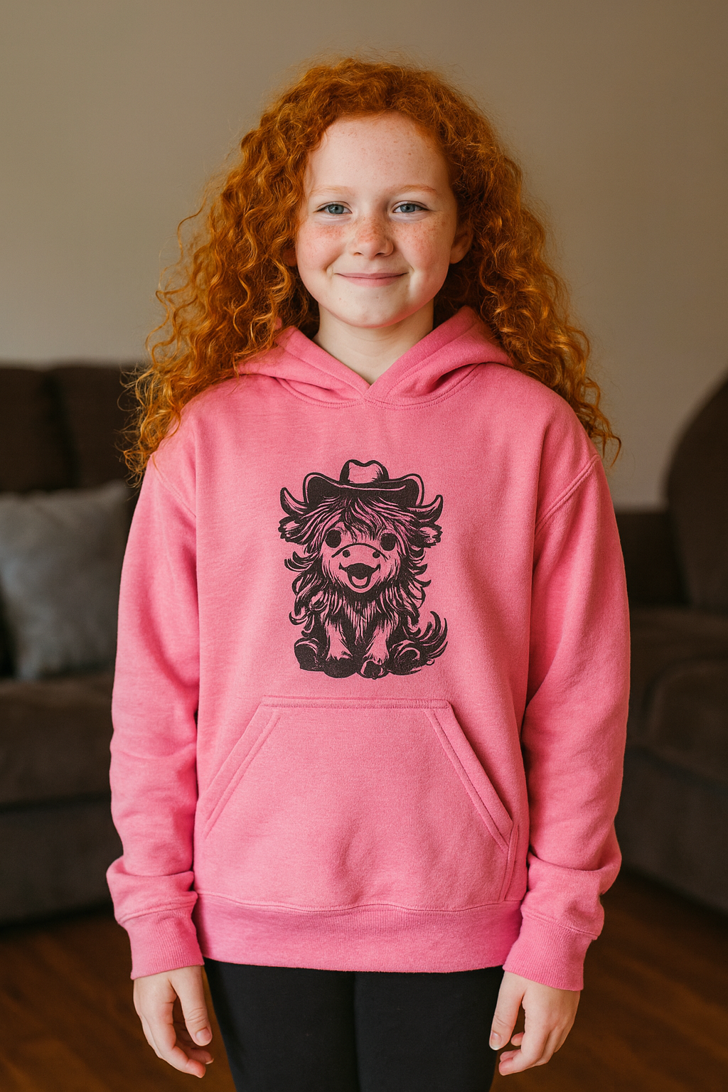 Brighten up your child's wardrobe with this charming pink hoodie, made from a cozy cotton/poly blend. It features an adorable embroidered design of a Highland Cow wearing a hat on the front.
