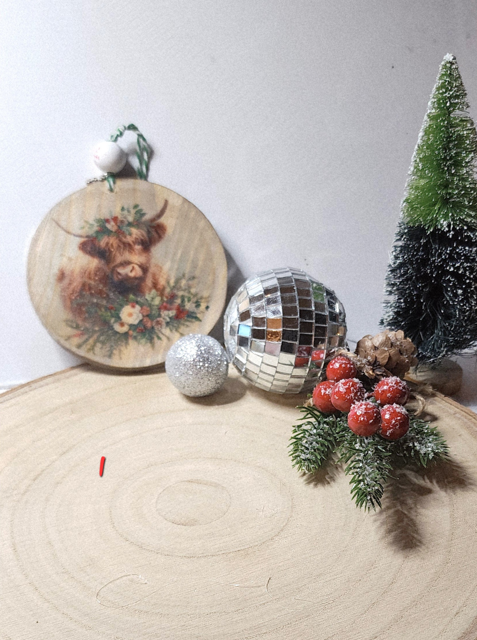 Bring a touch of timeless holiday charm to your home with these handcrafted Highland Holiday Ornaments. Each piece features a circular vintage-style image of a Highland cow on a 4" wood circle, with a wooden bead a 2025 charm and a bakers twine loop hanger.