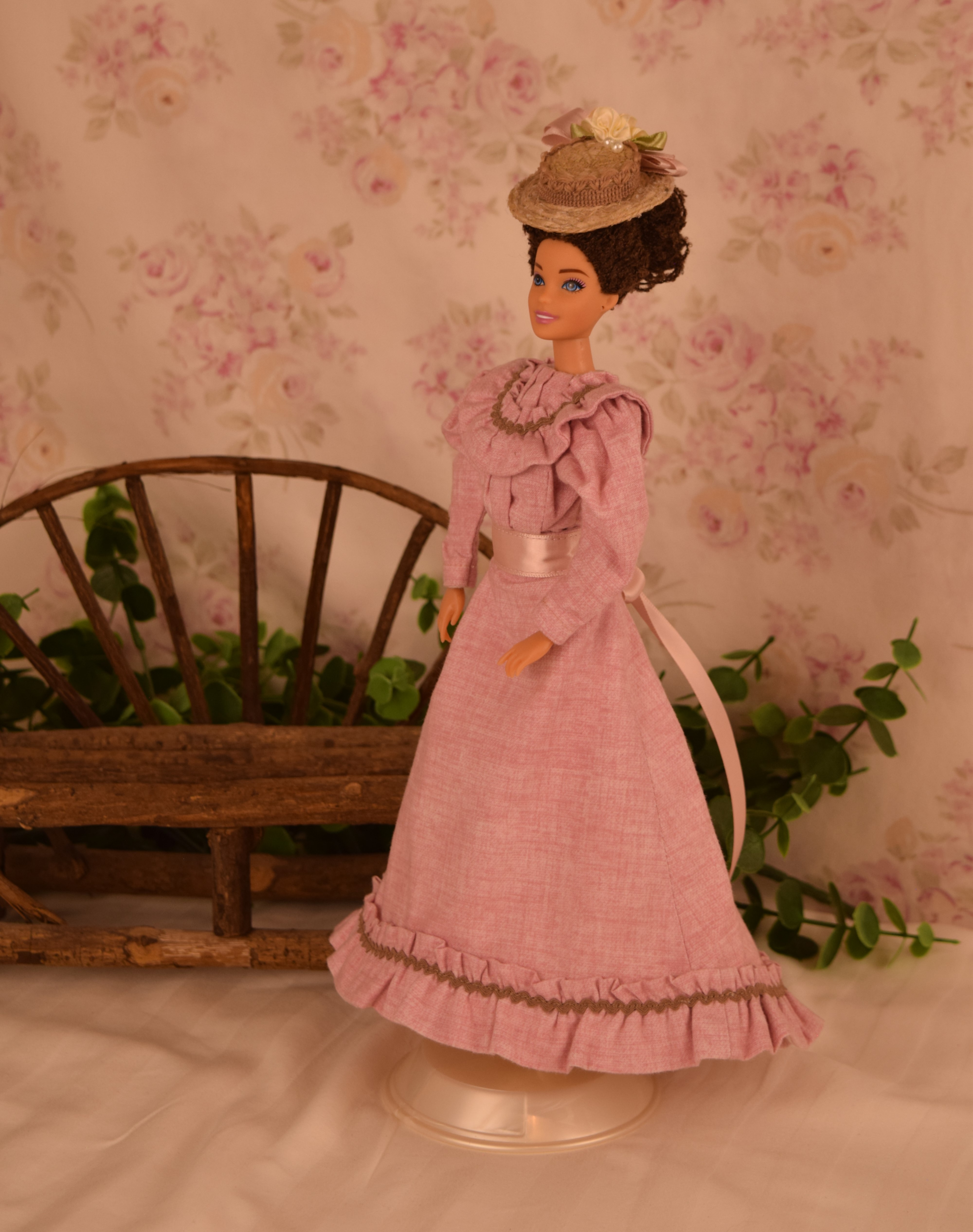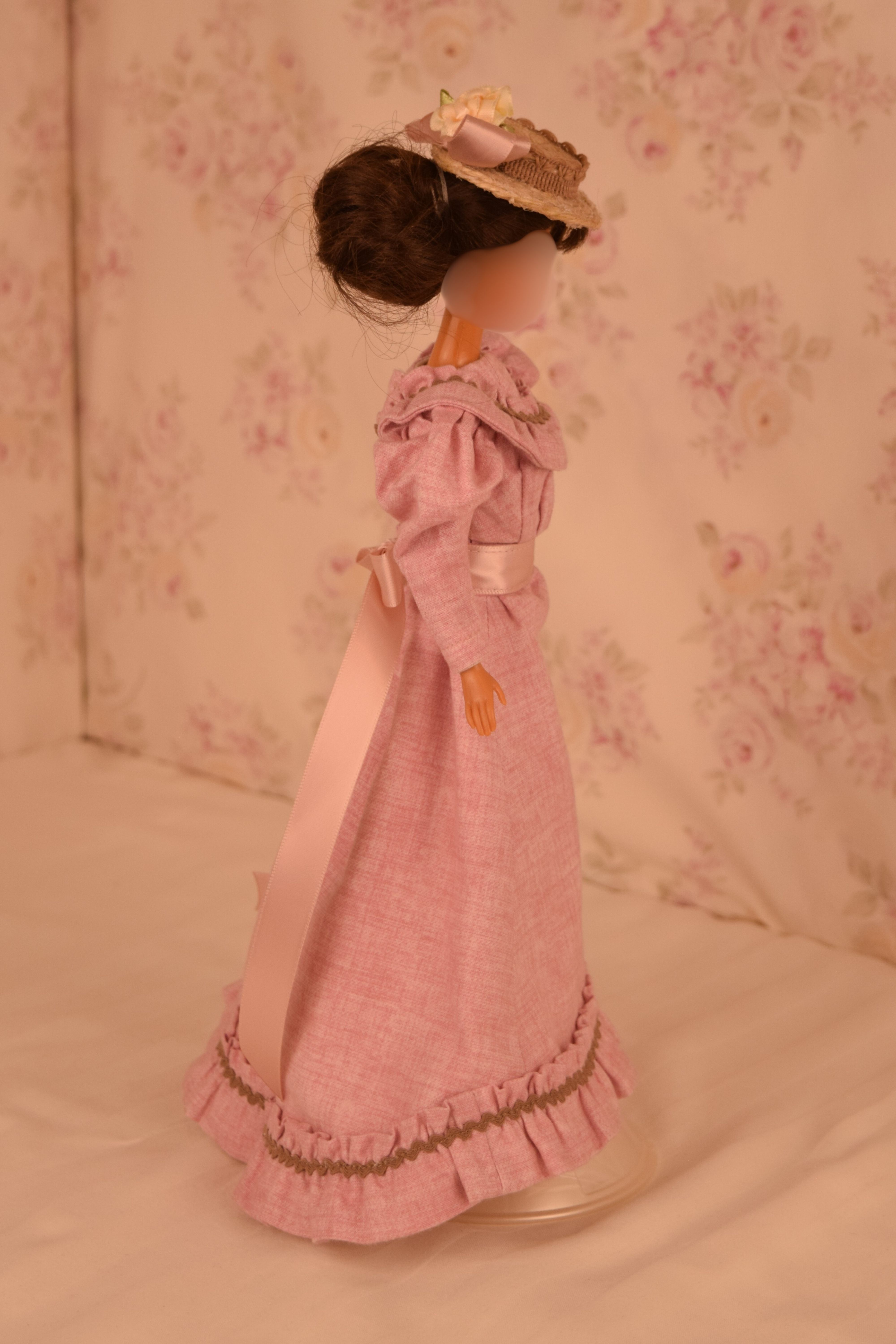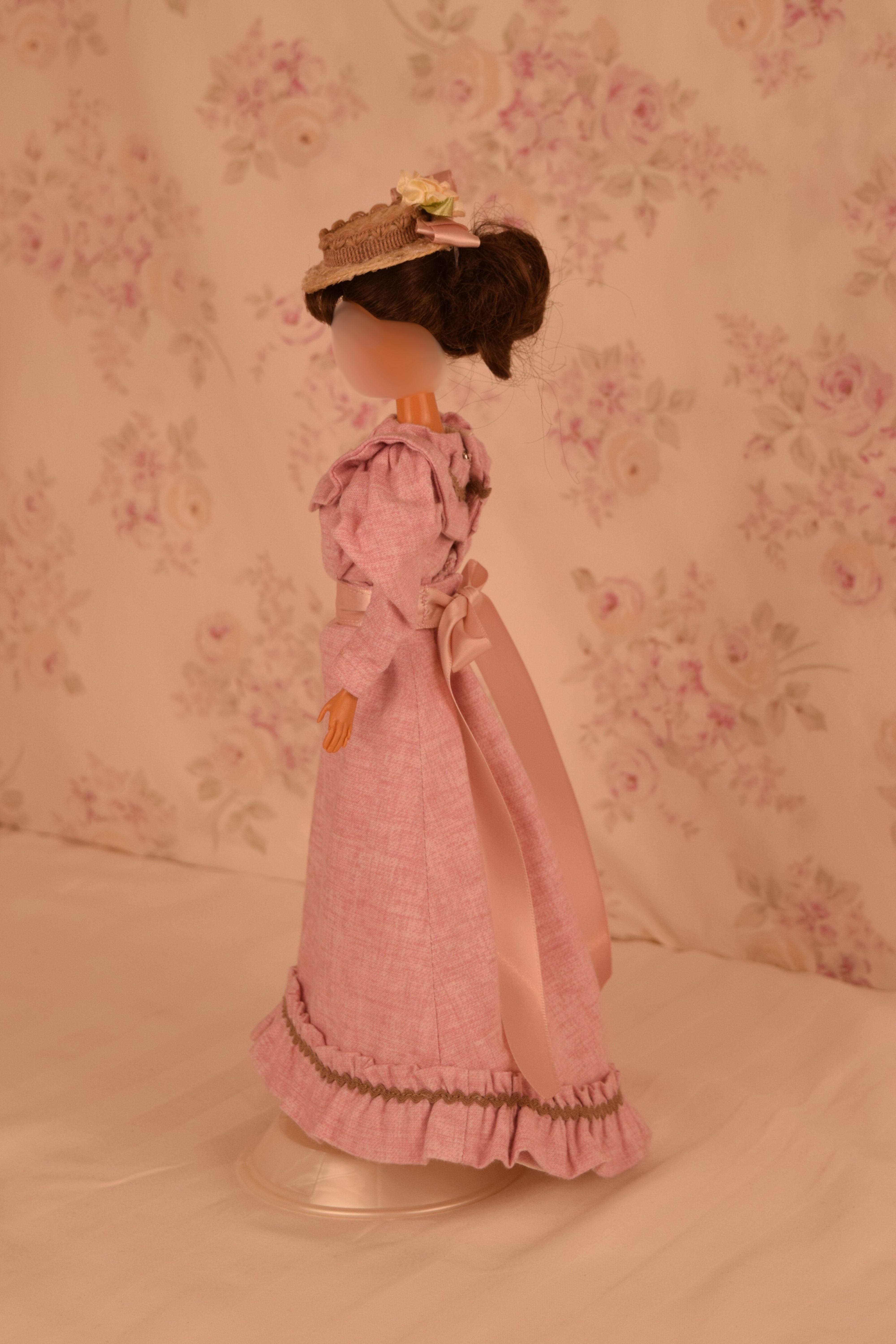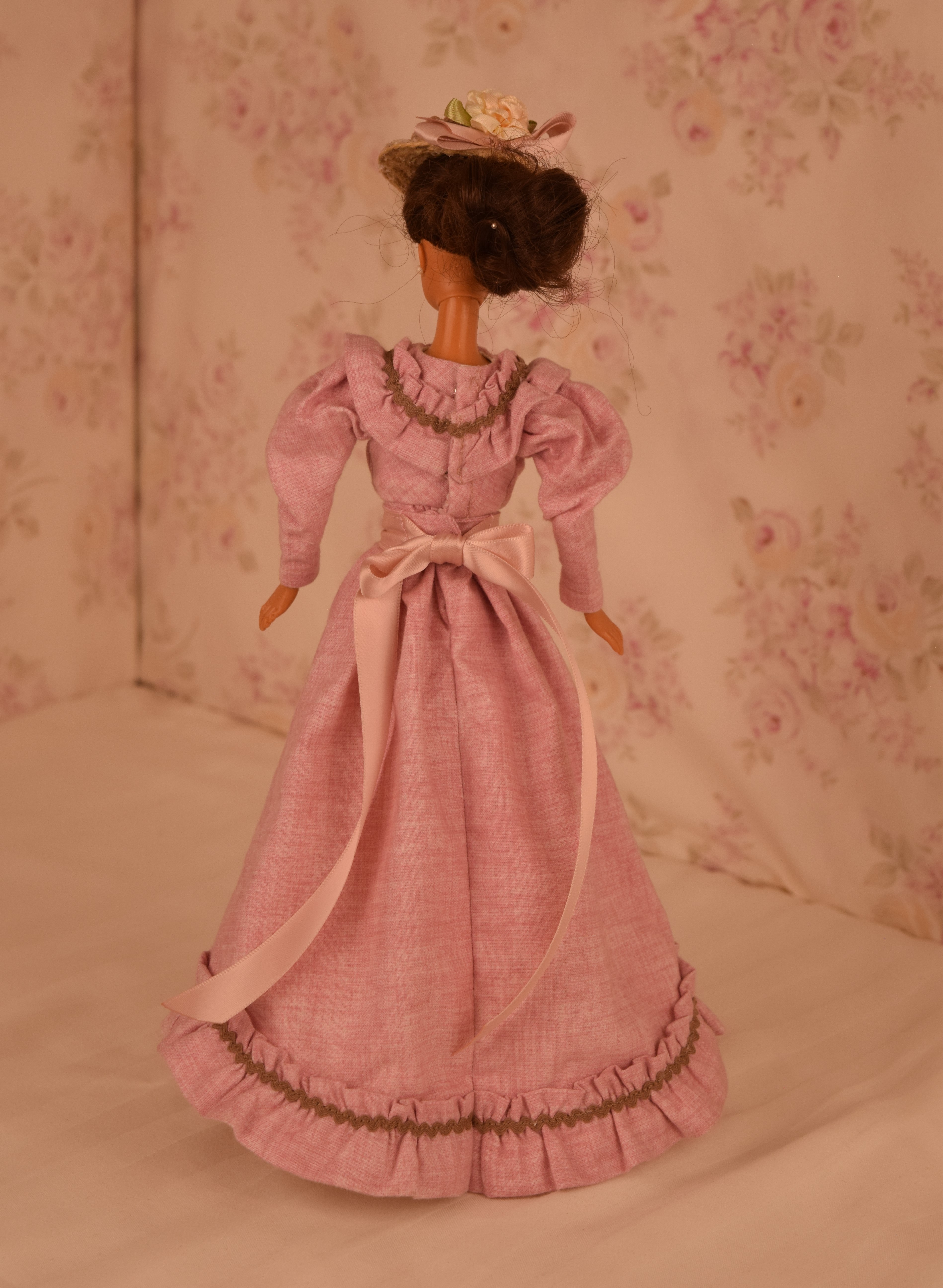 The dress is made of pink cotton fabric that has a tone on tone woven print. The lined bodice is gathered in front and has a high round neckline with a U shaped yoke and ruffle. Brown ric rac following the yoke finishes the bodice's look, wrapping all the way to the back. The long sleeves are a moderate leg o' mutton style. The lined skirt is done in the typical A-line style of the 1890's and has a very slight train. Dress closes with metal snaps. A faux pink sash comes with the dress and sits below the bodice to create the up and coming "pouter pigeon" look that would be all the rage in a few years. A moderate ruffle edges the skirt's hem and is adorned with more of the brown ric rac.