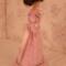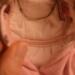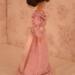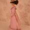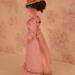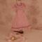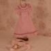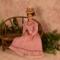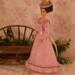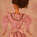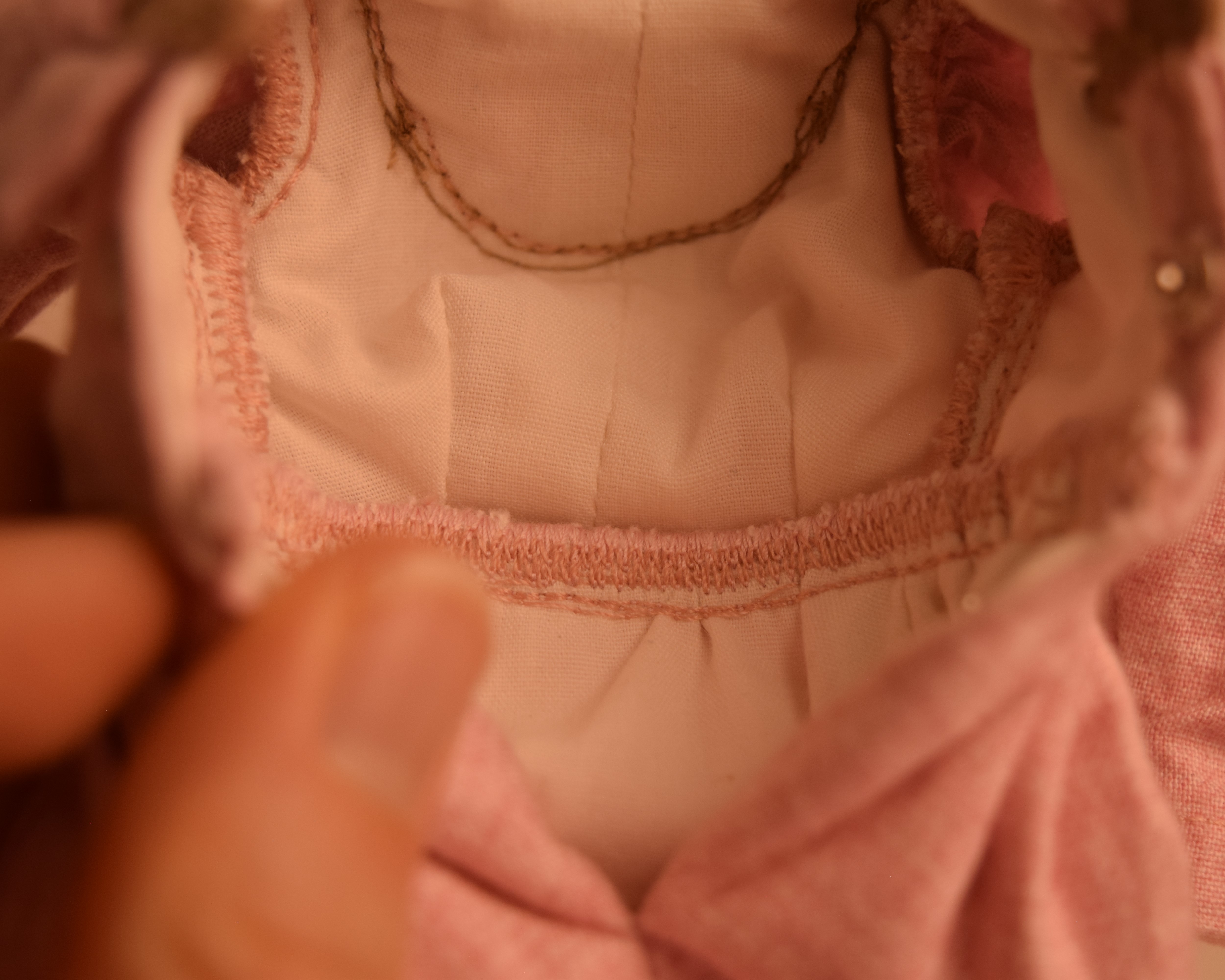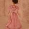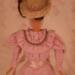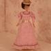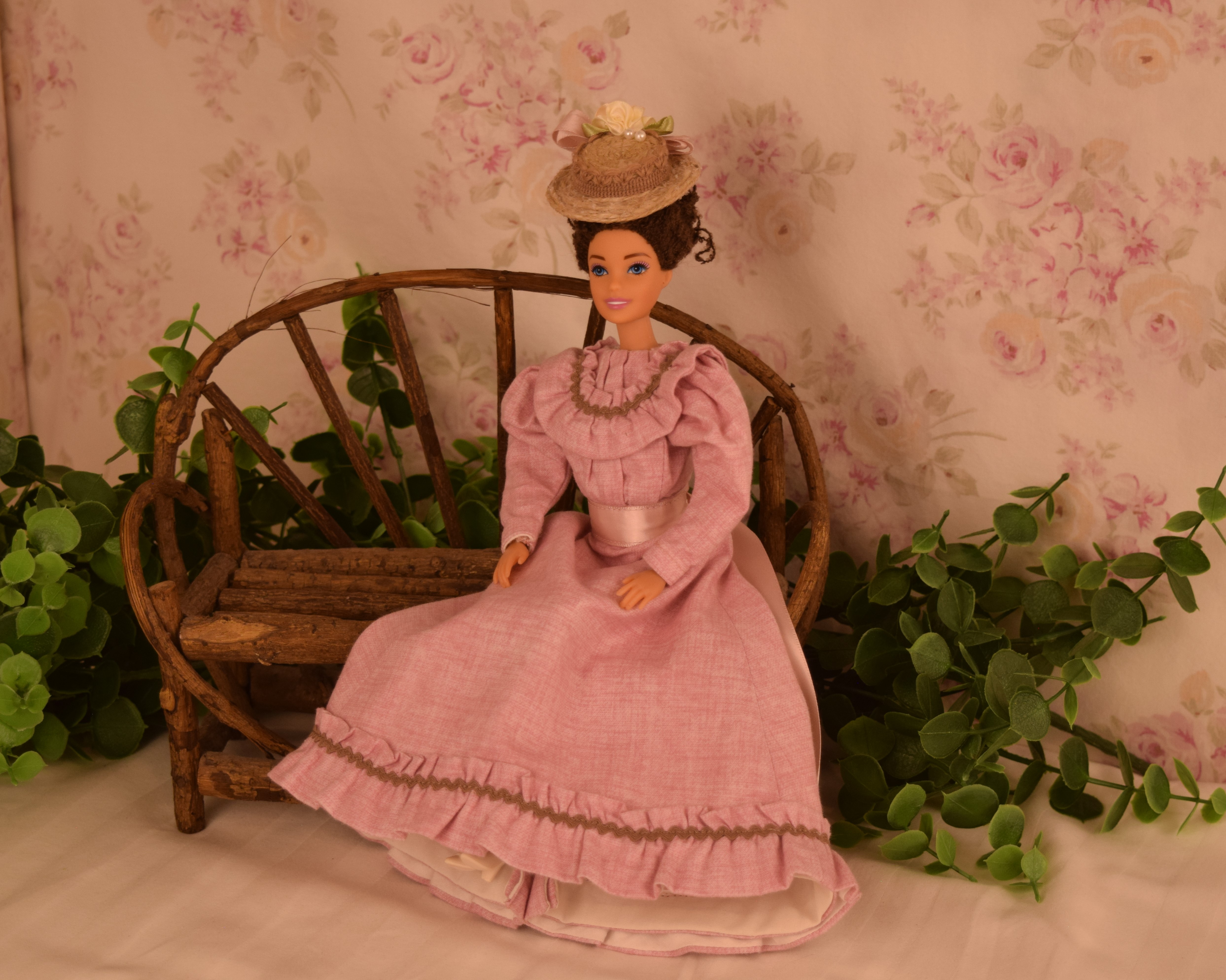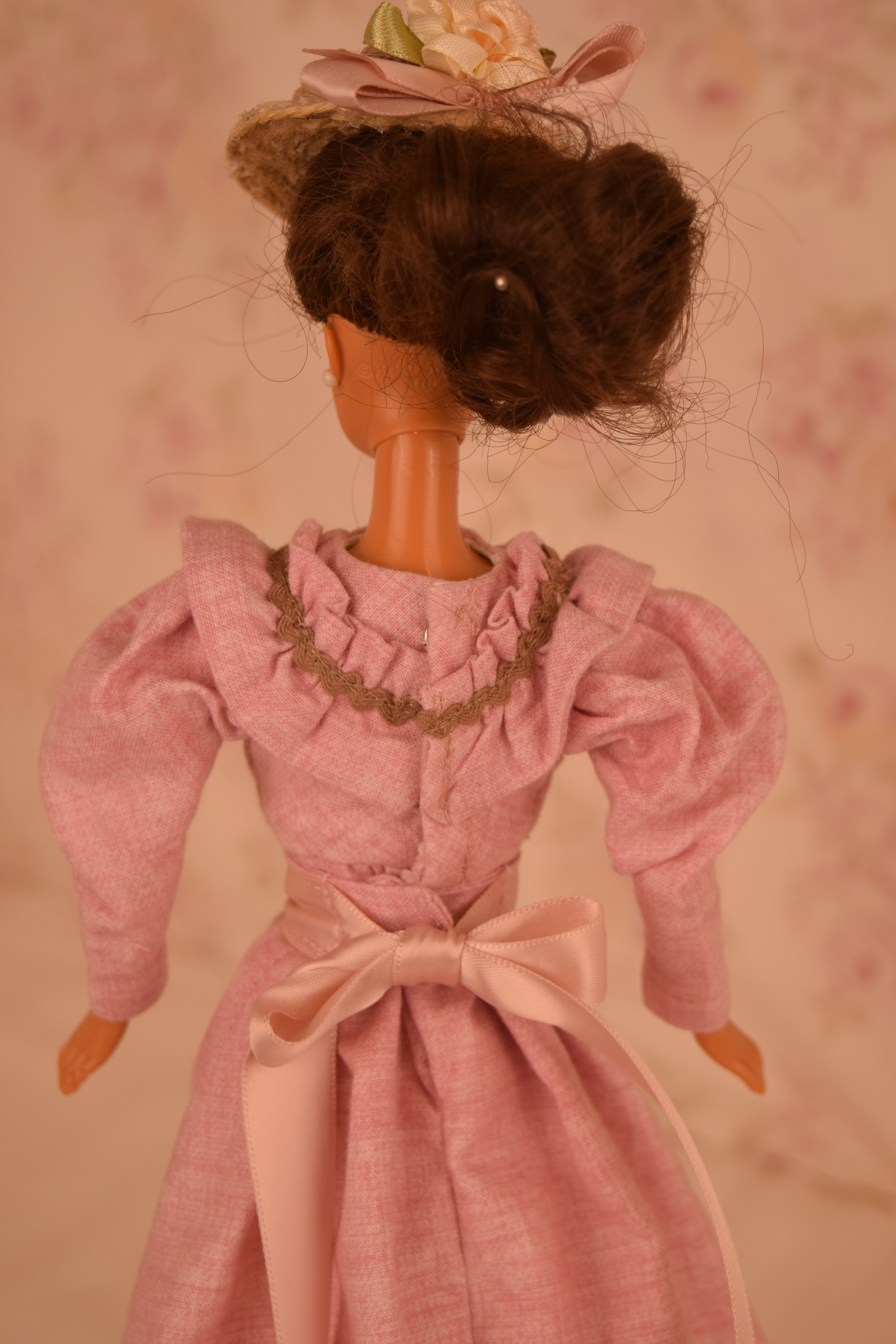 The dress is made of pink cotton fabric that has a tone on tone woven print. The lined bodice is gathered in front and has a high round neckline with a U shaped yoke and ruffle. Brown ric rac following the yoke finishes the bodice's look, wrapping all the way to the back. The long sleeves are a moderate leg o' mutton style. The lined skirt is done in the typical A-line style of the 1890's and has a very slight train. Dress closes with metal snaps. A faux pink sash comes with the dress and sits below the bodice to create the up and coming "pouter pigeon" look that would be all the rage in a few years. A moderate ruffle edges the skirt's hem and is adorned with more of the brown ric rac.