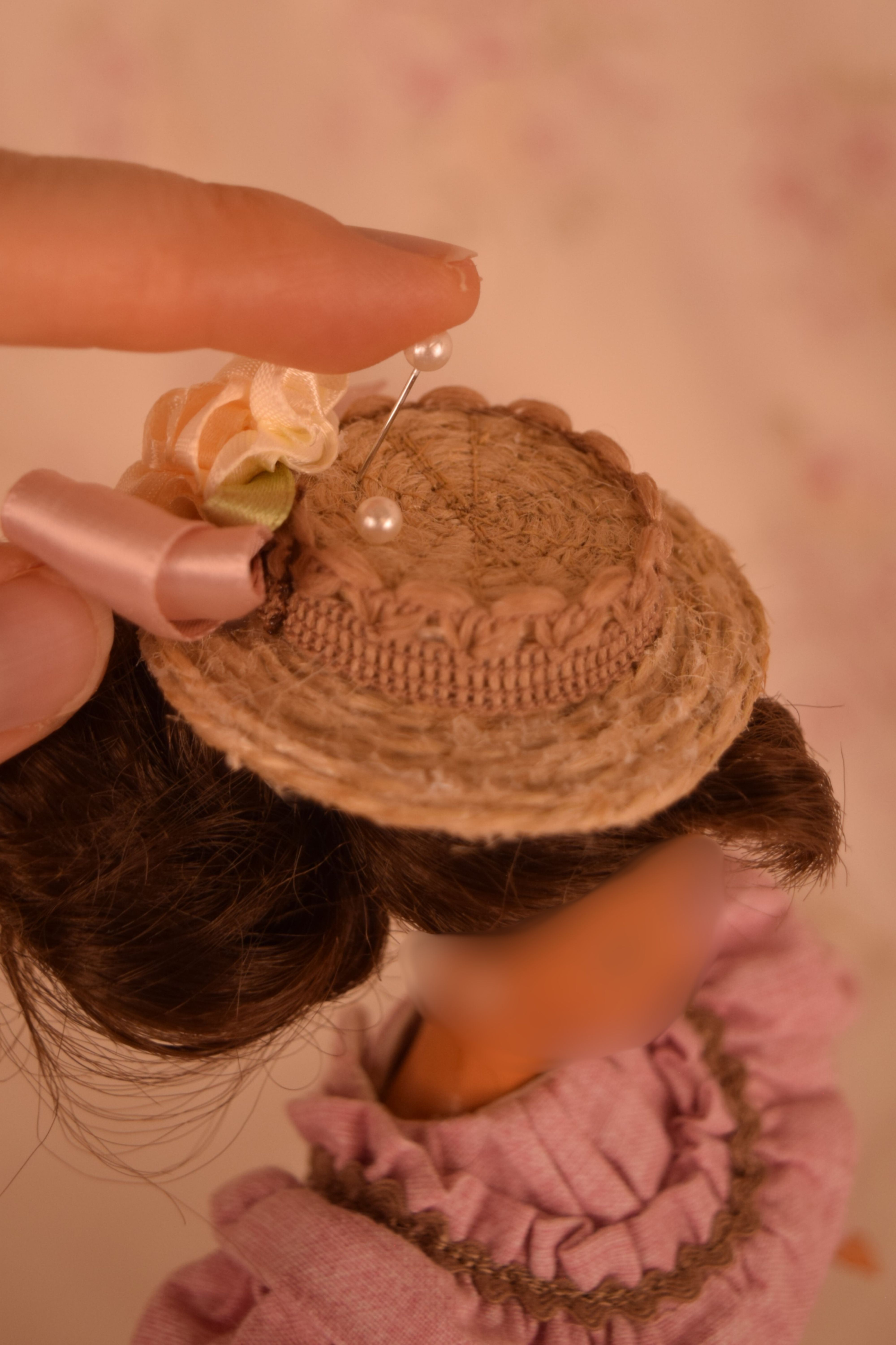 The hat is a straw boater made from jute. Brown trim encircles the crown and a cluster of a pale pink bow and large cream rosette nestled in back completes the look.