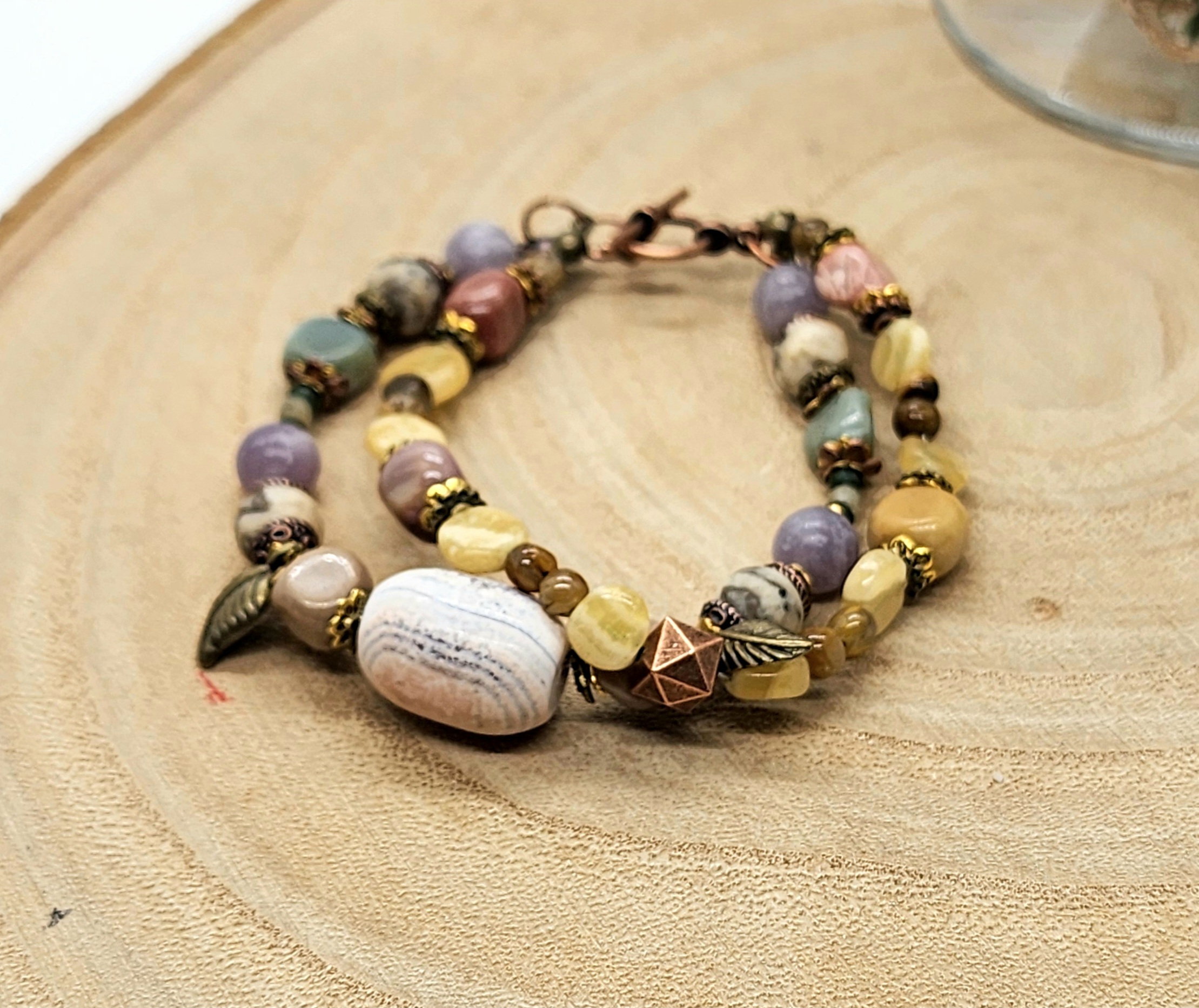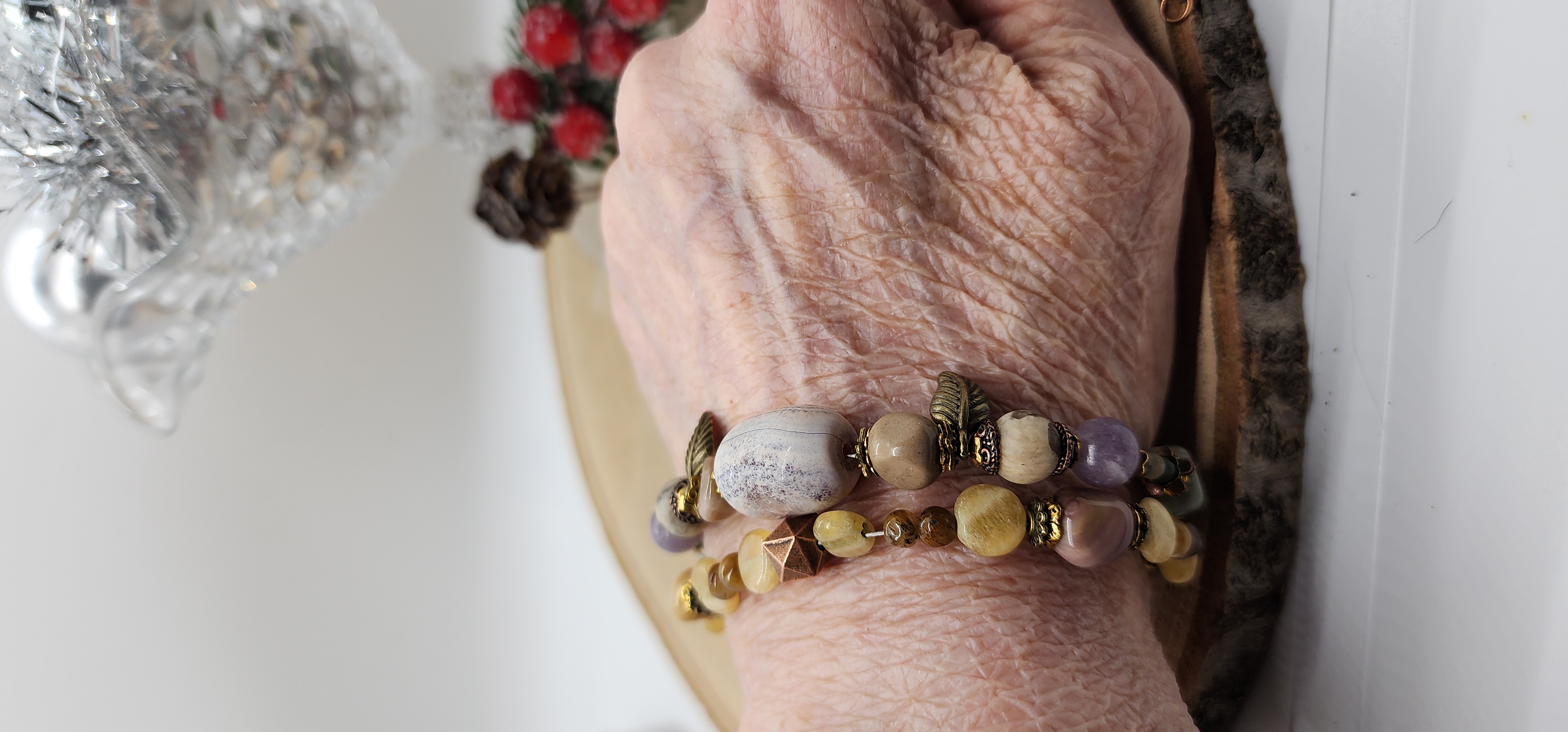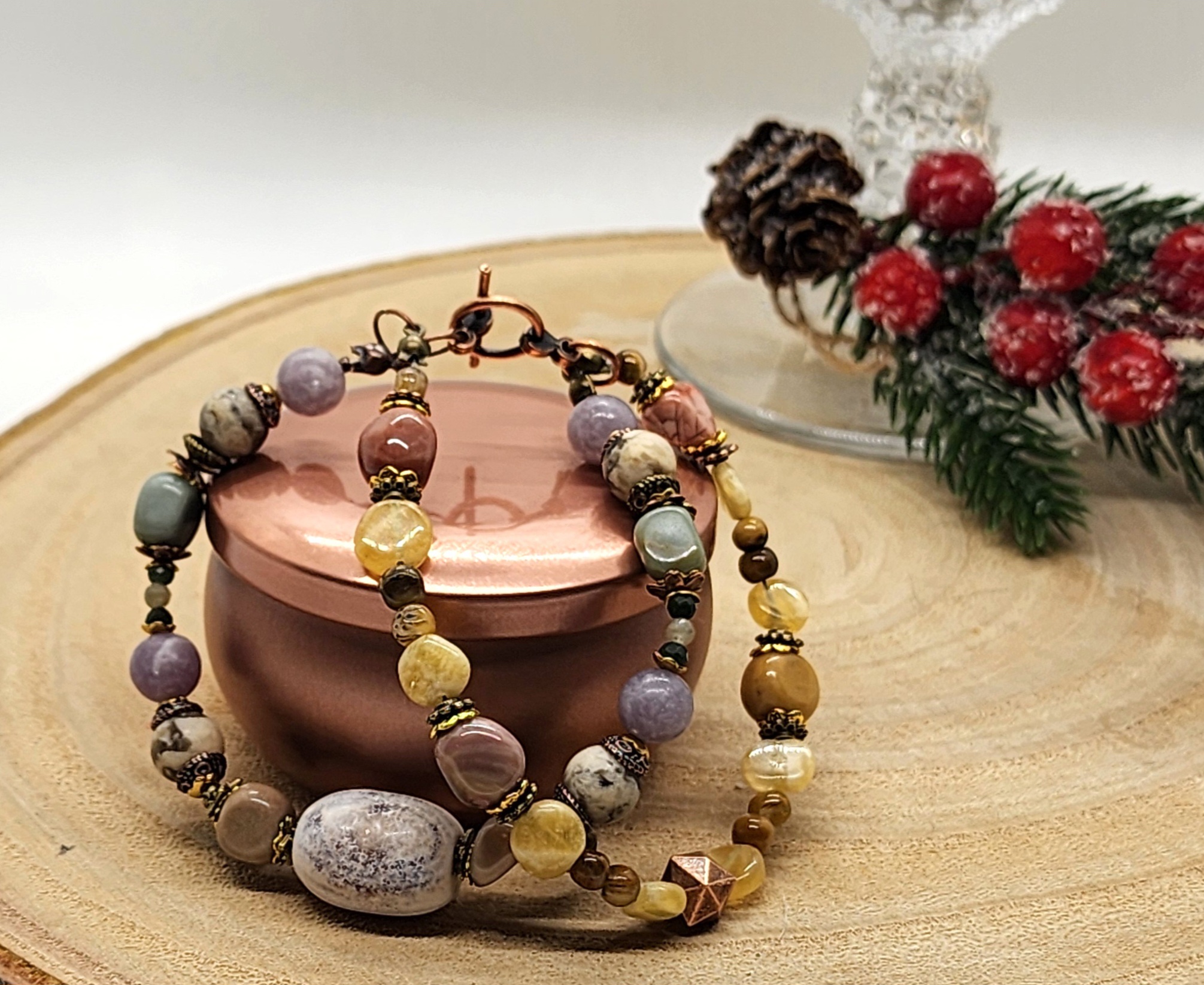 Celebrate the season with this handcrafted gemstone double-strand bracelet, a perfect blend of earthy elegance and festive charm. This bracelet features a curated mix of polished natural stones, Mookaite Jasper, and creamy dyed fire agate agate—accented with antique-style metal spacers for a touch of vintage flair.